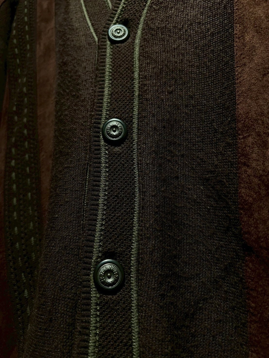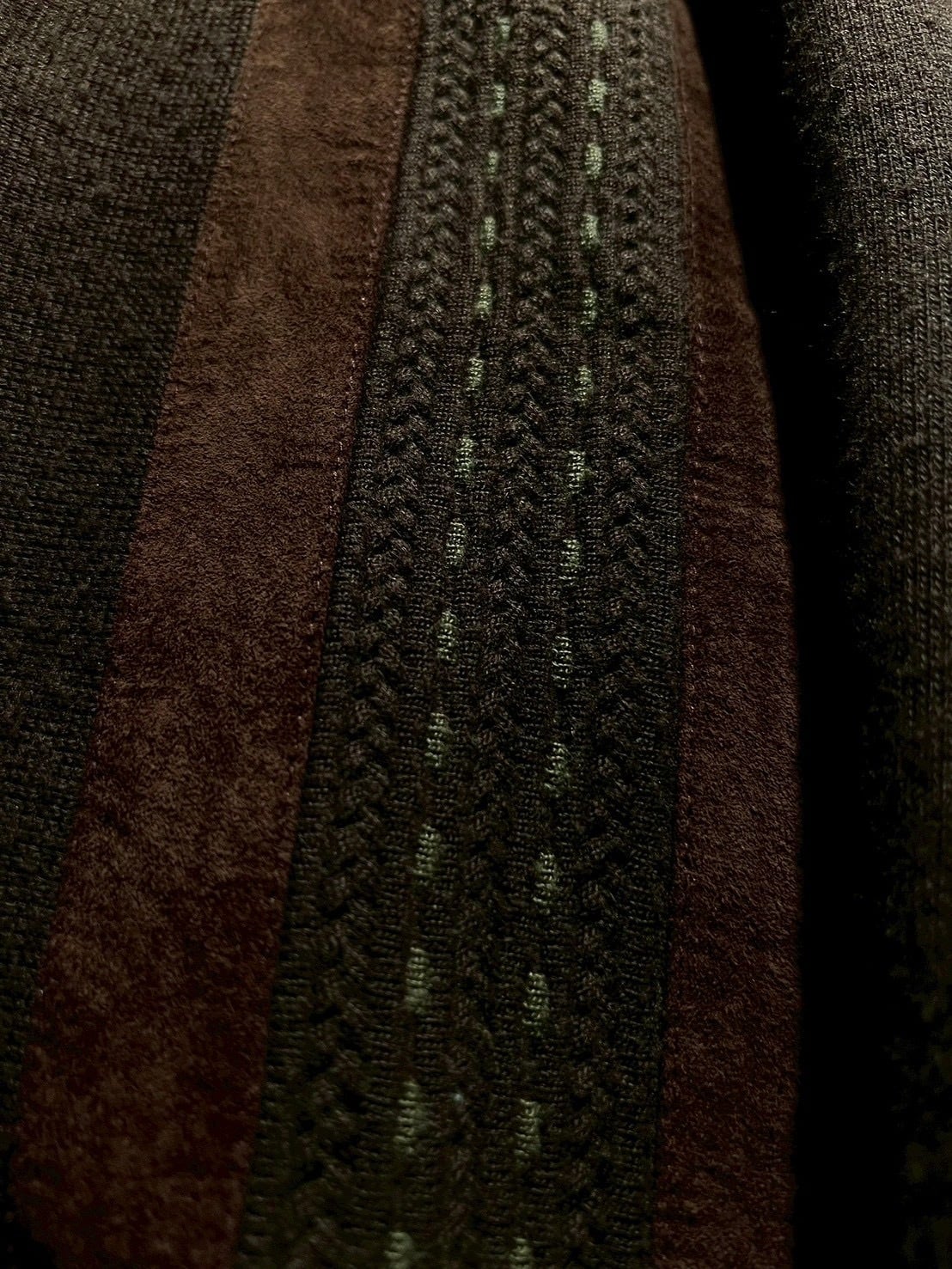 肩口や前立てにはしっとりとした質感のスエードがあしらわれ、ニットの柔らかさに上品なアクセントをプラス。まるでレザーとニットが共鳴し合うかのような存在感を放っています。