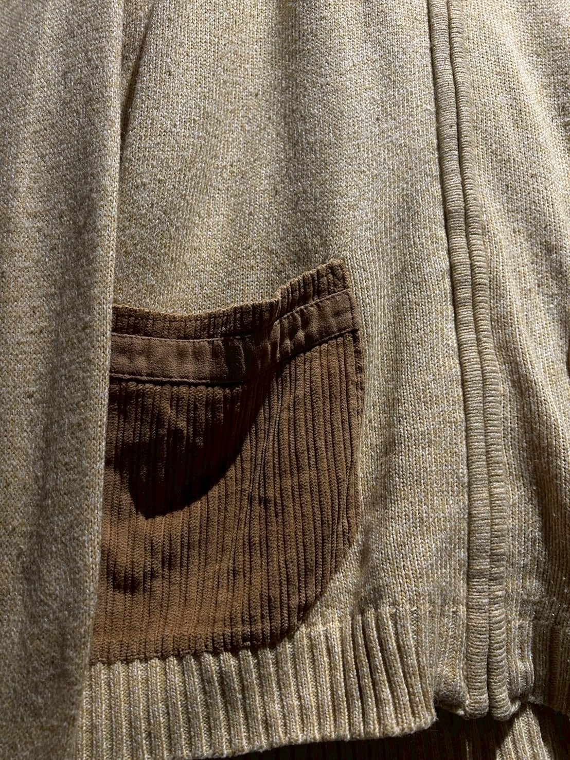 襟元からショルダー、フロントポケットにかけて配されたコーデュロイ切り替えがデザインのアクセントとなり、異素材のコントラストが立体感を演出しています。