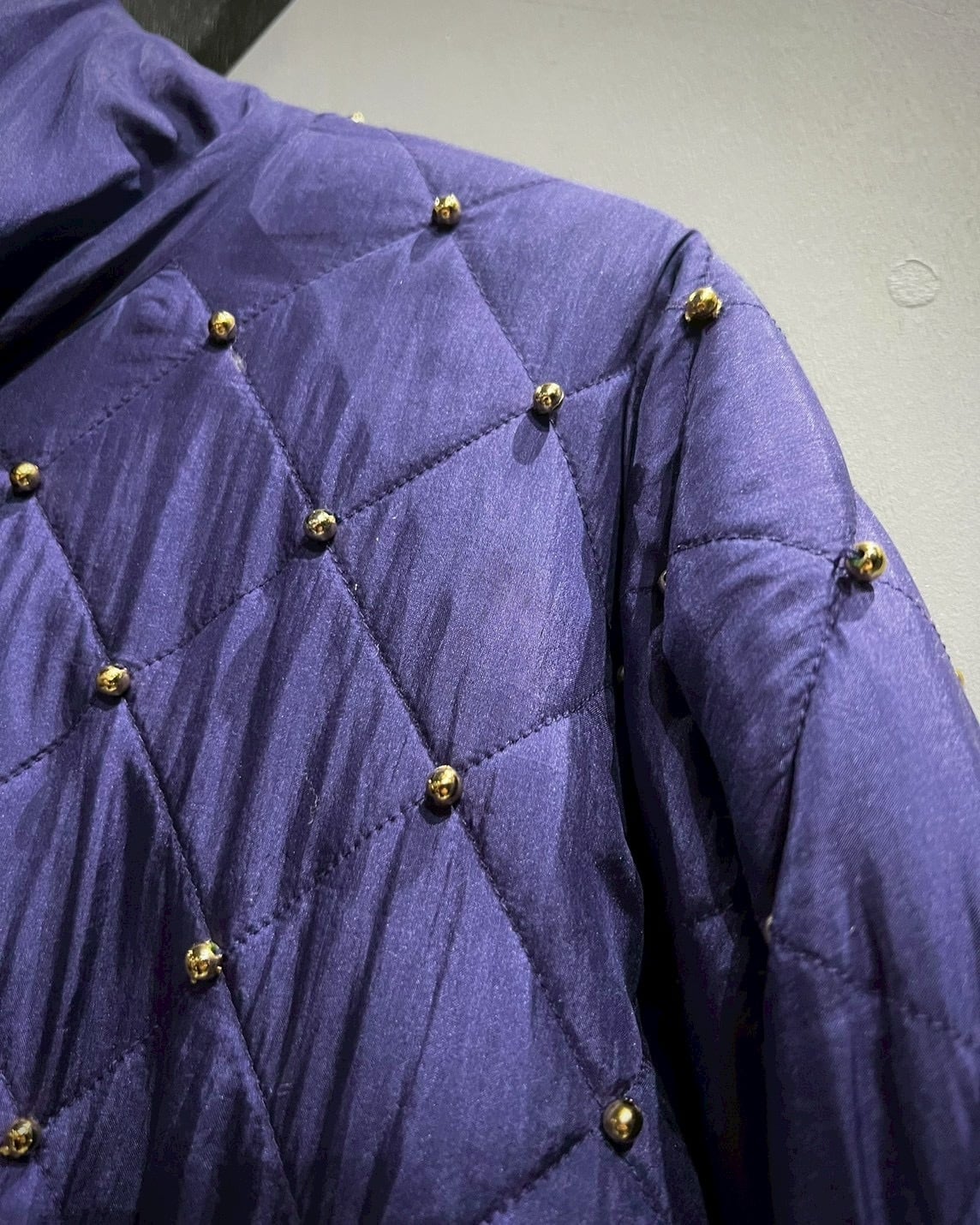 ボディ全体に走る光沢感あるシルク素材は、角度によって奥行きのある表情を見せ、さらにショルダーからヨークにかけて施されたキルティングステッチには、無数のメタルスタッズを散りばめることで、気品とエッジを同時に纏っています。