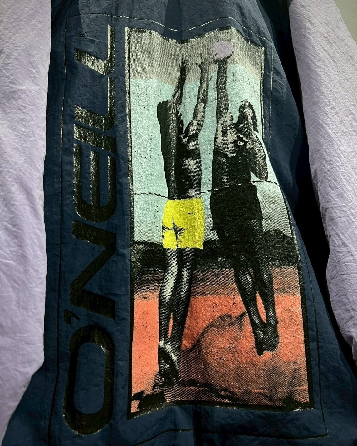 ブランドのルーツを物語るサーフモチーフのワッペン、さらに背面にはビーチバレーをリアルな陰影で描かれたフォトプリントを大判で配し、まさにカルチャーを融合させた1着となっています。