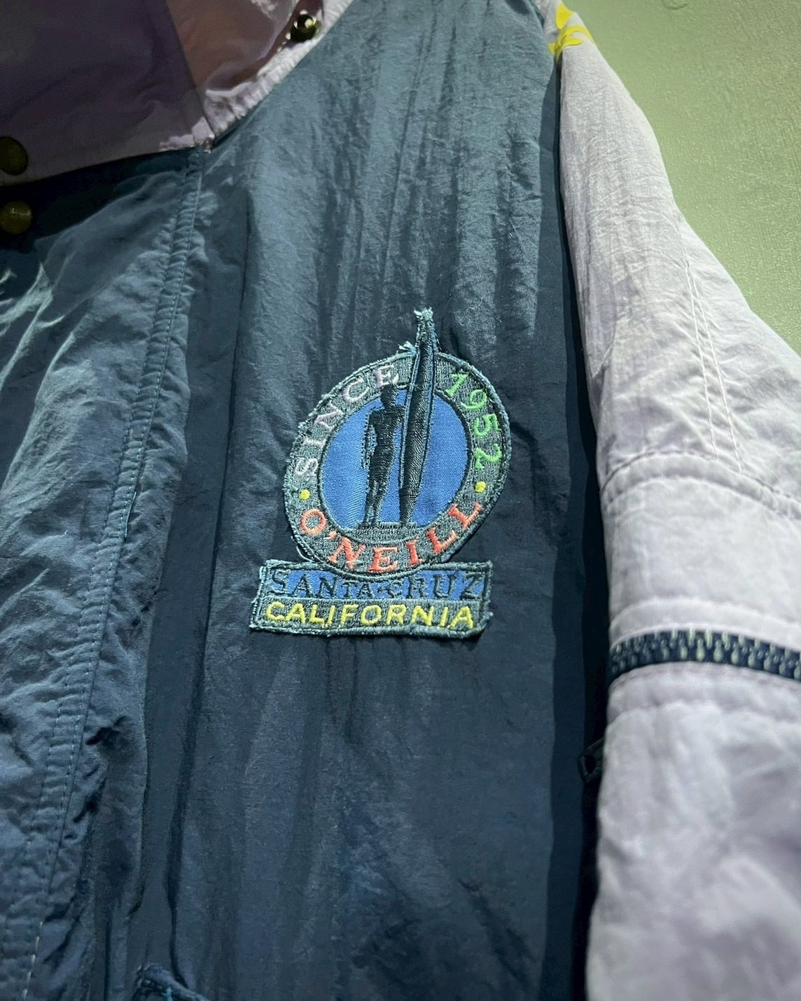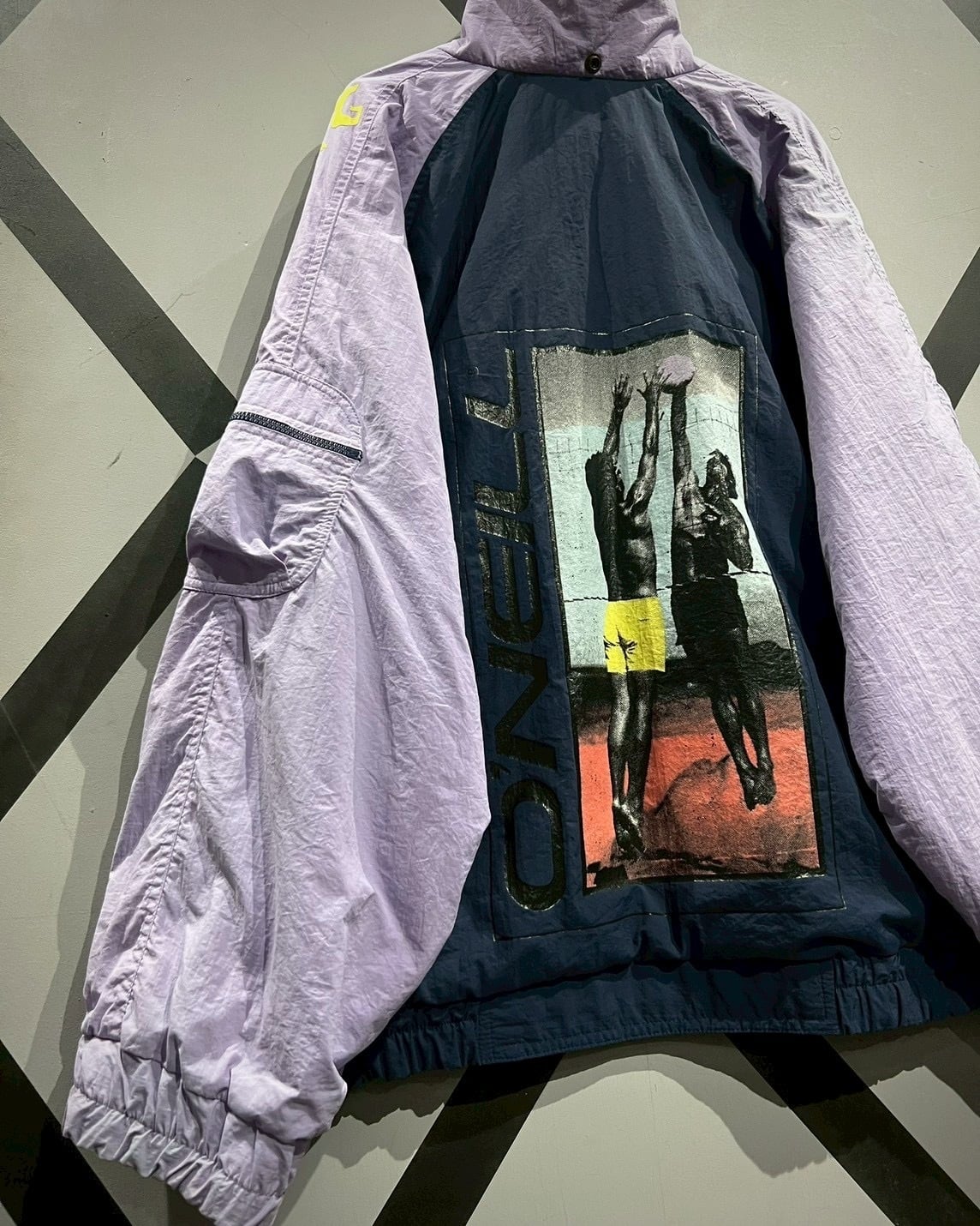 ネイビーボディを軸に、パステルなパープルとイエローを大胆に切り替えた90’sらしい鮮烈なカラーリングで仕上げられたナイロンジャケット。