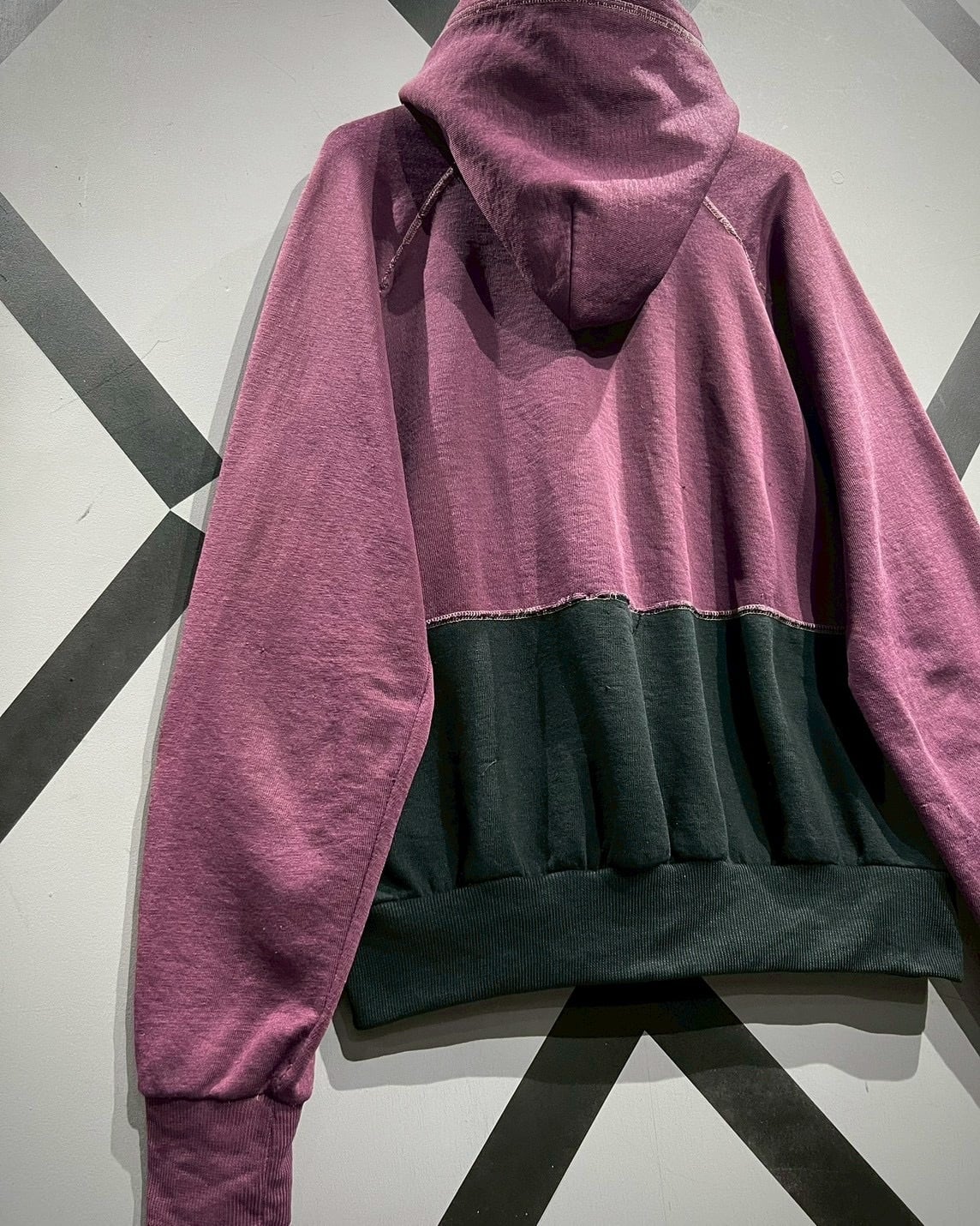 ボディは深みのあるパープルをベースに、裾やポケット部分をブラックで切り替えたツートーン仕様。フロントのトレフォイルロゴが時代性を象徴し、古着好きの心がくすぐられます。