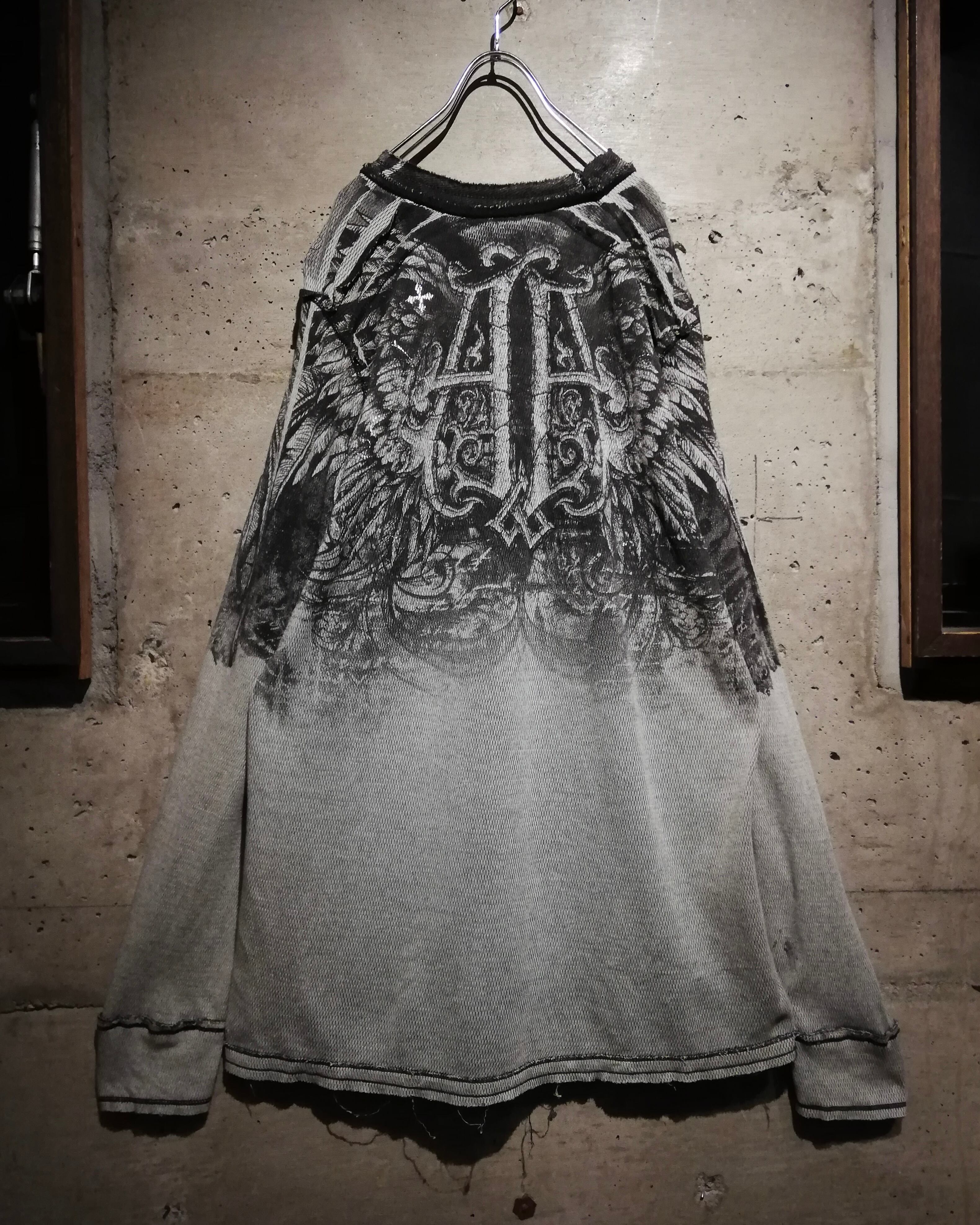 柔らかなサーマル生地を用いたボディは、フェードブラック×ホワイトのリバーシブル仕様。退廃的な色味と素材の風合いが雰囲気を醸し出しながらも、“Affliction”らしい迫力あるグラフィックが存分に落とし込まれています。