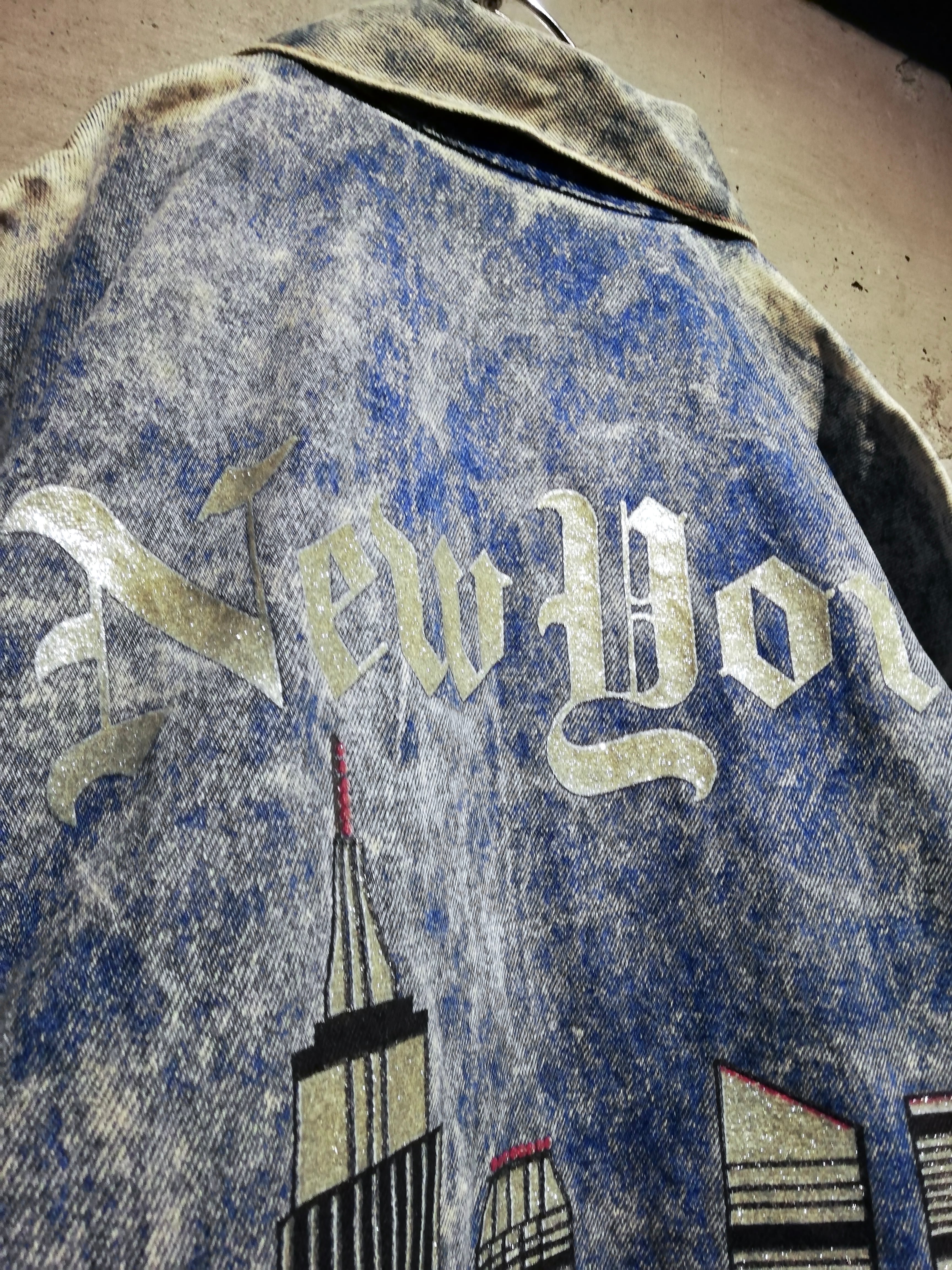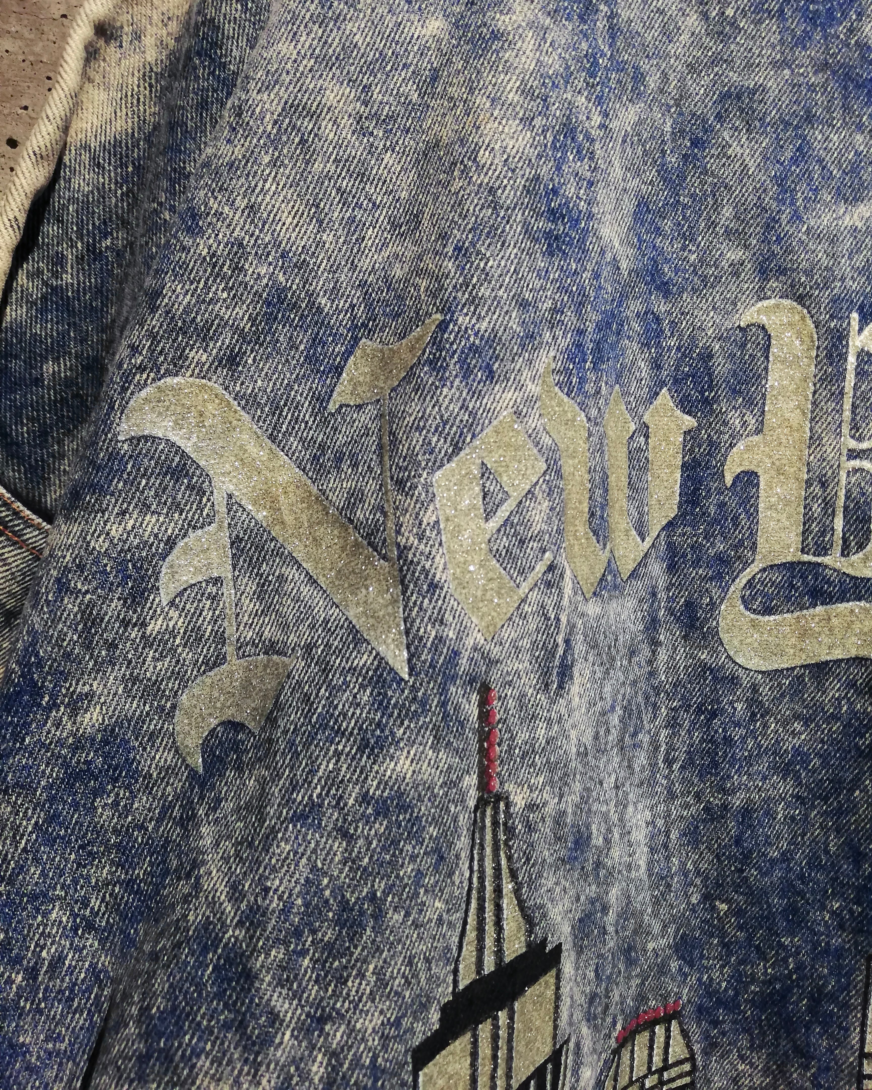 フロントは王道のトラッカージャケットを踏襲しながらも、バックスタイルに視線を奪われる1着。背面には「New York」のレタリングとともに街並みを描き出し、煌めきをグリッターを混ぜ込んだプリントで表現。光を浴びたときのラメ感がデニムのケミカルウォッシュと呼応し、アーティスティックかつ存在感を際立たせています。