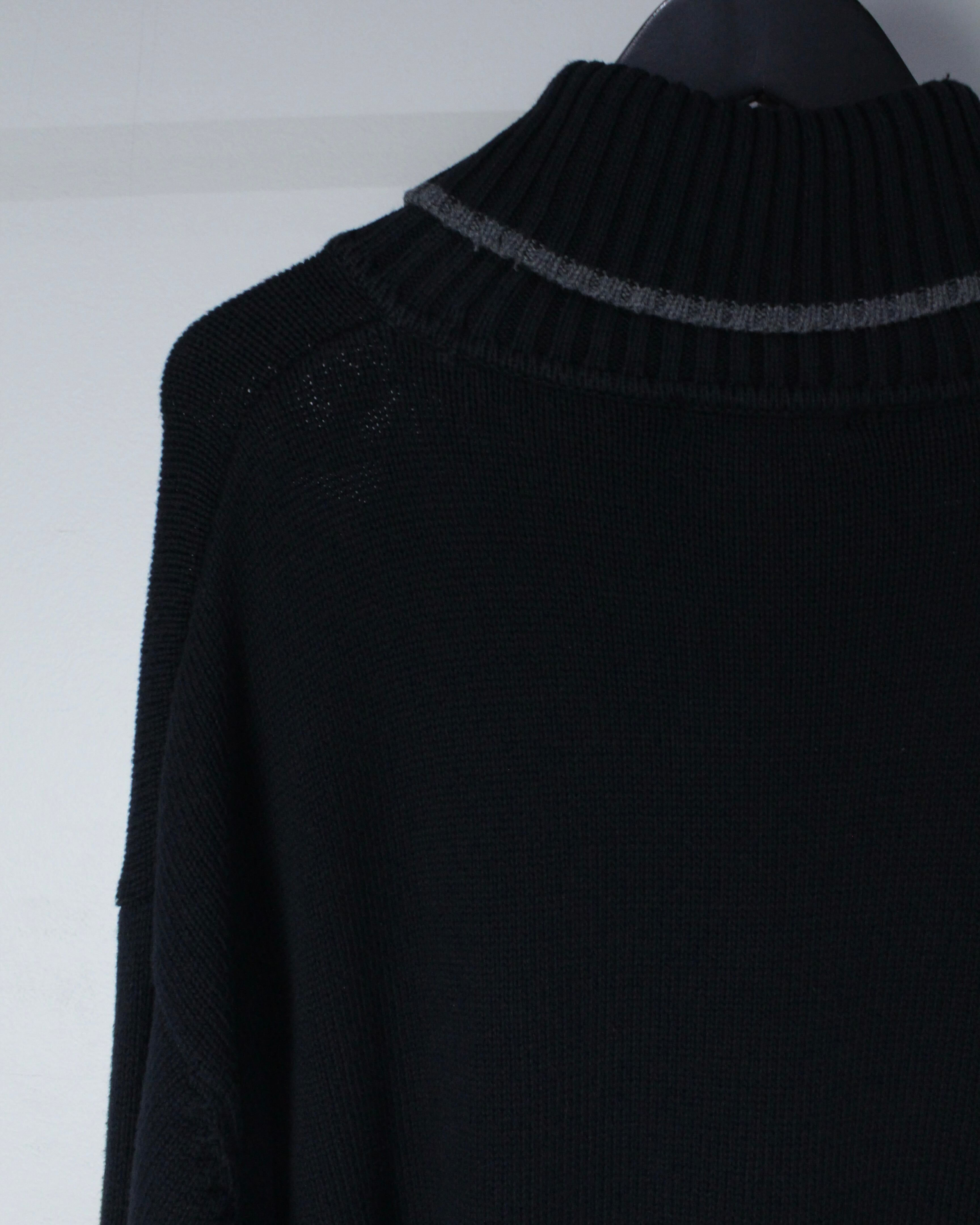 全体を深みのあるブラックトーンで統一しながらも、胸元から袖へと走る立体ラインとブランドロゴがアクセントにGIRBAUDらしい前衛的なパターンワークと実験的な切り替えが光ります。