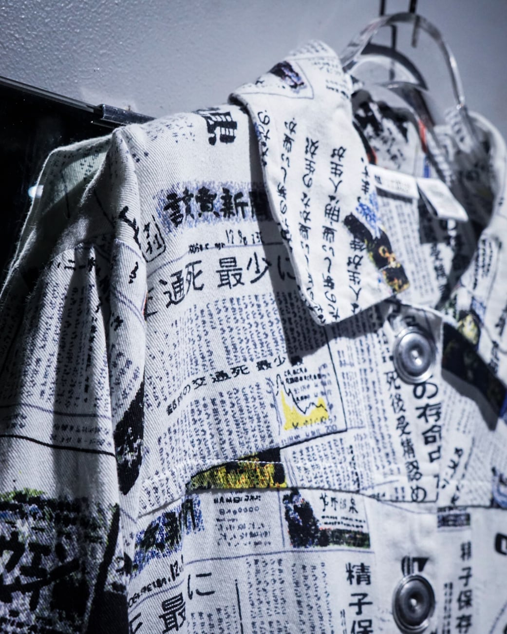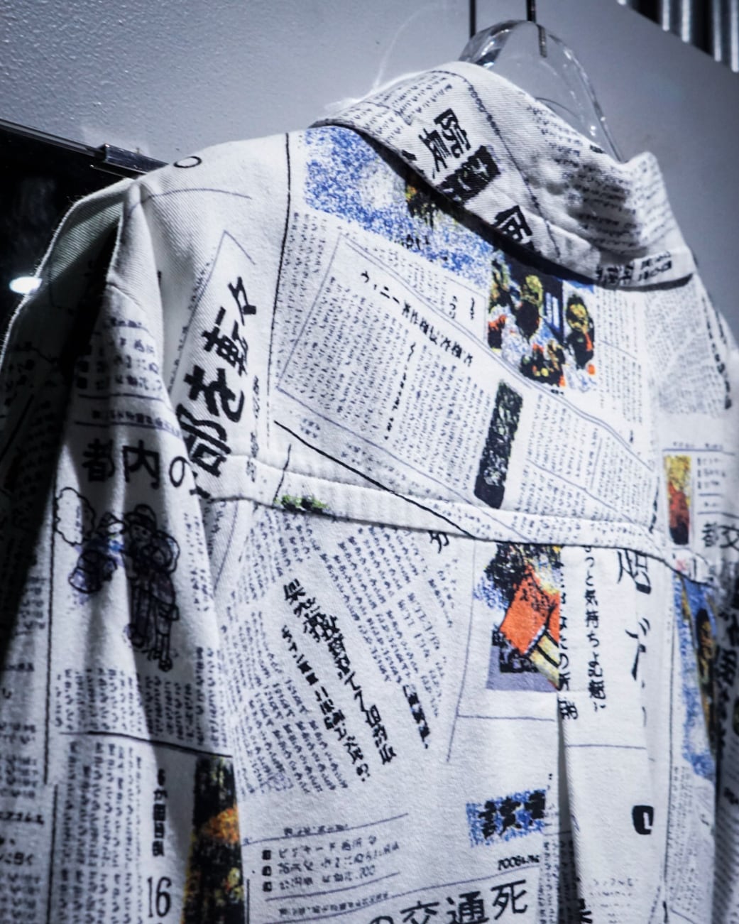 最大の特徴は、全体に施された日本語新聞の総柄プリント。ニュース記事や写真、ランダムにレイアウトされたデザインは、アートピースのようなインパクトを放ち、ストリートカルチャーやアヴァンギャルドなファッションとも親和性の高い仕上がり。