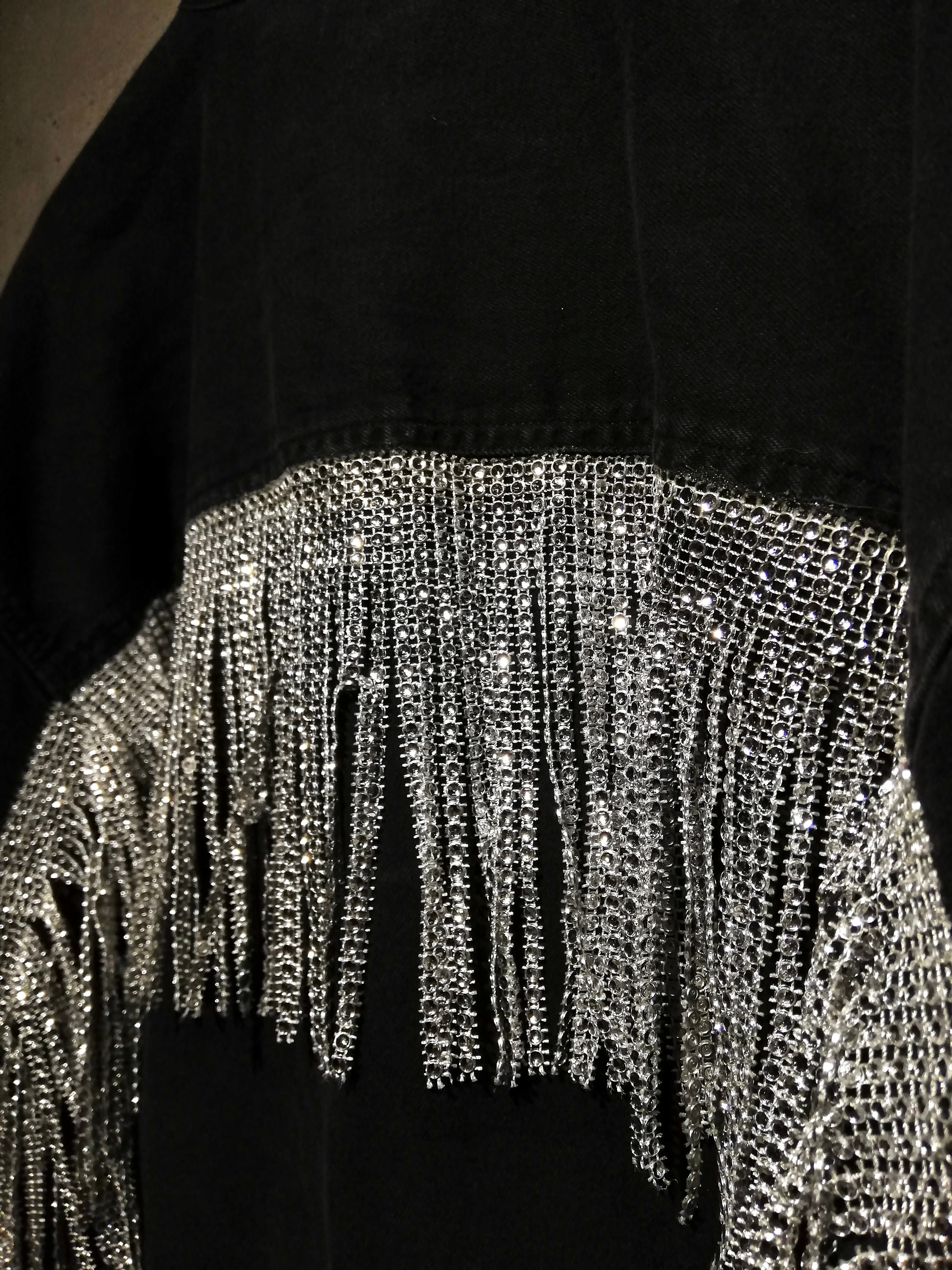 “Levi’s Red Tab”のブラックデニムシャツを基盤に、両袖から背面にかけてラインストーンフリンジが施されたデニムシャツ。