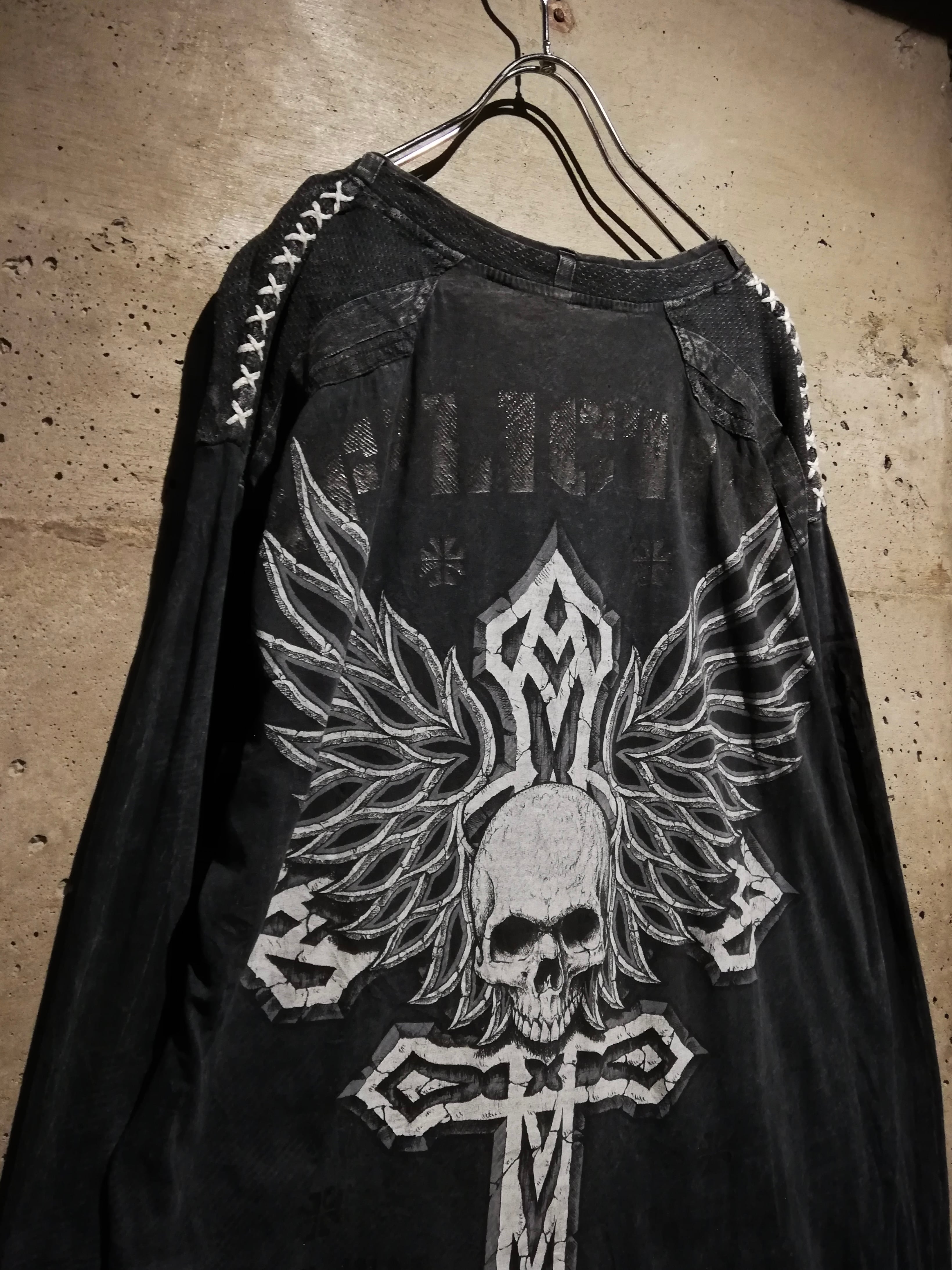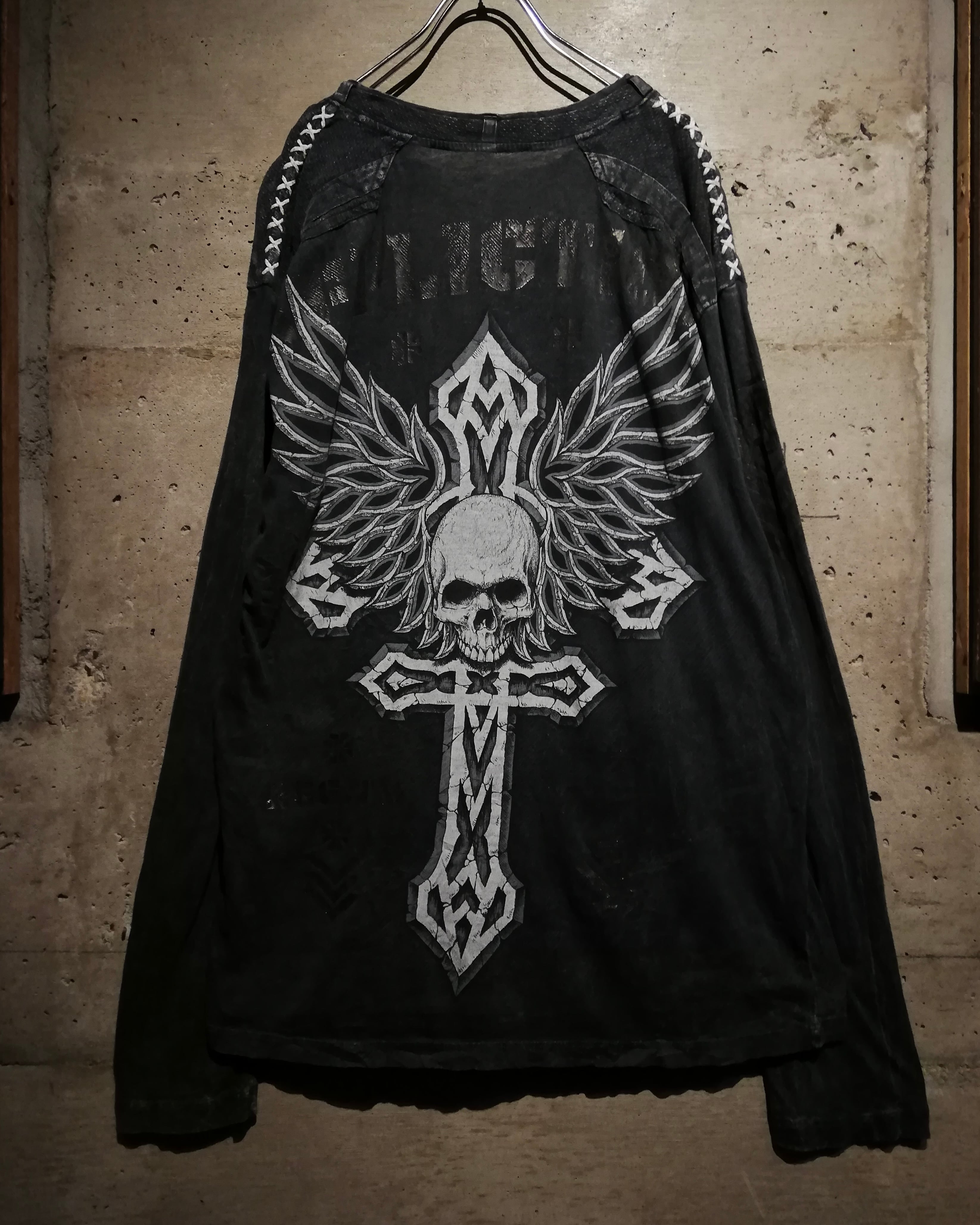 多くのアーティストやアスリートたちを魅了し、ジョシュ・バーネット、チャック・リデル、オジー・オズボーンなどとのコラボレーション実績も誇るアメリカンカジュアルブランド “Affliction”より、圧倒的な存在感を放つ長袖Tシャツ。