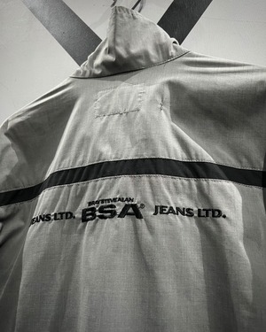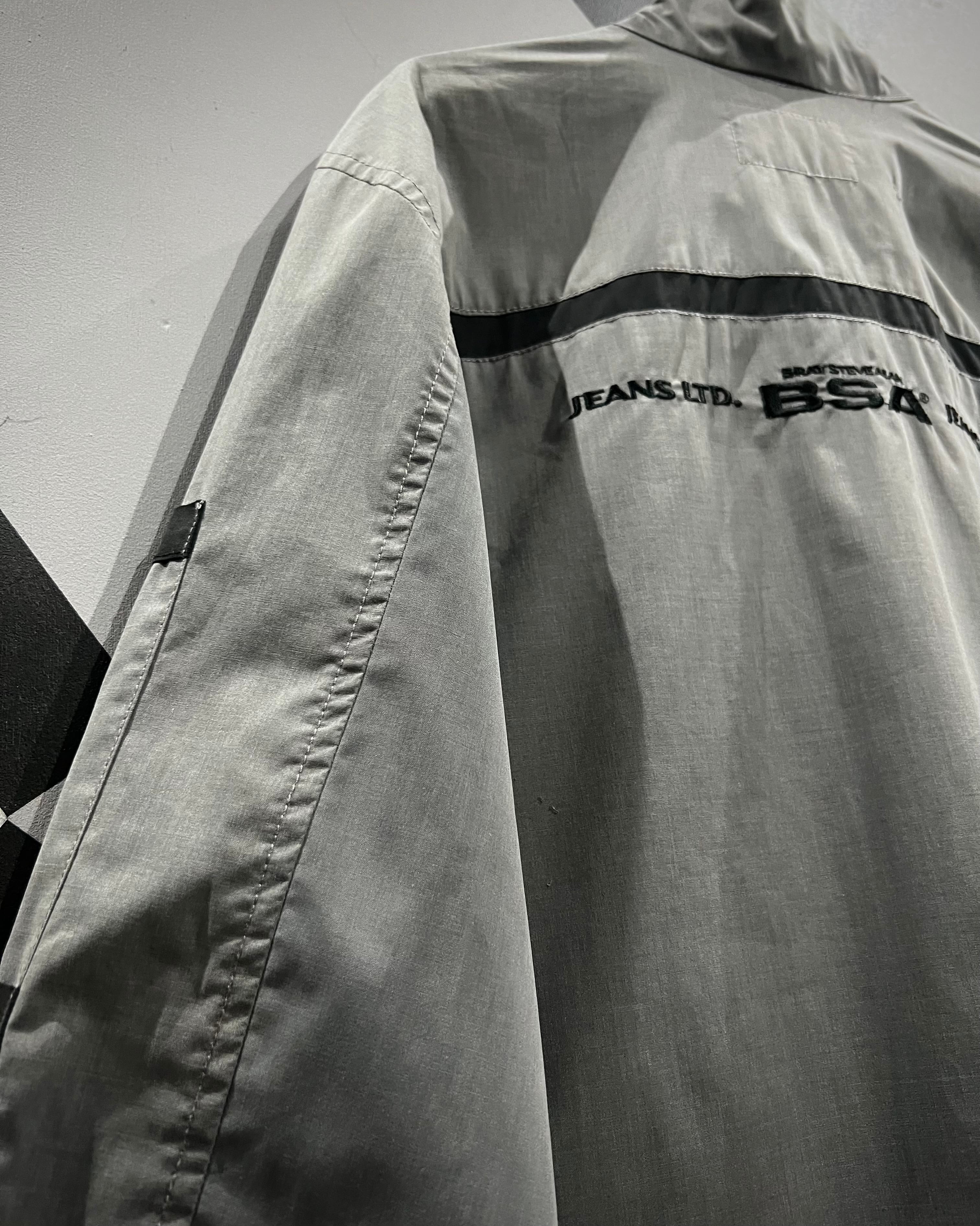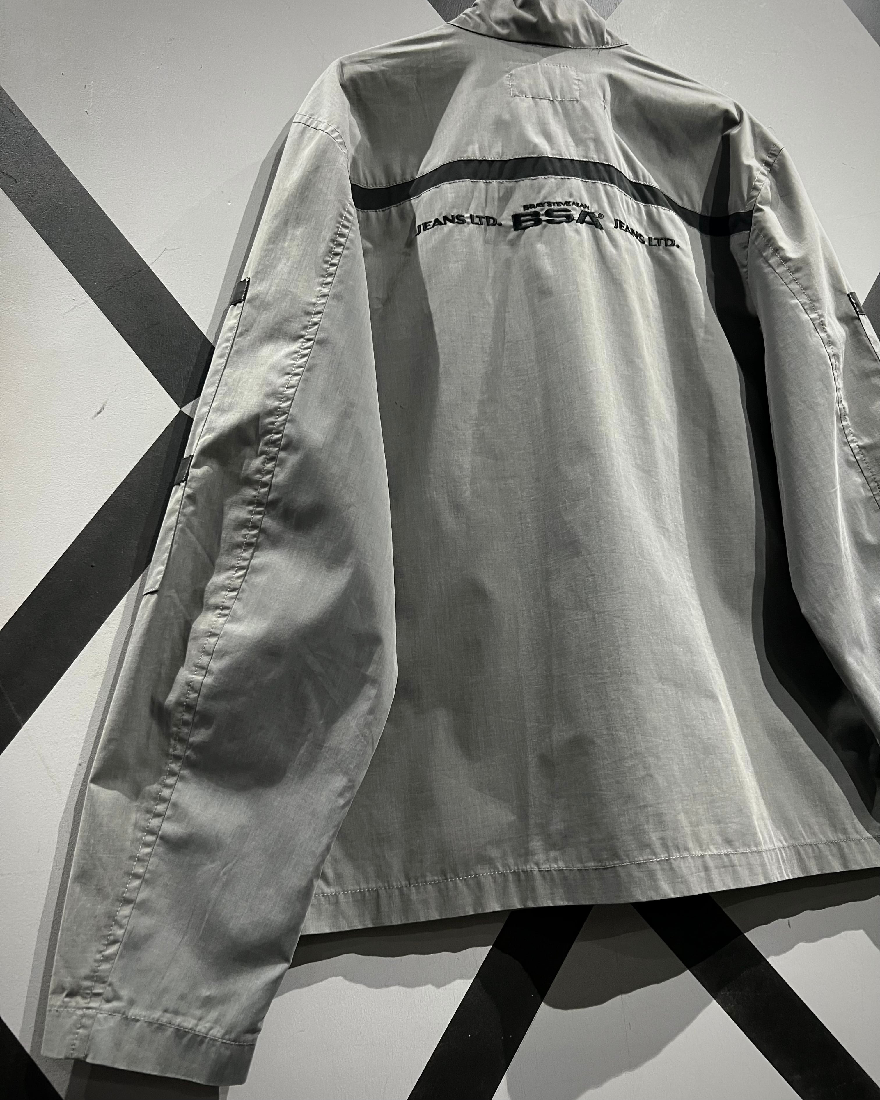 ハリと光沢のあるグレーボディをベースに、フロント全面にベルト付きのフラップポケットを配置した、無骨さと機能美が共存するスタンドカラージャケット。