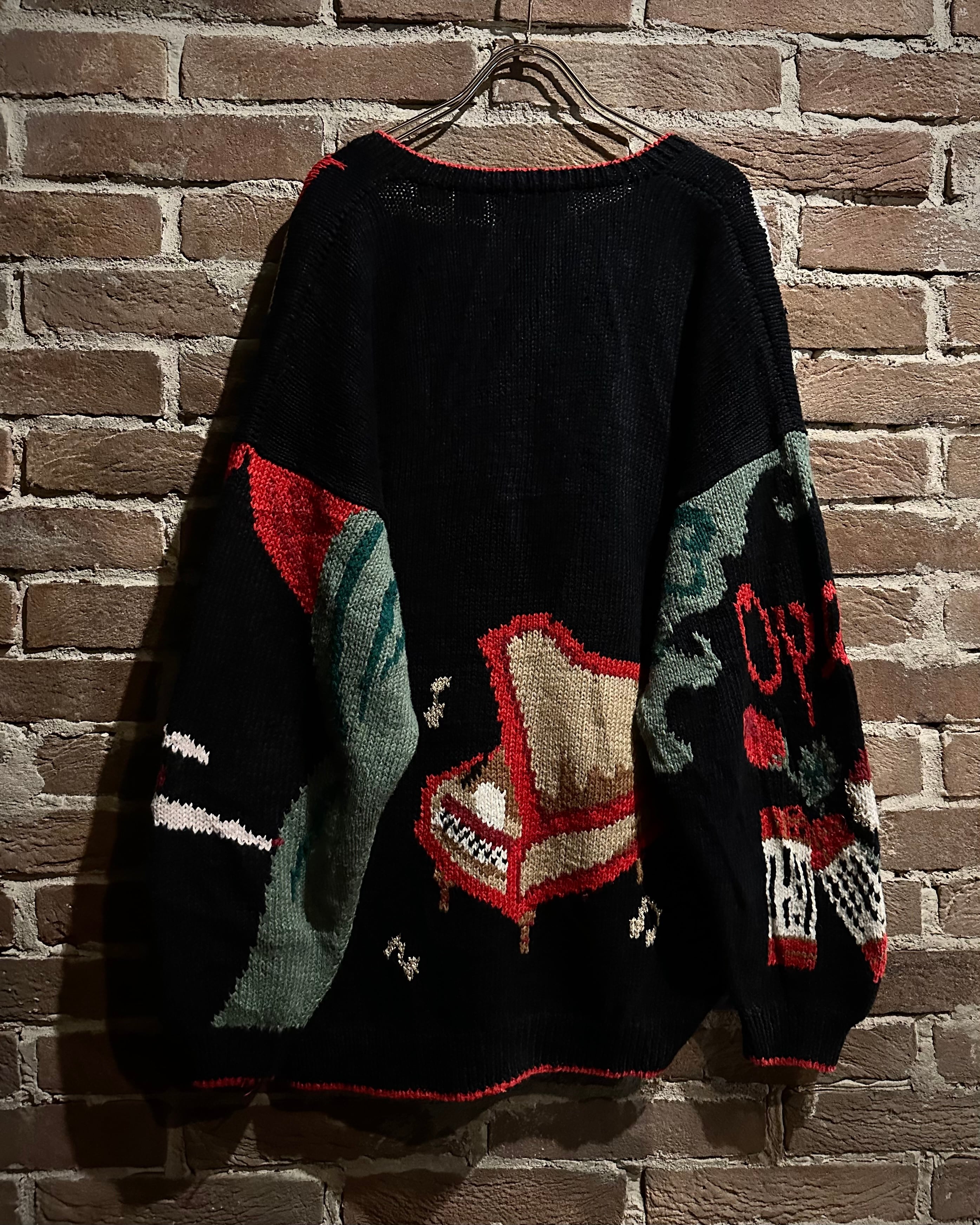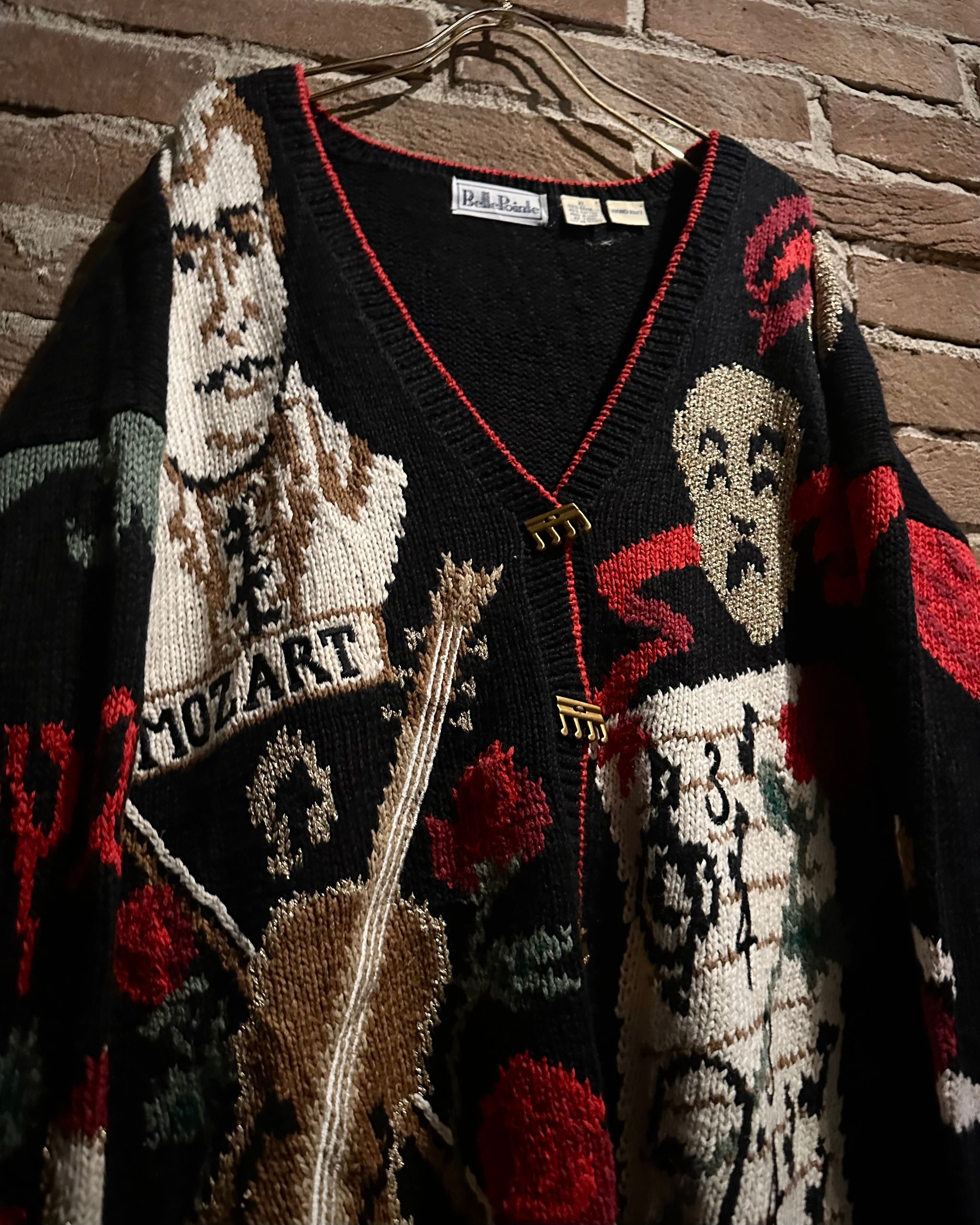 ヴィンテージらしい柔らかなブラックボディをベースに、モーツァルトやオペラ、楽器などが立体的に編み込まれたアートピースのような一着です。