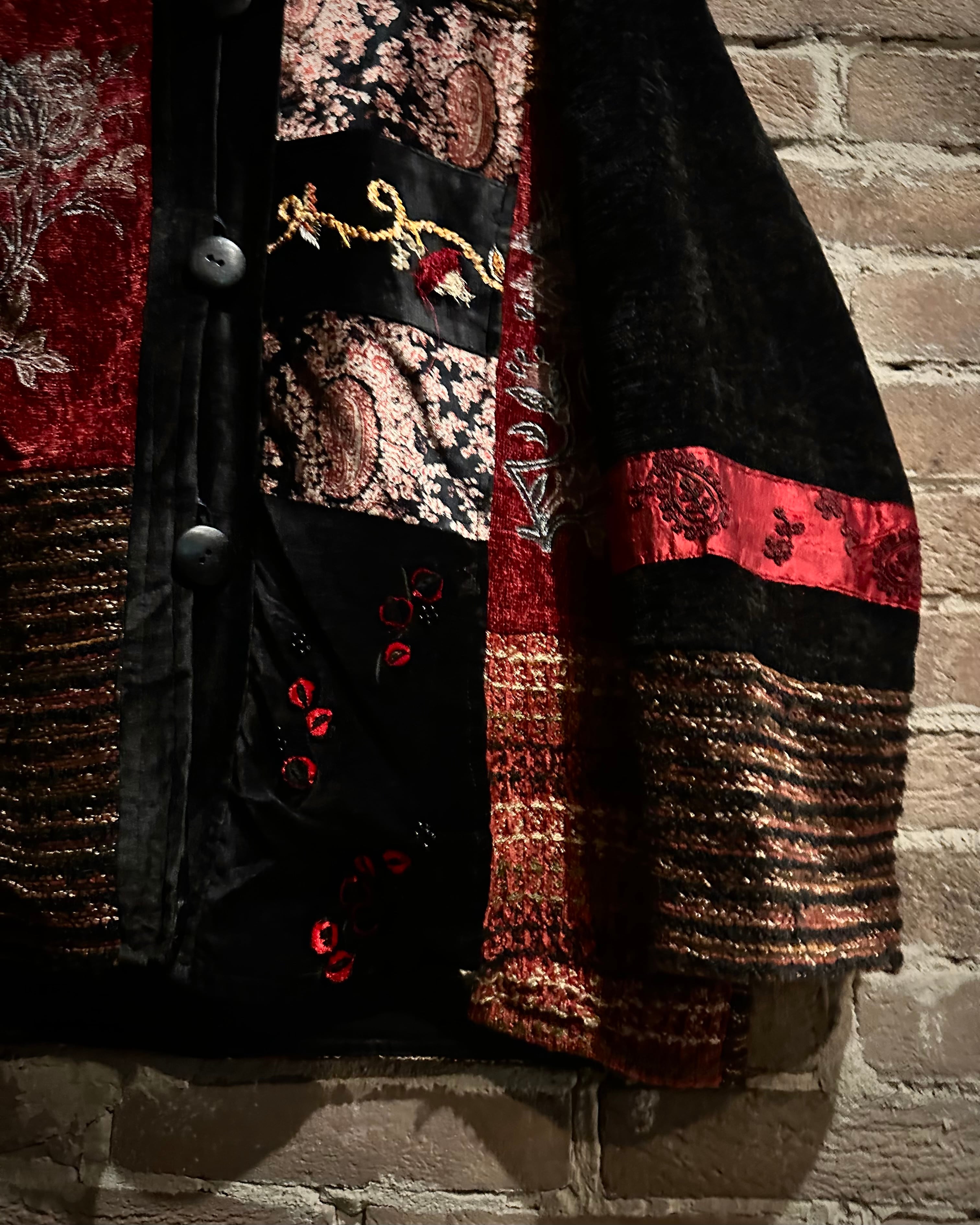 ベロアボディに、シェニールやジャガードといった異素材を贅沢に組み合わせたパッチワークジャケット。
