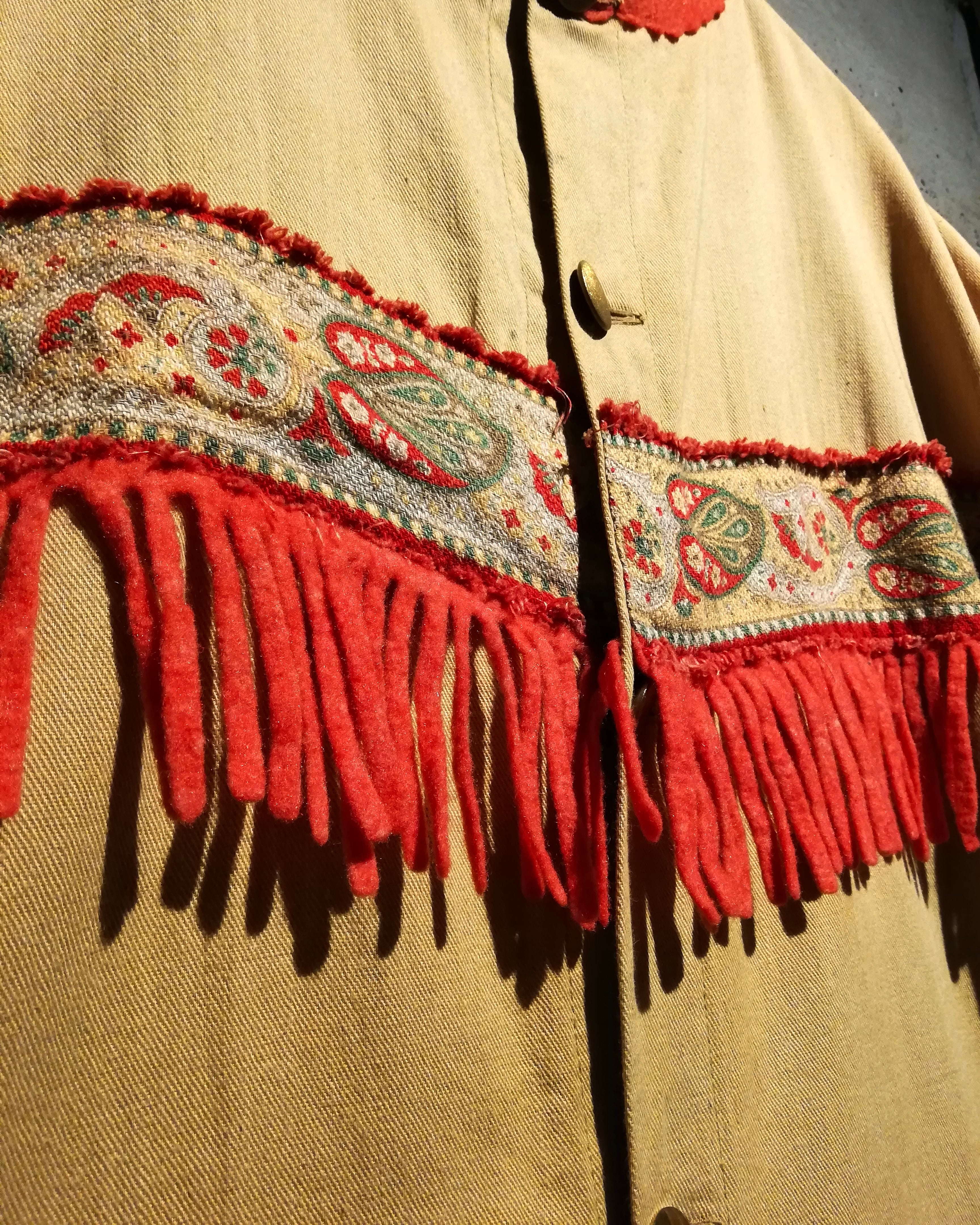 乾いた質感のベージュコットンキャンバスをベースに、赤のフェルトフリンジとペイズリー刺繍テープを贅沢に配置。装飾的でありながらも全体のトーンは柔らかく、クラフト的な温もりと品格を併せ持つバランスに仕上げられています。