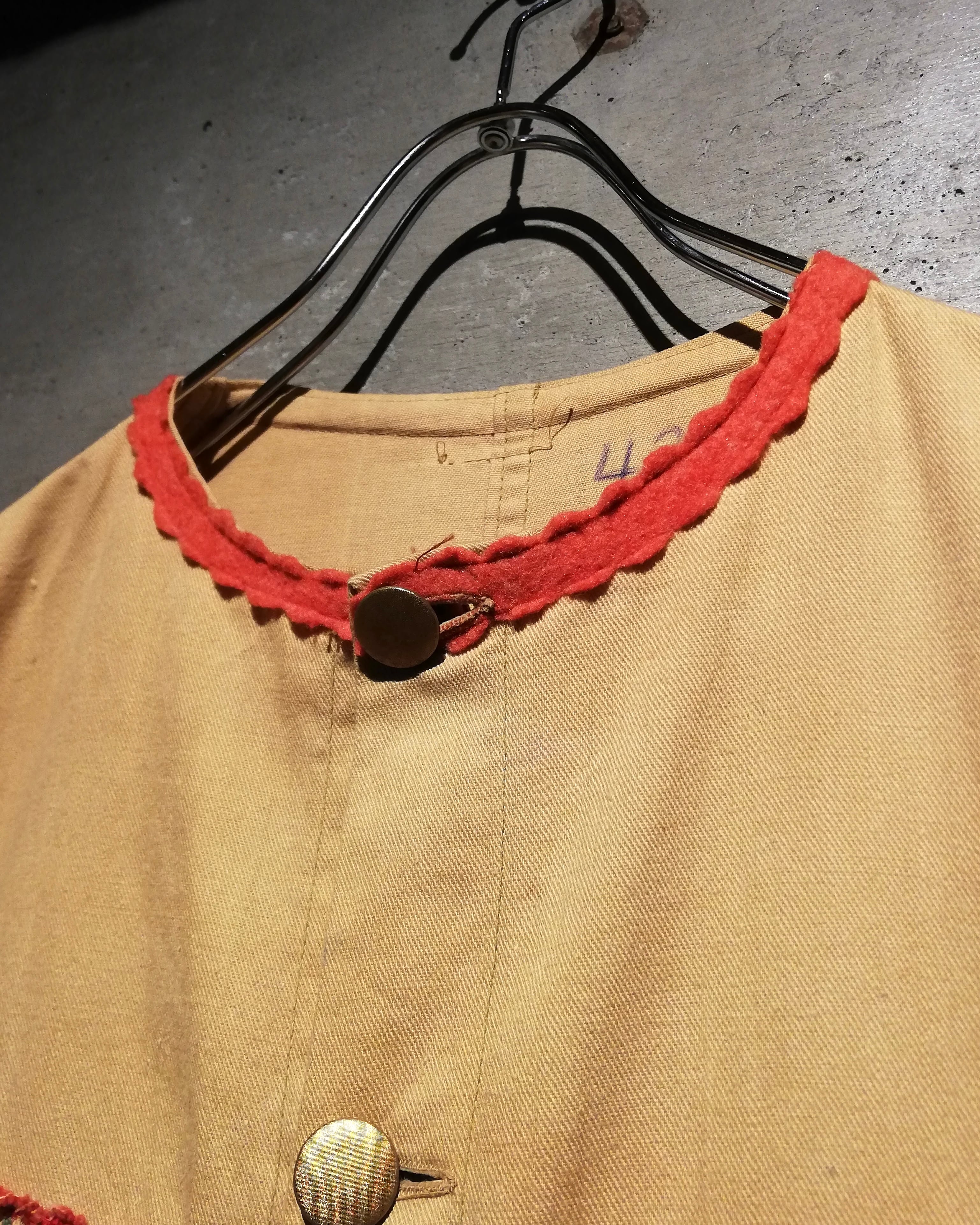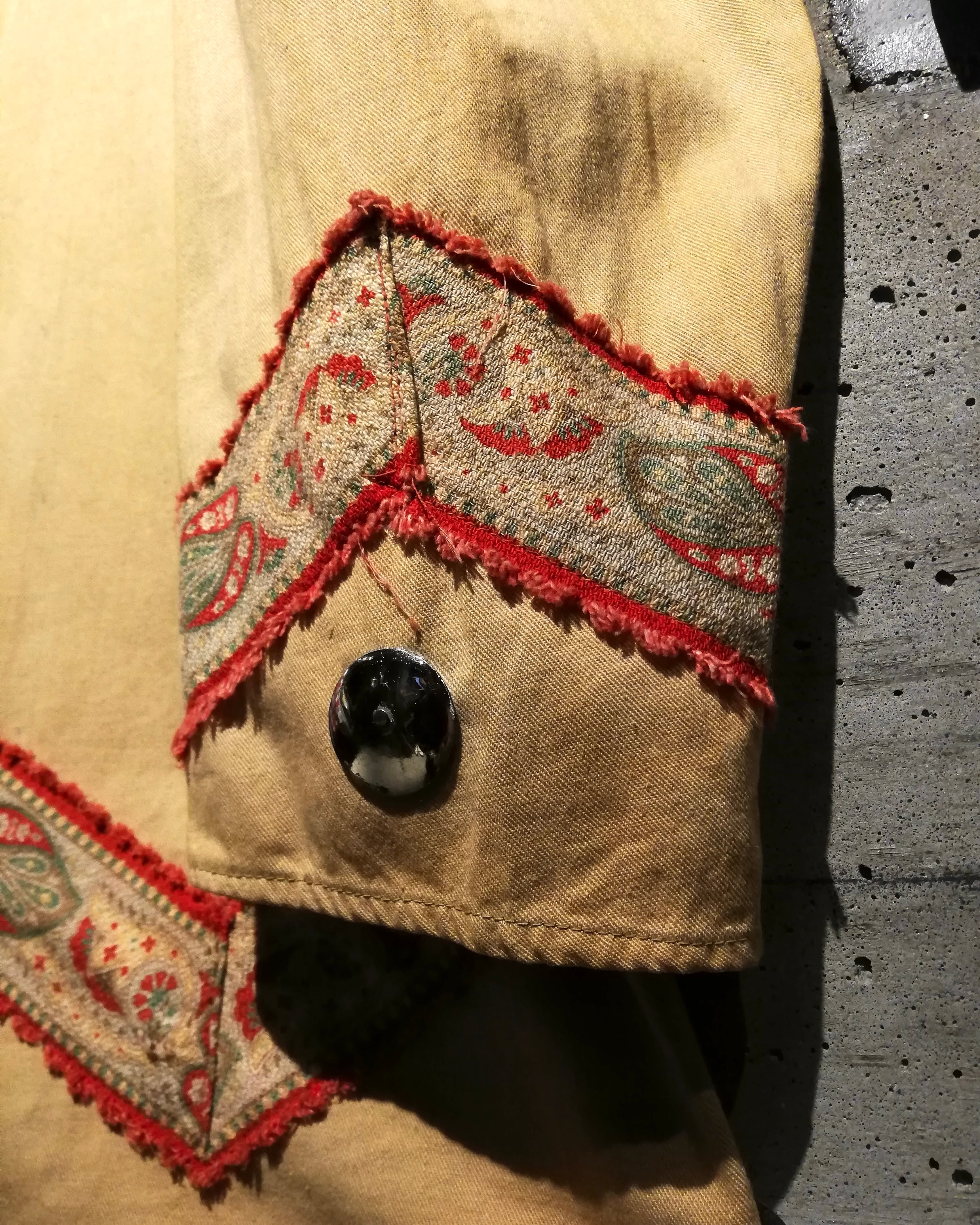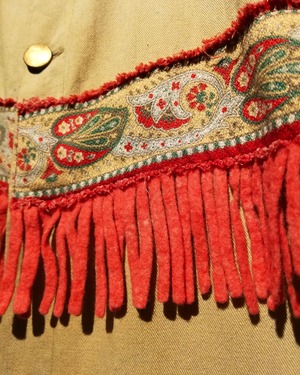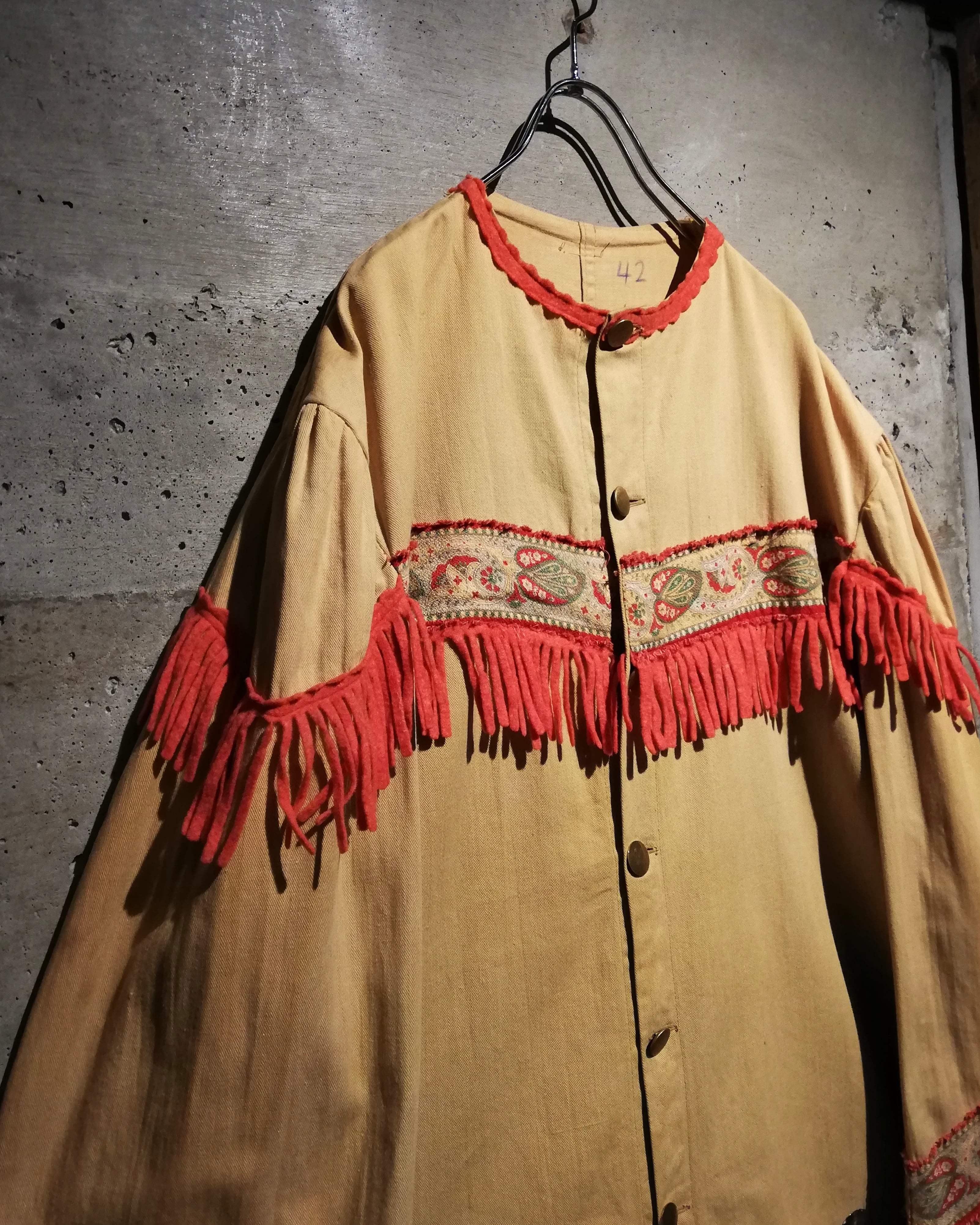経年によって程よくフェードしたベージュトーン、そしてフリンジや刺繍に宿る軽やかなヤレ感。リアルクロージングでは決して再現できない、“ステージウェア”ならではの雰囲気を纏っています。ショーやフォークイベントなど、当時のカルチャーシーンをも想起させる逸品です。