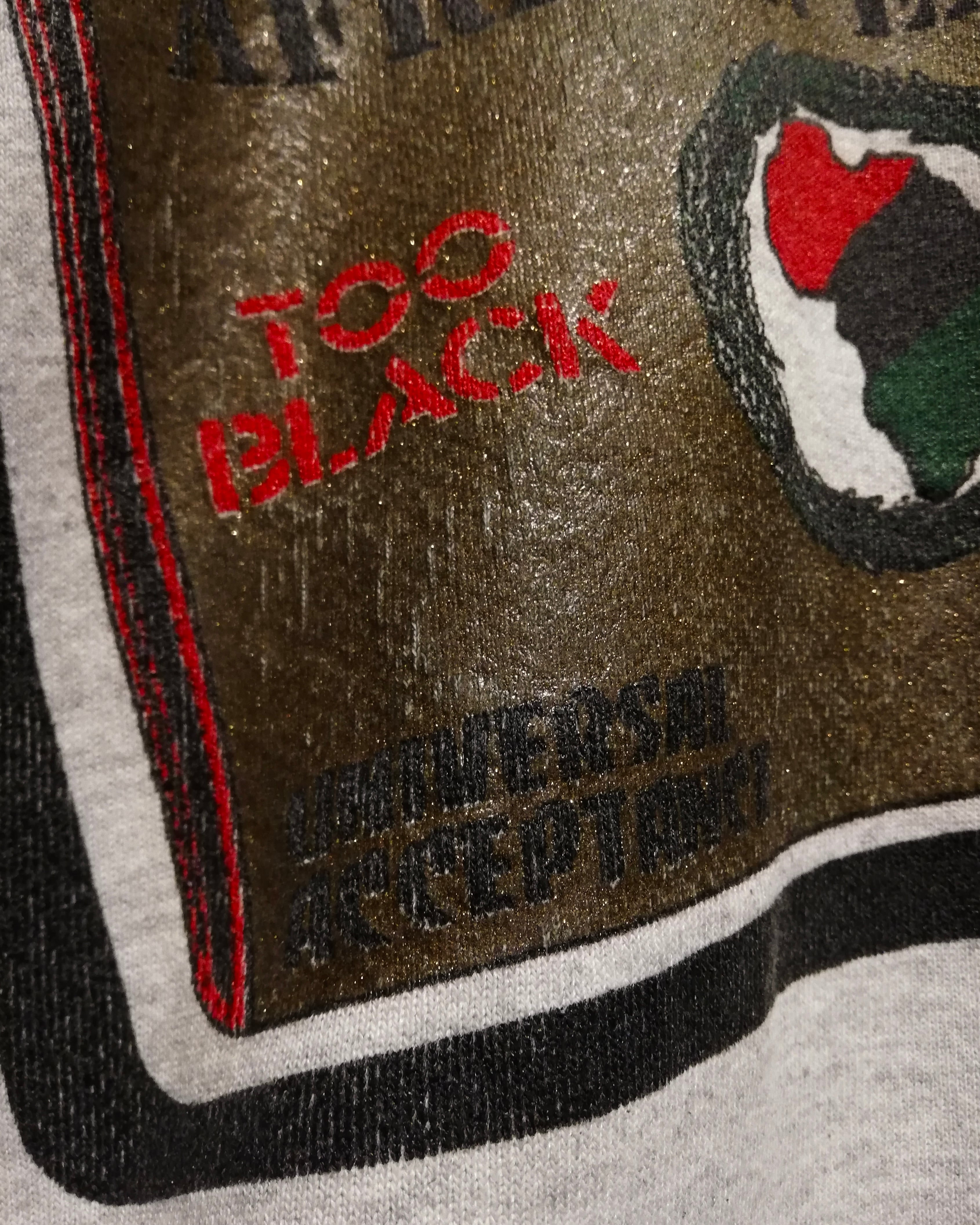 中央にはアフリカ大陸のシルエットが描かれ、その周囲に「TOO BLACK」「TOO STRONG」といった強いメッセージが配された、当時のストリートカルチャーやブラックコミュニティの誇りとアイデンティティを象徴するデザイン。