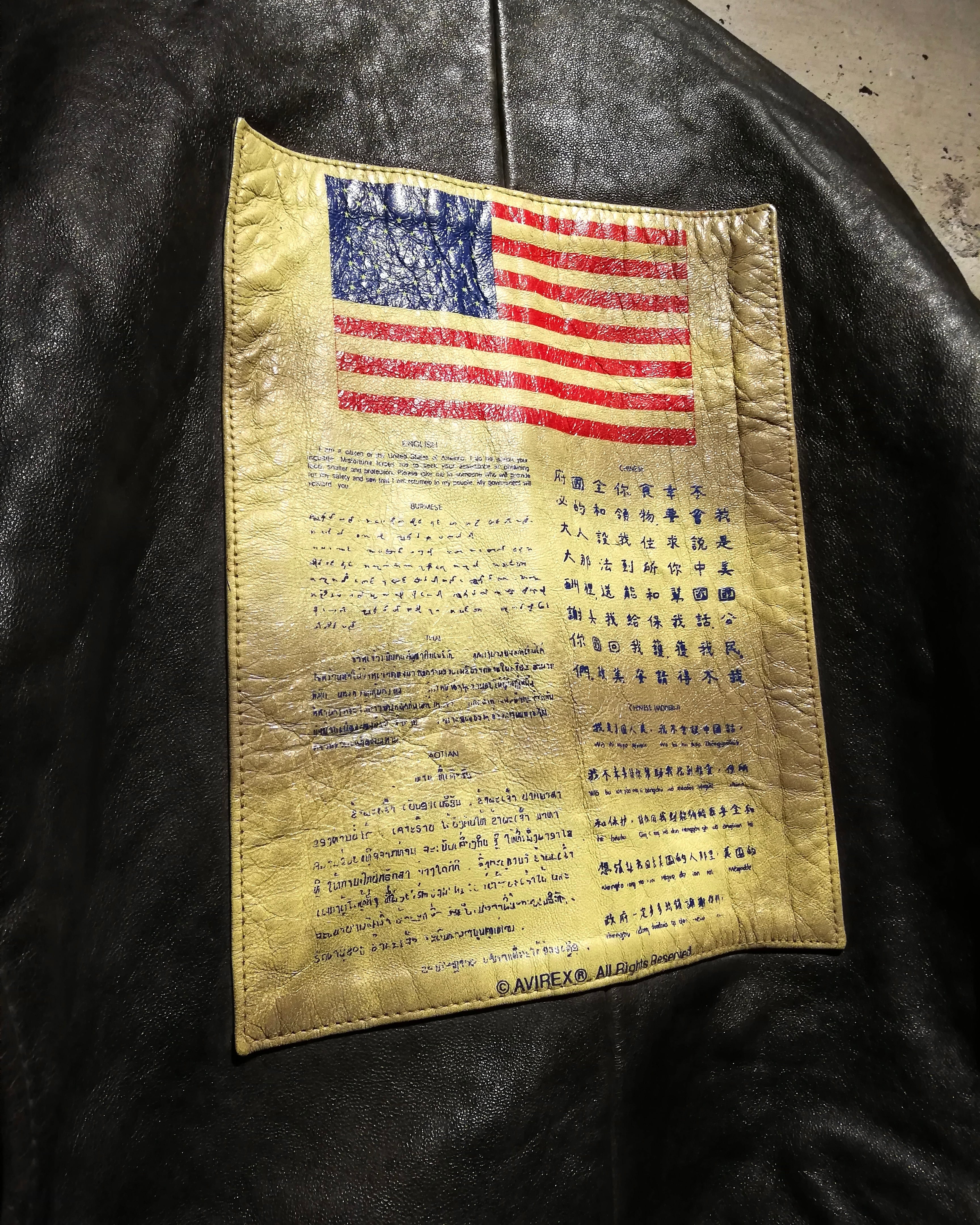 裏地には航路を模したマップ柄を採用し、バックにはアメリカ国旗と多言語メッセージをプリントしたリスキーパッチを配置。ミリタリーのリアルな背景とAVIREXらしい遊び心を融合したデザインです。