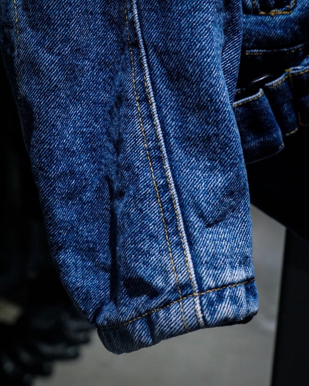 全体にはインディゴデニム特有のフェード感が現れ、経年とともに深みを増した色合いが無骨な存在感を放ちます。