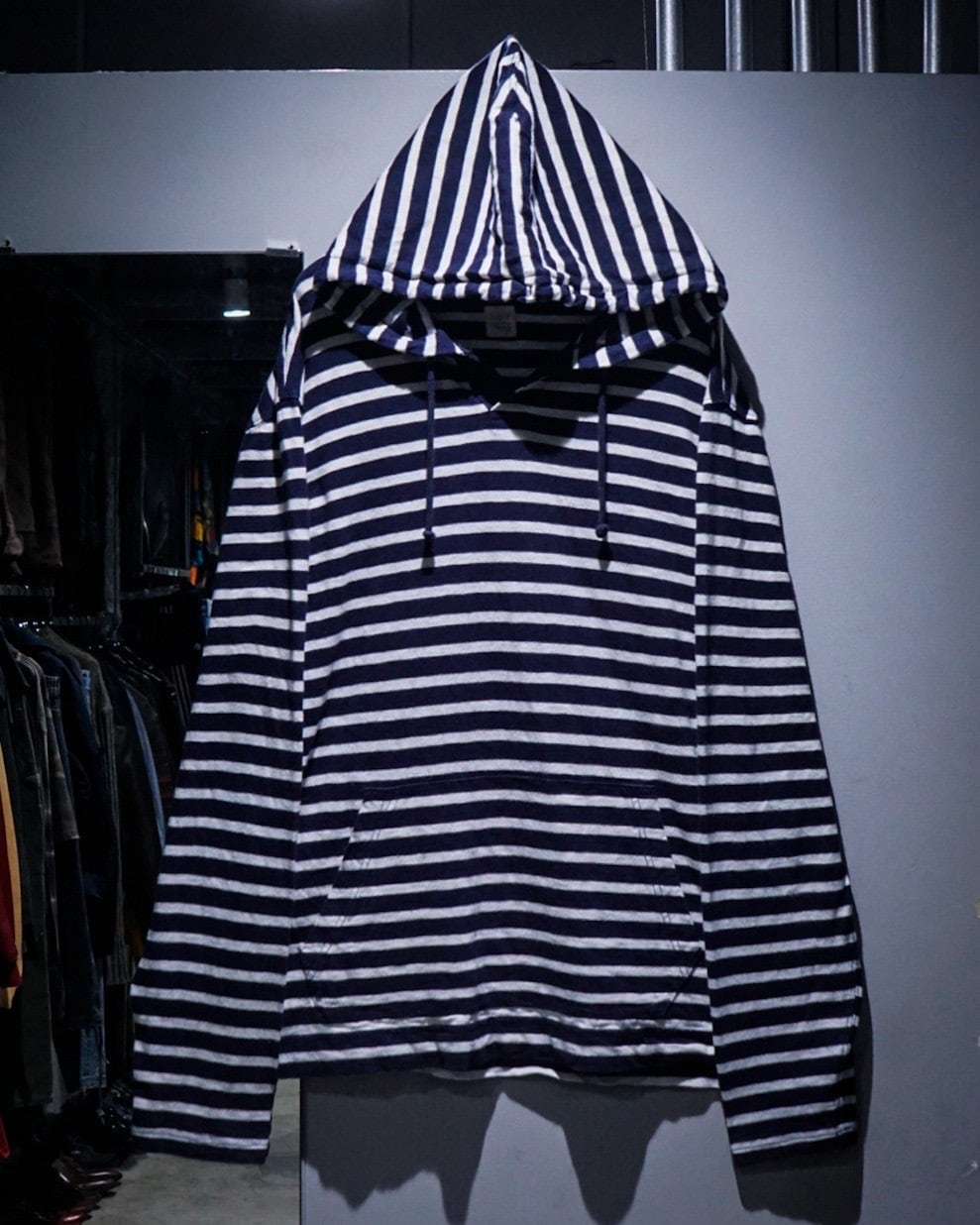 アメリカを代表するトラディショナルブランド“J.CREW”より、マリンテイスト薫るネイビー×ホワイトのボーダーが印象的なプルオーバーフーディー。