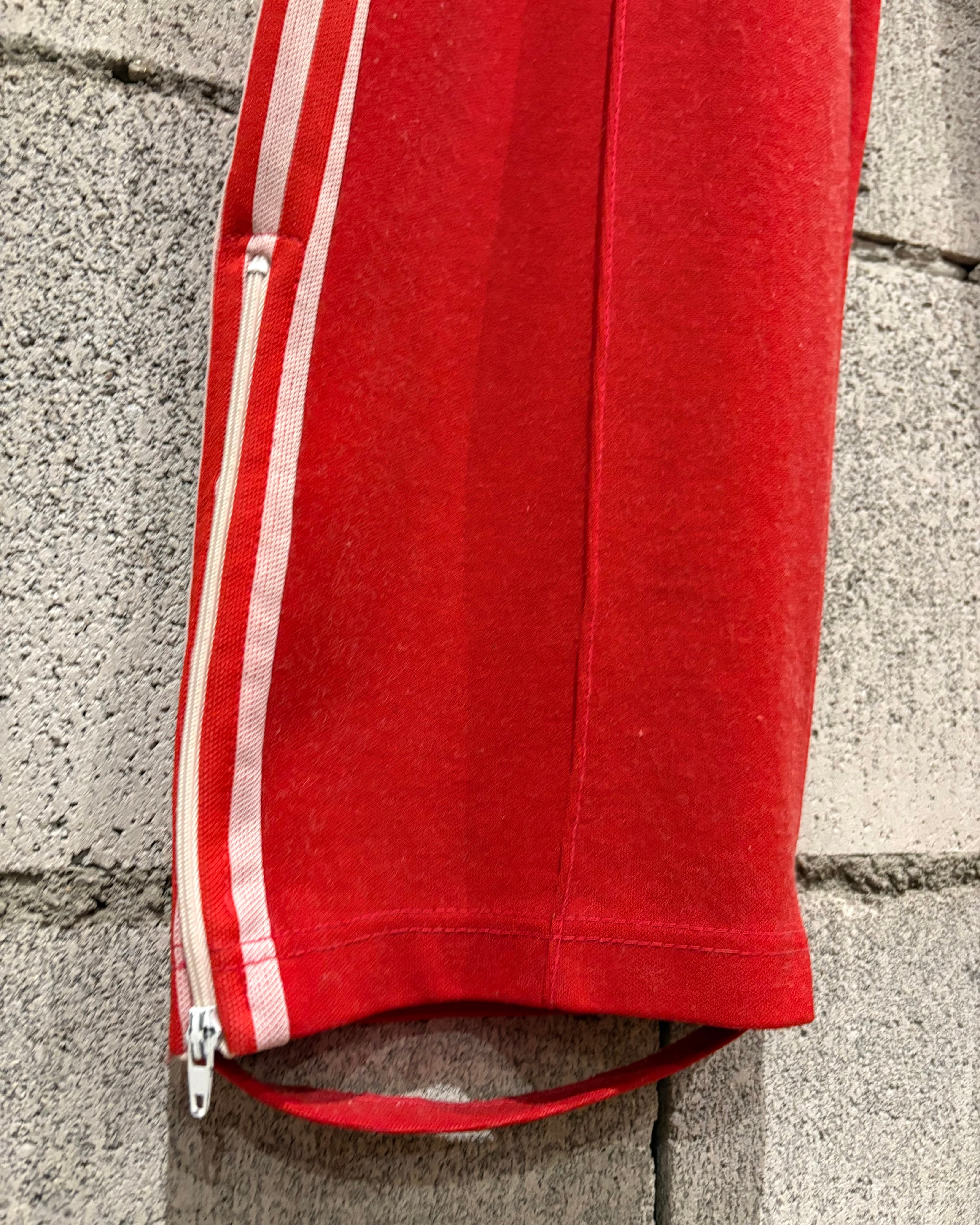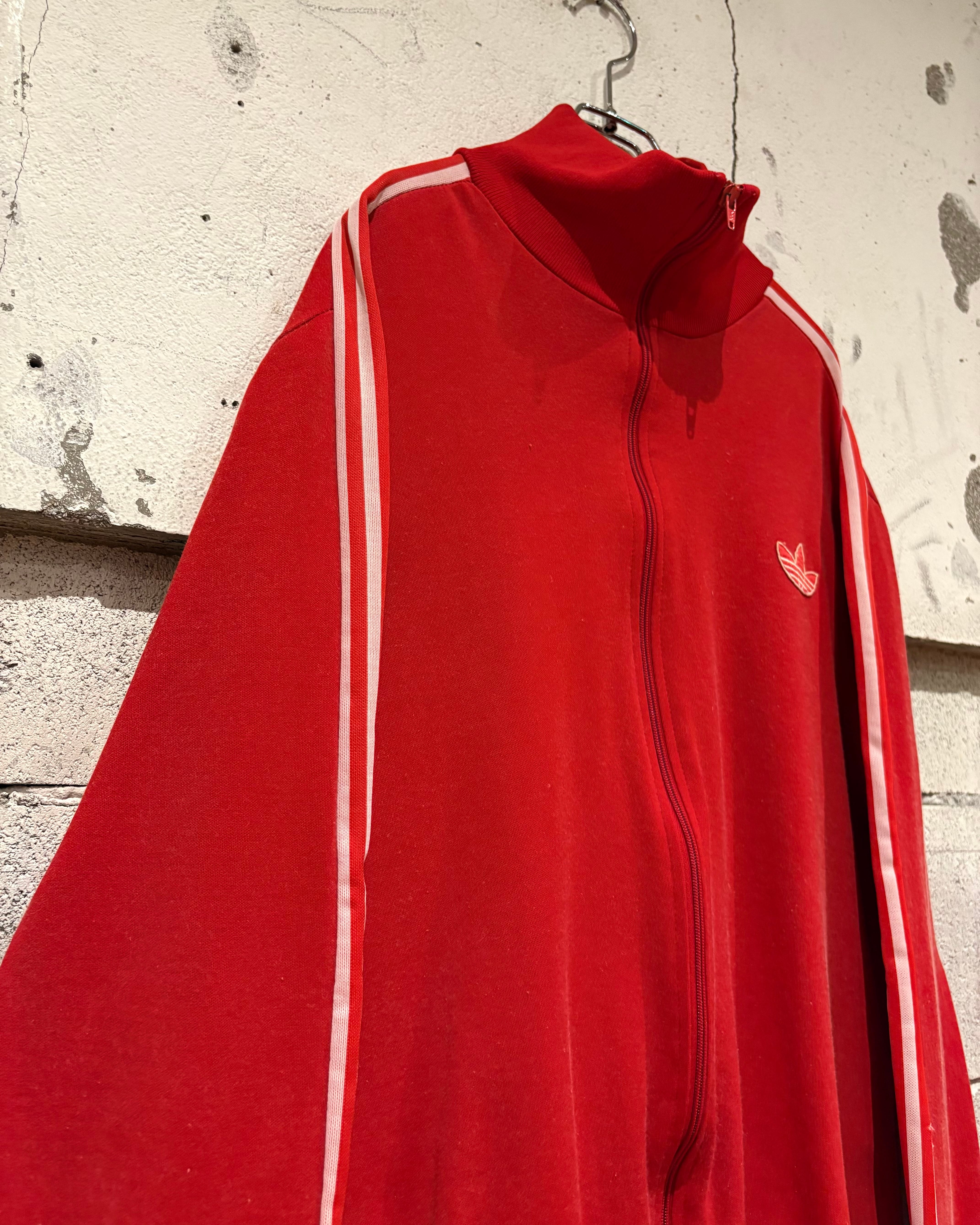 鮮烈なレッドボディに、ホワイトのスリーストライプが映えるクラシックな配色。胸元にはトレフォイルロゴを配置し、当時ならではのフォントバランスと質感が抜群の雰囲気を放ちます。