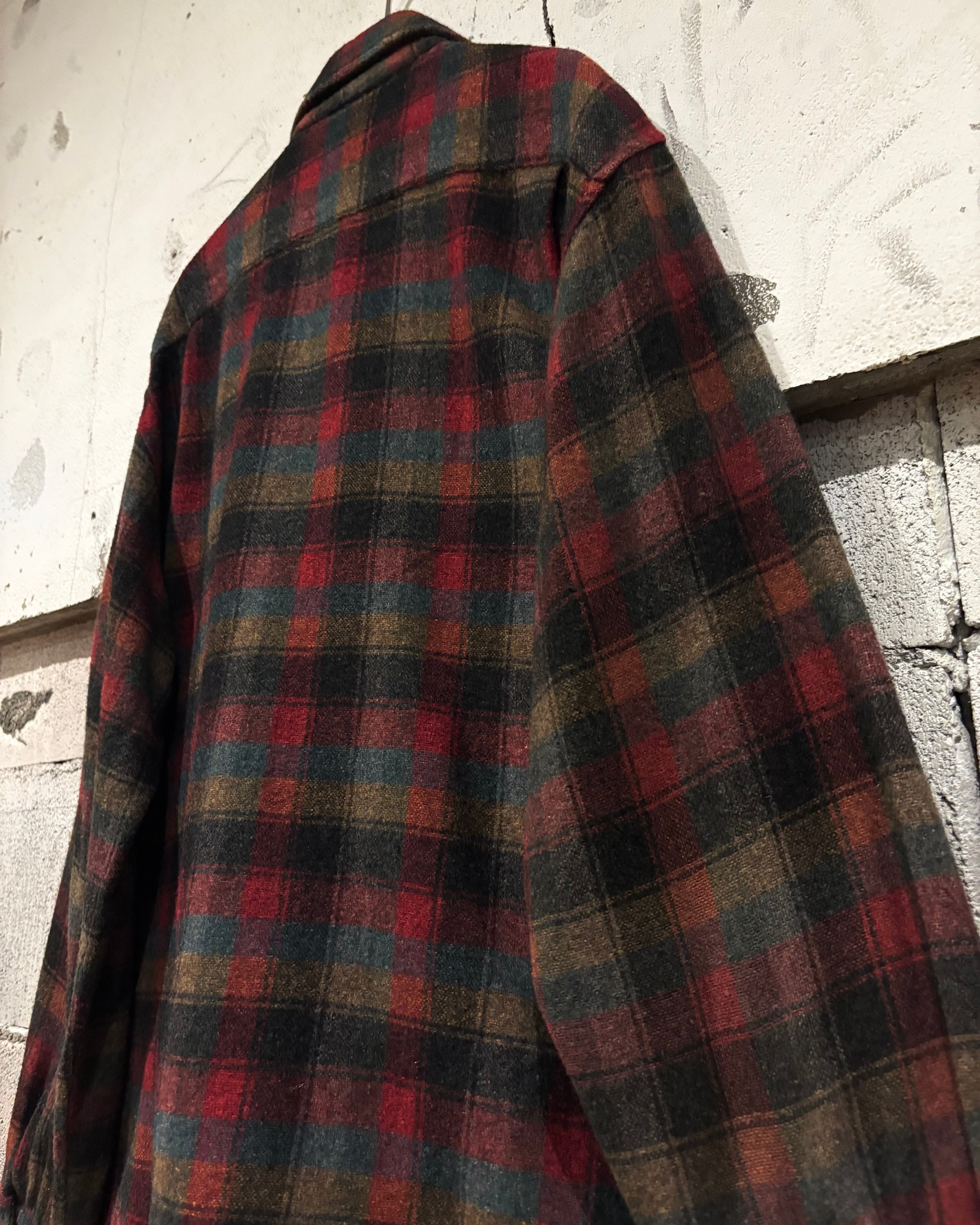 配色は深緑、バーガンディ、ブラウンを基調にしたクラシカルなチェックパターン。襟は大ぶりのオープンカラー、胸にはフラップ付きポケットを配置。ネルシャツならではの柔らかな起毛感が温かみを漂わせ、チェックの配色と見事にマッチ、非常に良い雰囲気を醸し出しています。