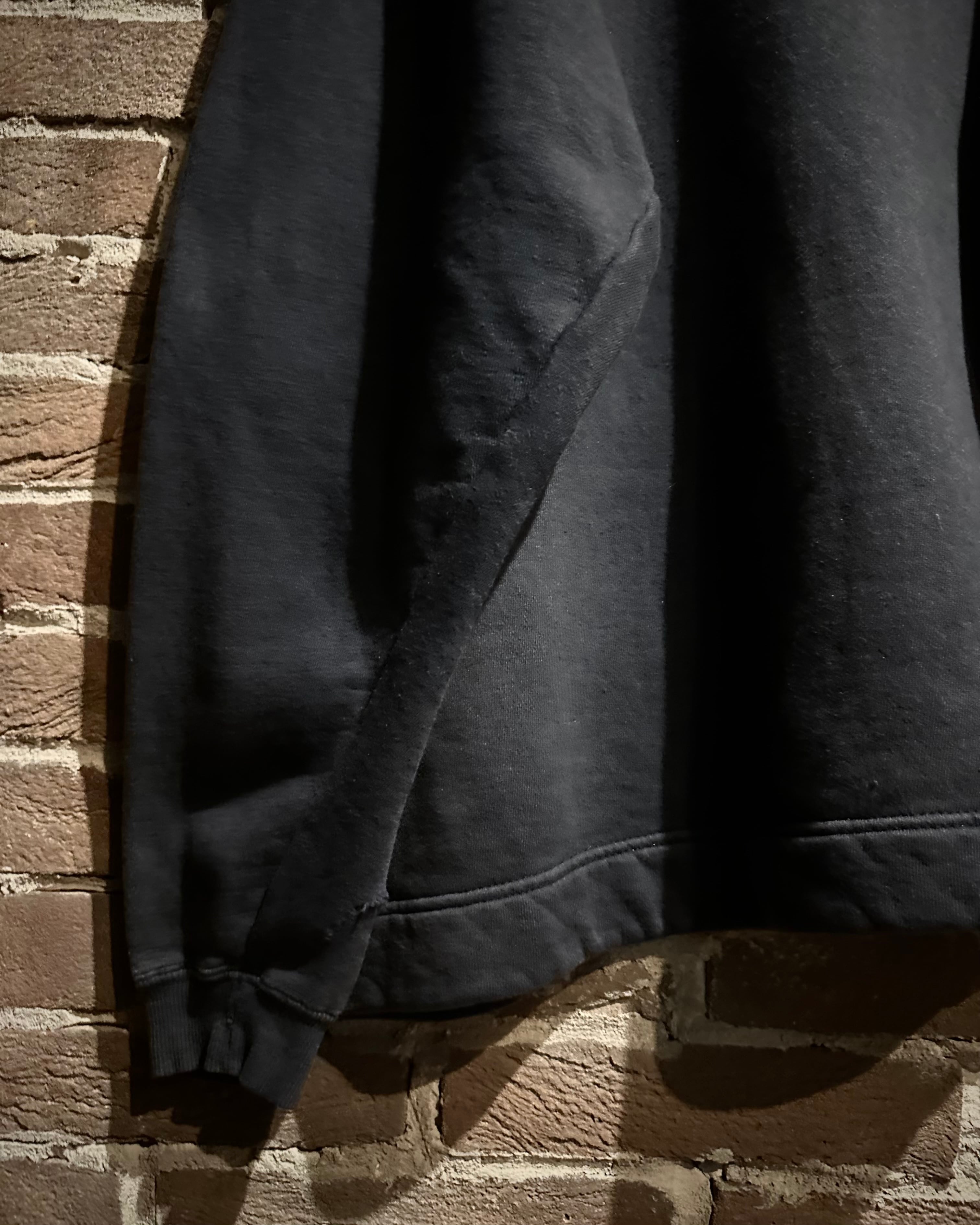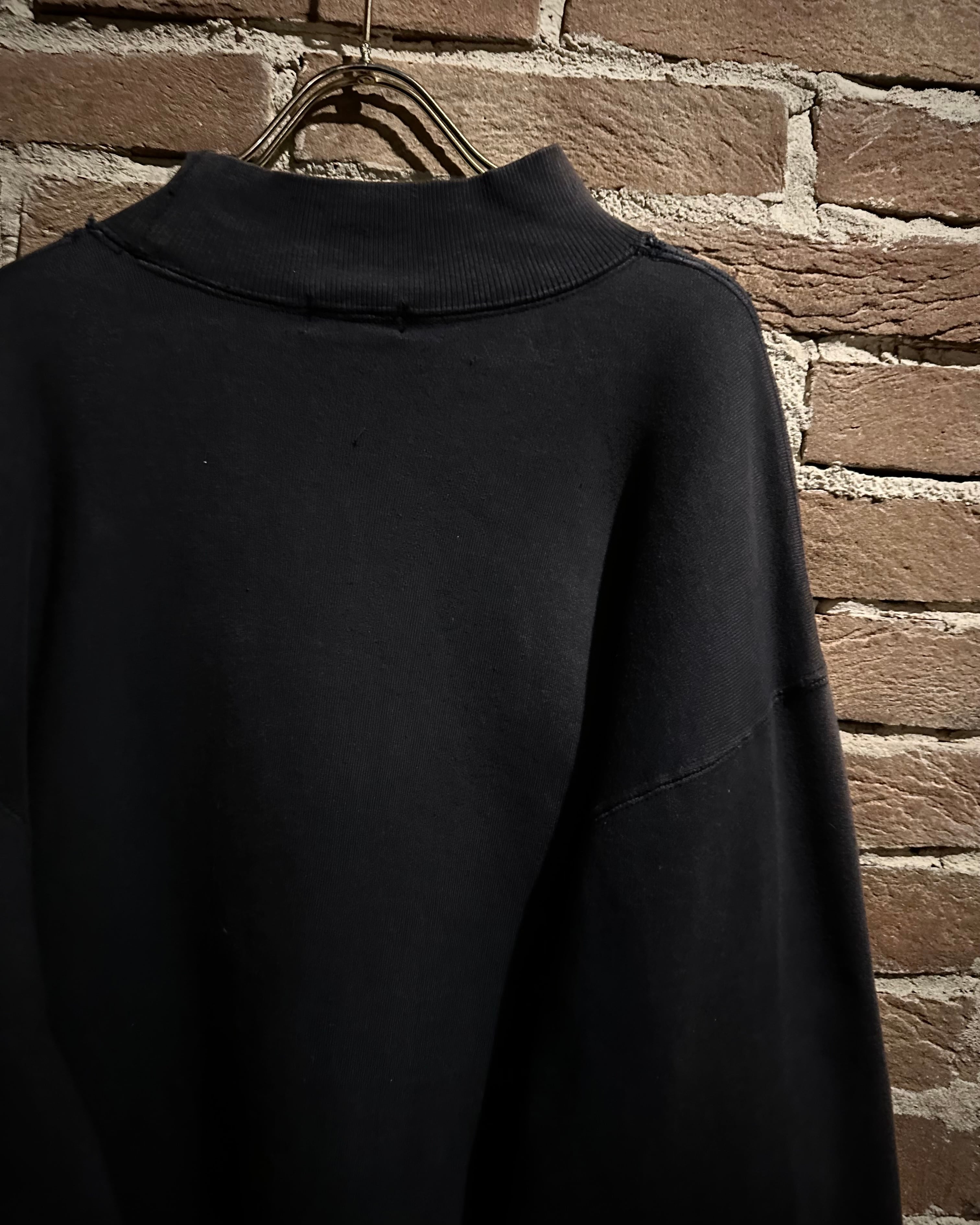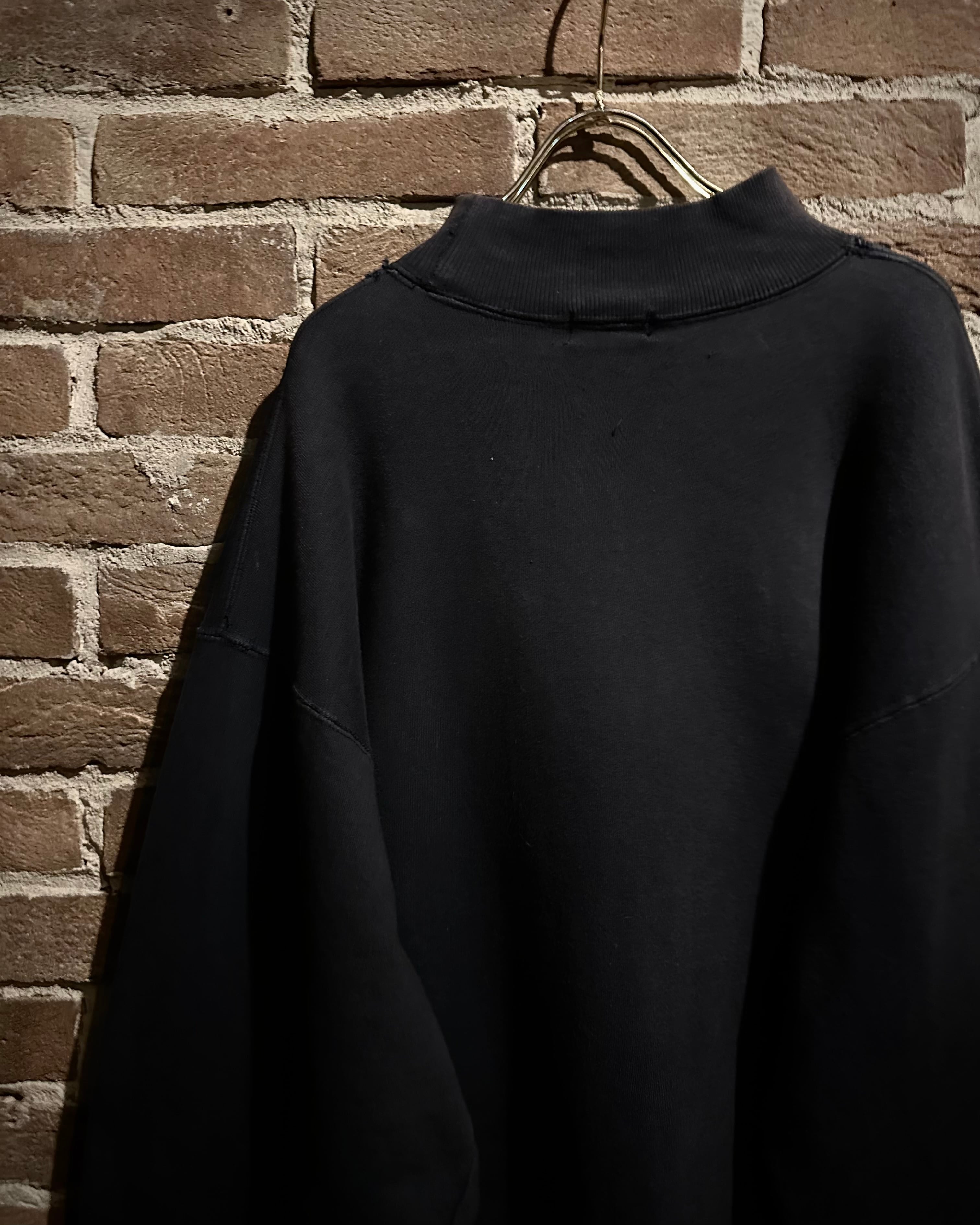 ボディには程よくフェードしたブラックのスウェット生地を使用。スプレーアート特有のマットな質感と、経年によるクラックや色褪せが融合し、ヴィンテージならではの深みを感じる一枚に。首元はモックネック仕様で、シルエットにも新鮮な抜け感を演出しています。