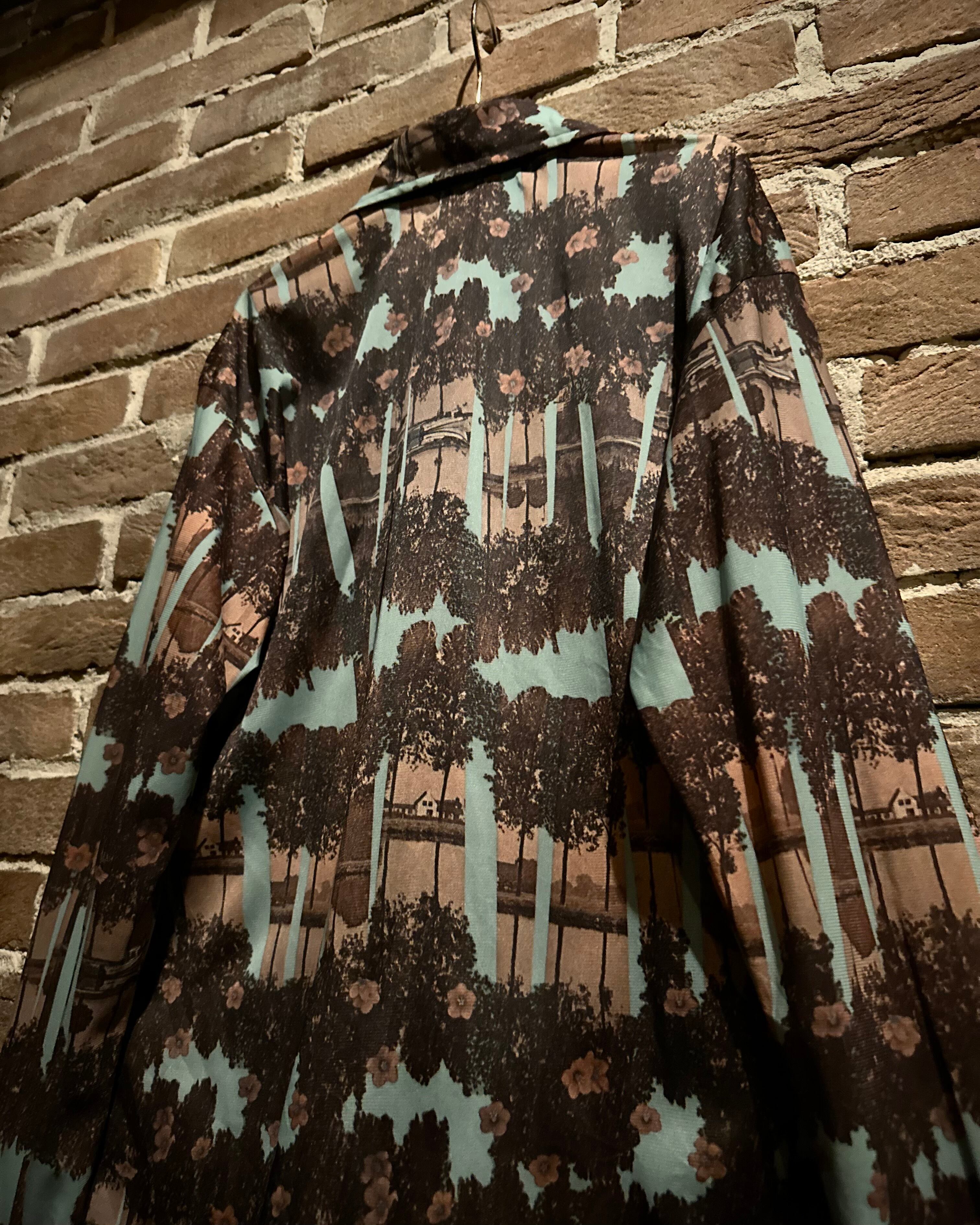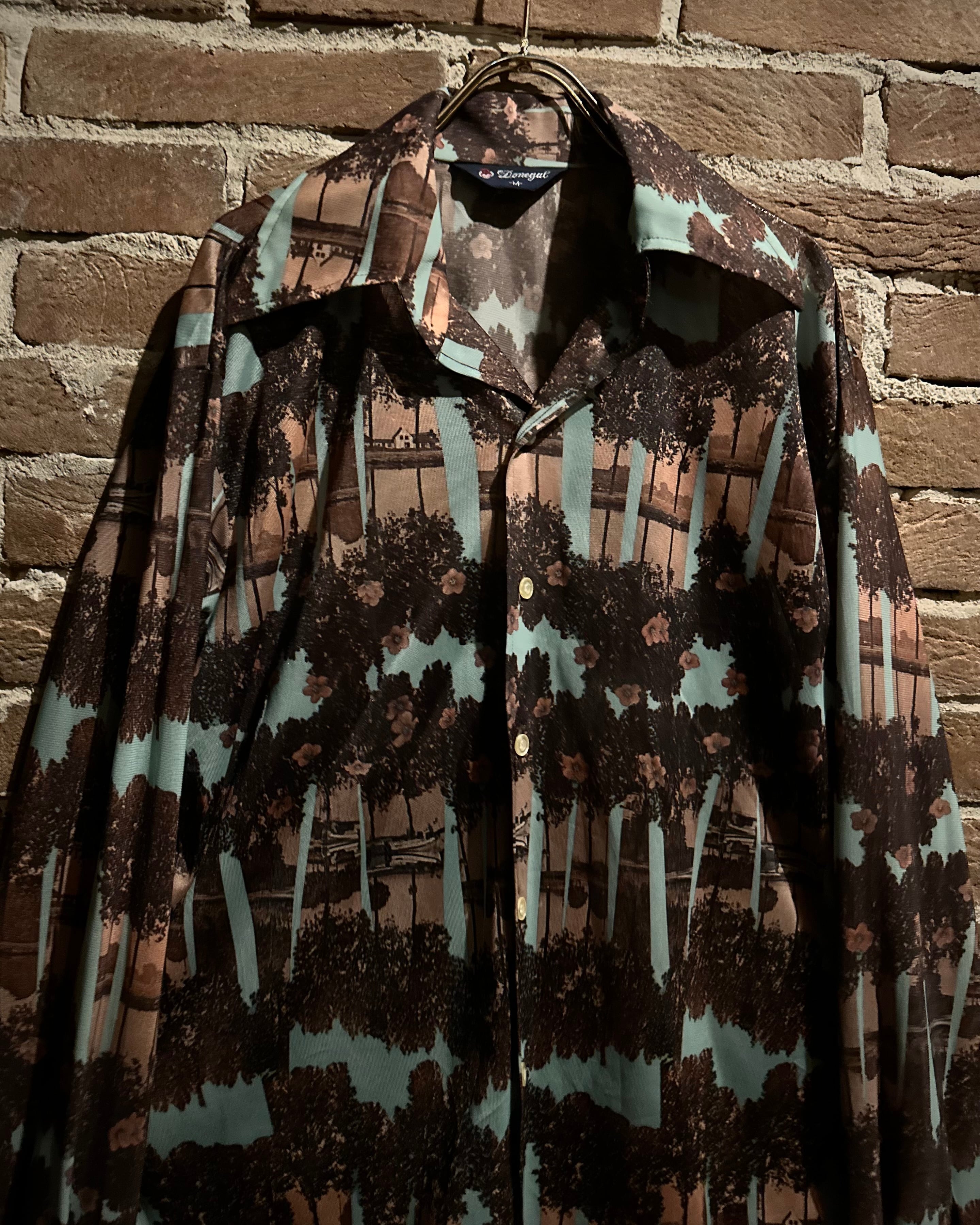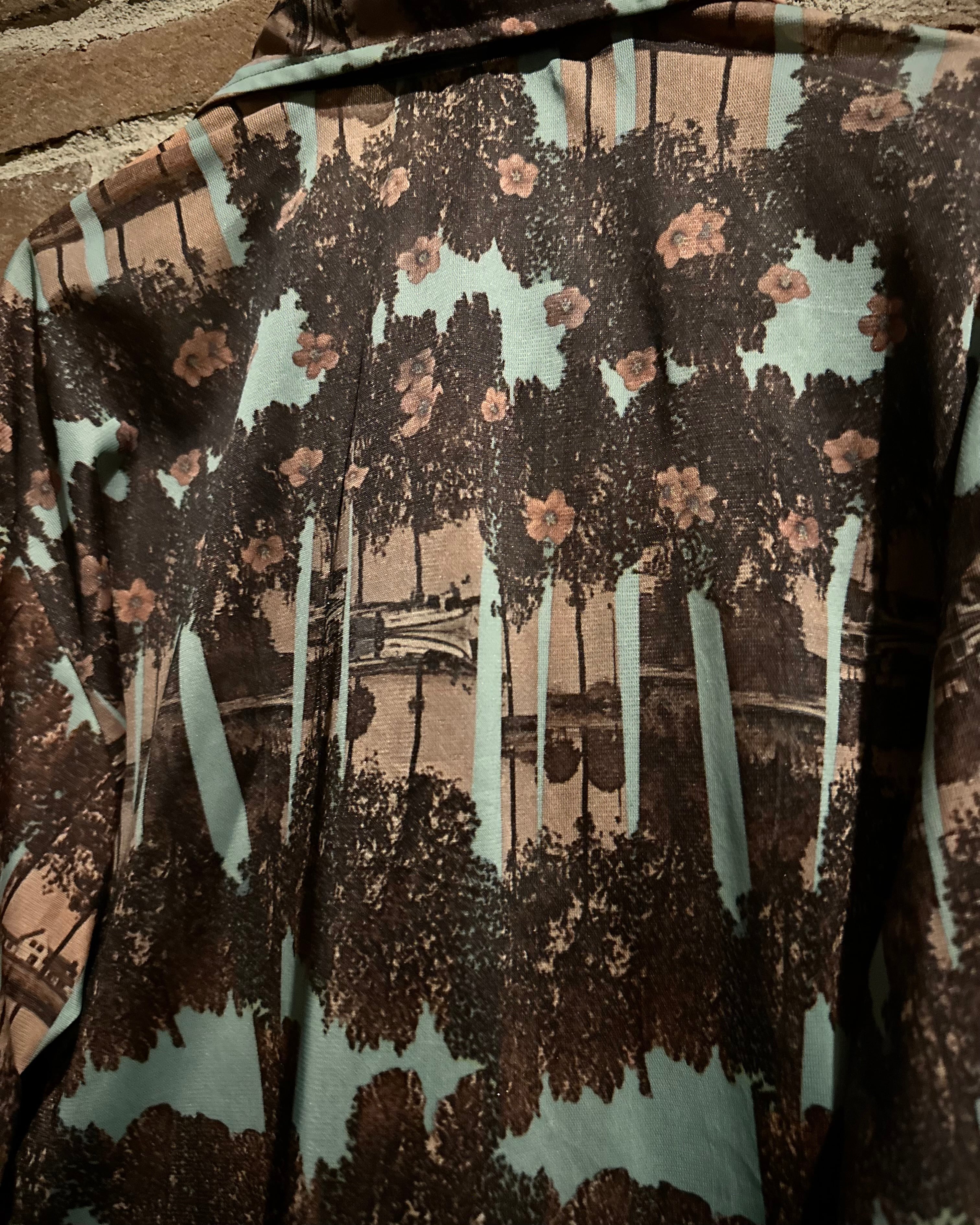 淡いミントグリーンとブラウンを基調とした配色の中に、風景や花々を転写。奥行きのある総柄が広がり、この年代ならではのレトロな雰囲気を漂わせています。