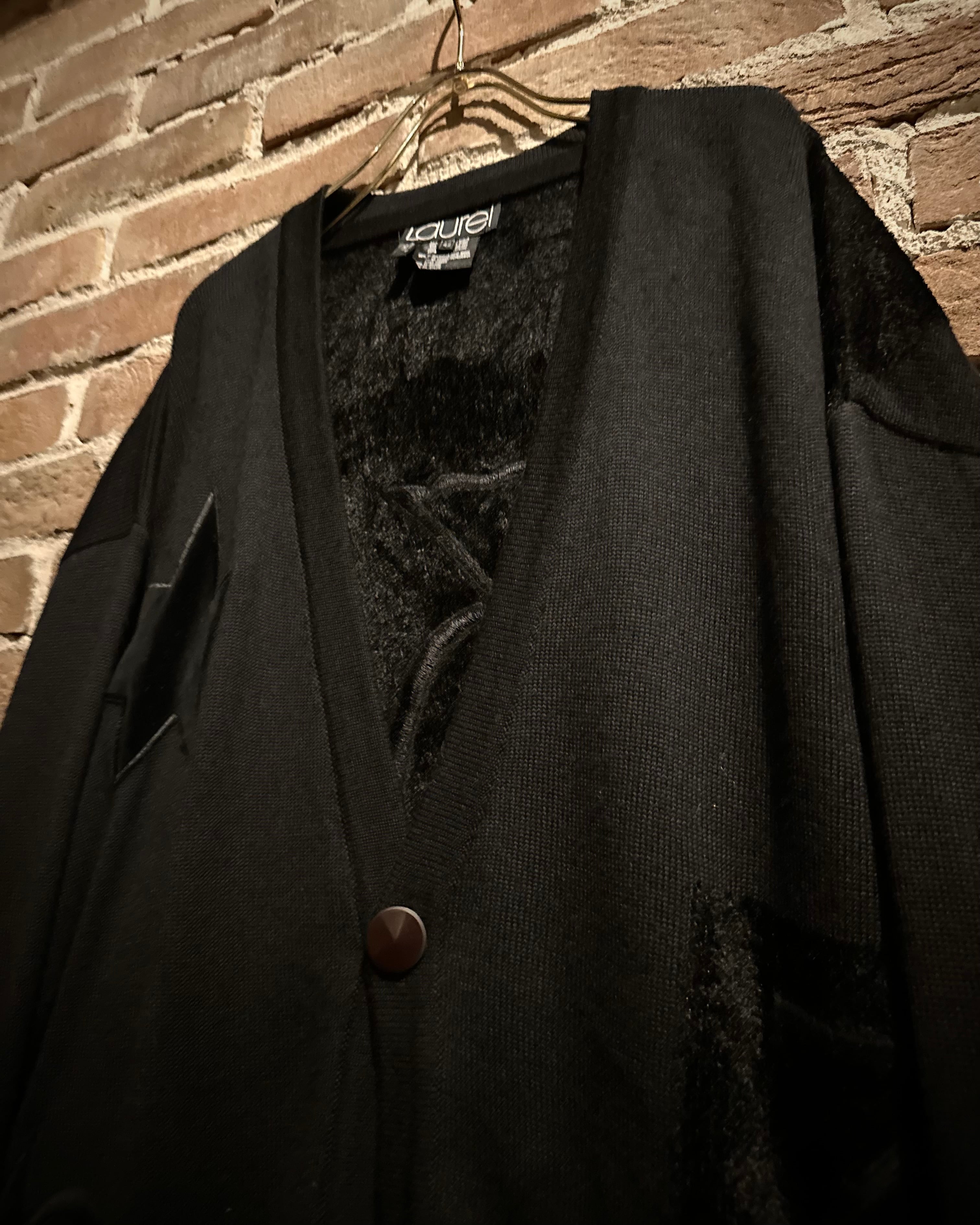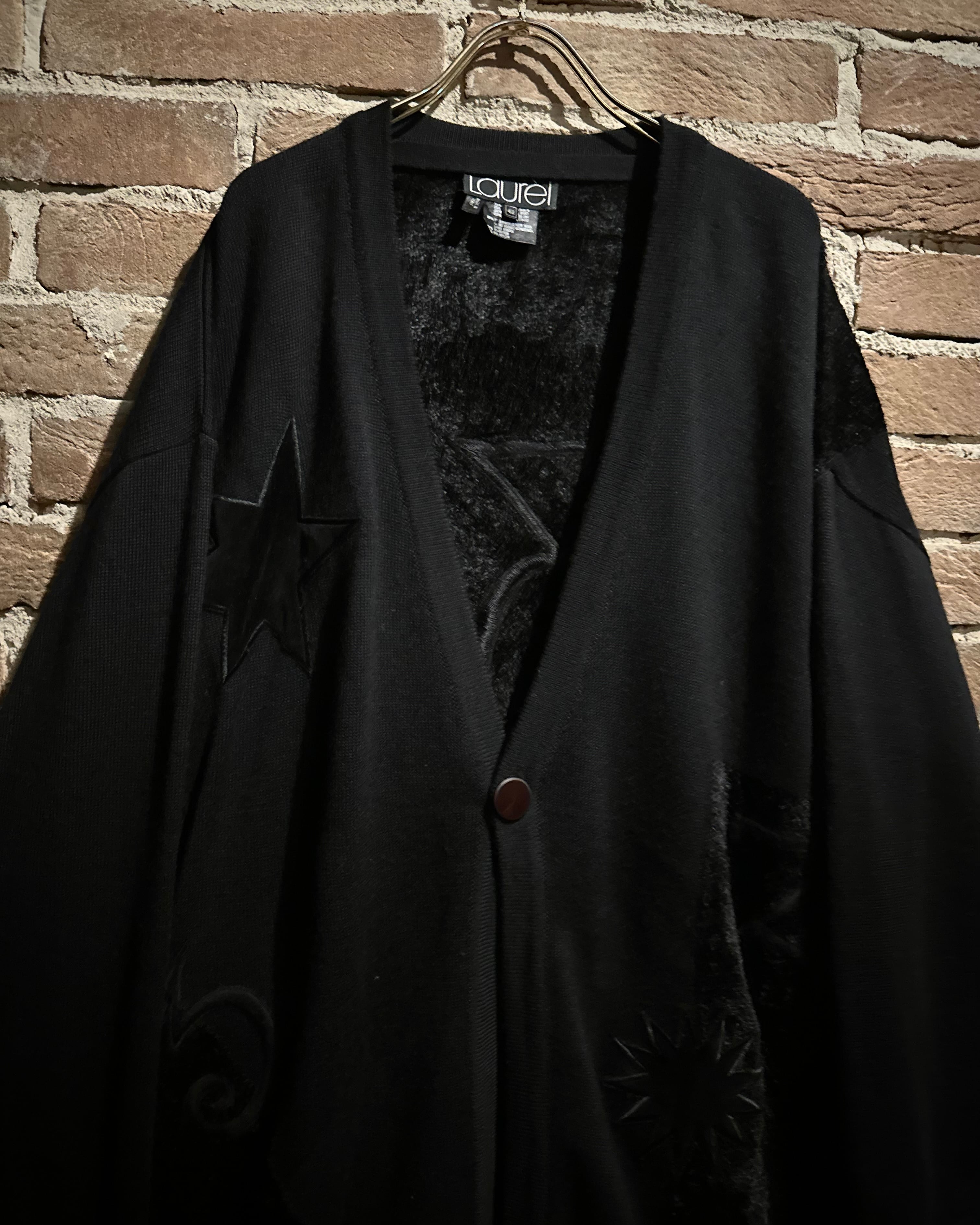 柔らかくライトなニット生地をベースに、シャギー調やベロア素材を星やスパイラルといった図形モチーフで切り替えたデザインカーディガン。
