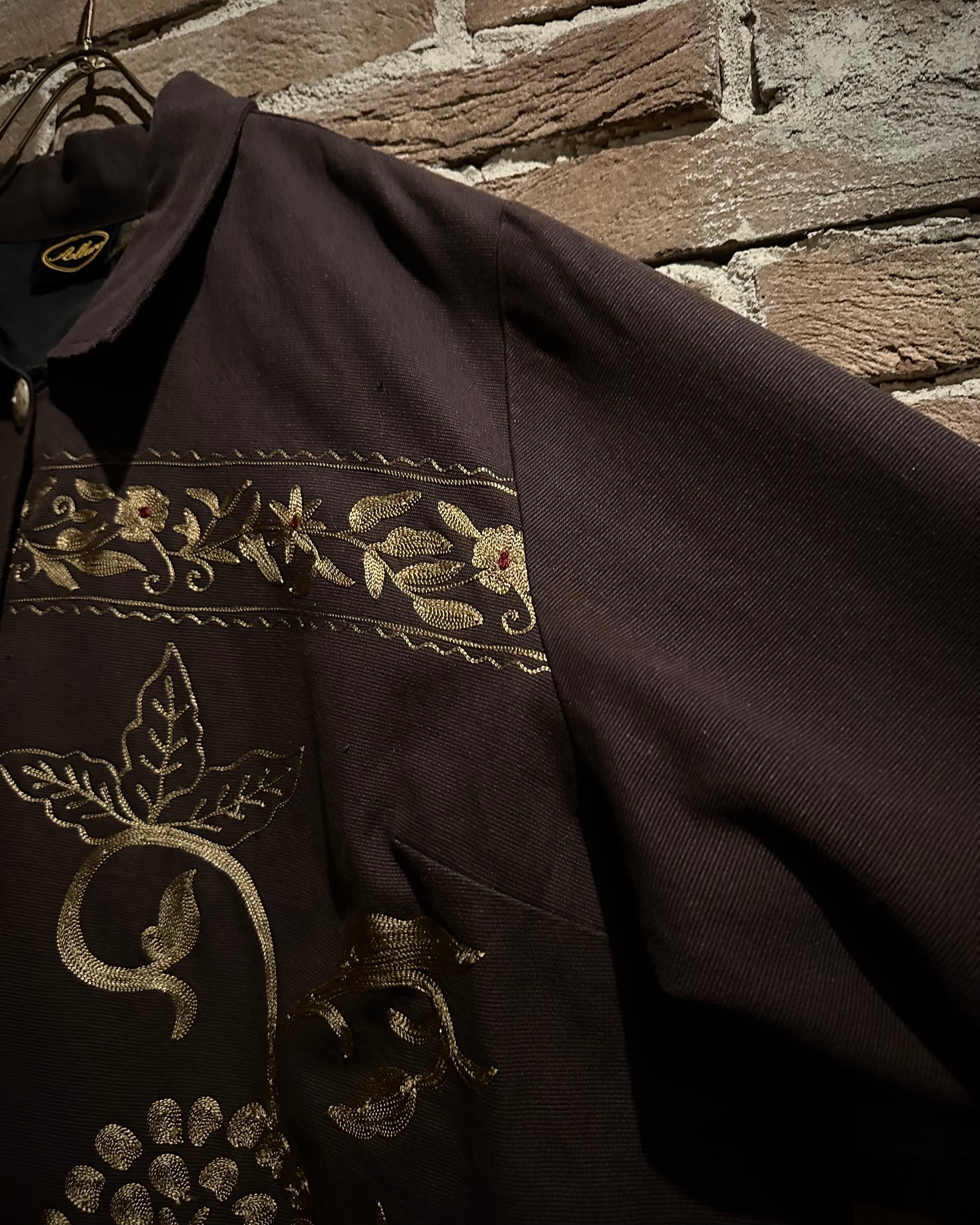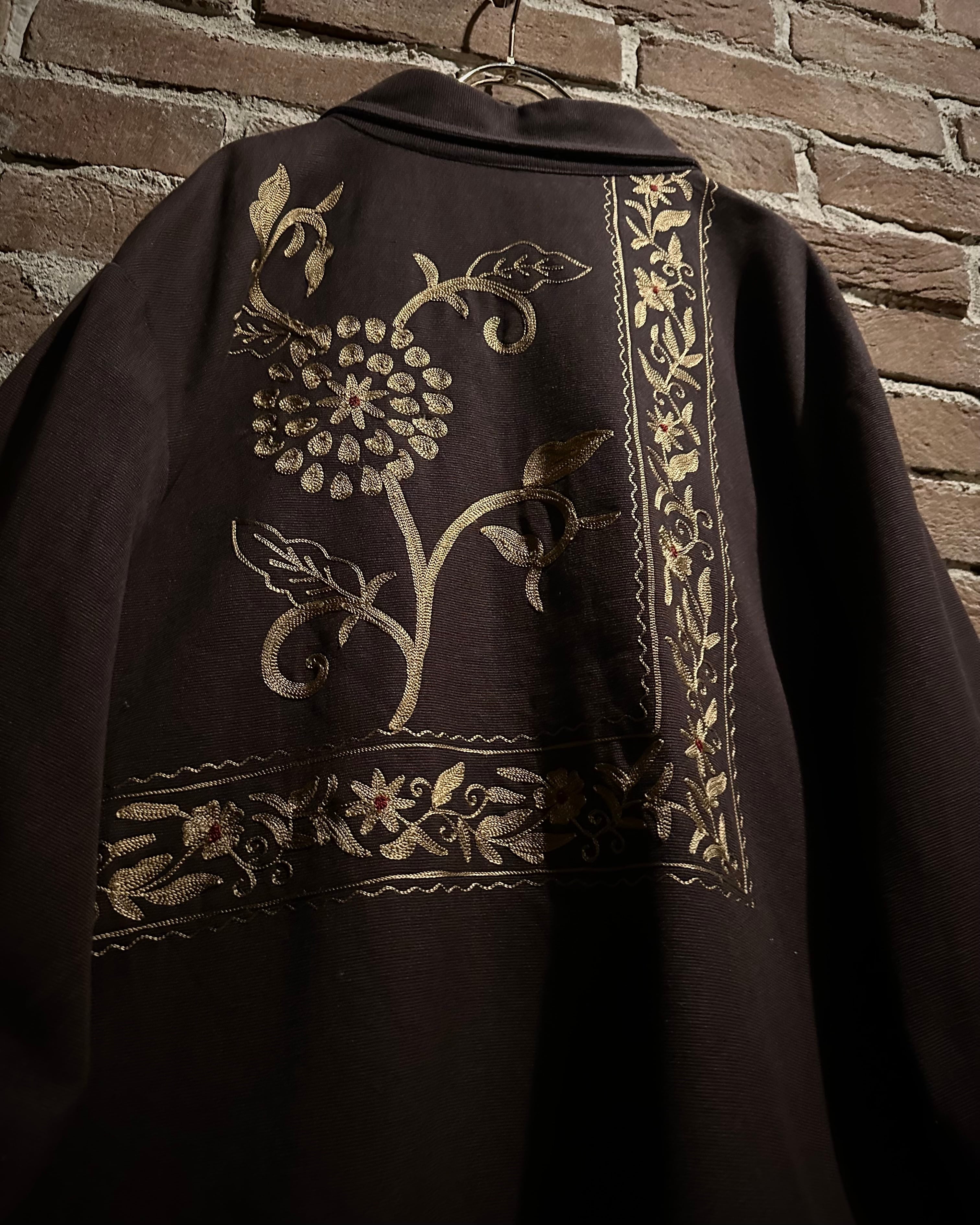 ブラウンのボディに、全面へと大胆に施されたゴールド刺繍が目を惹くスペシャルなジャケット。