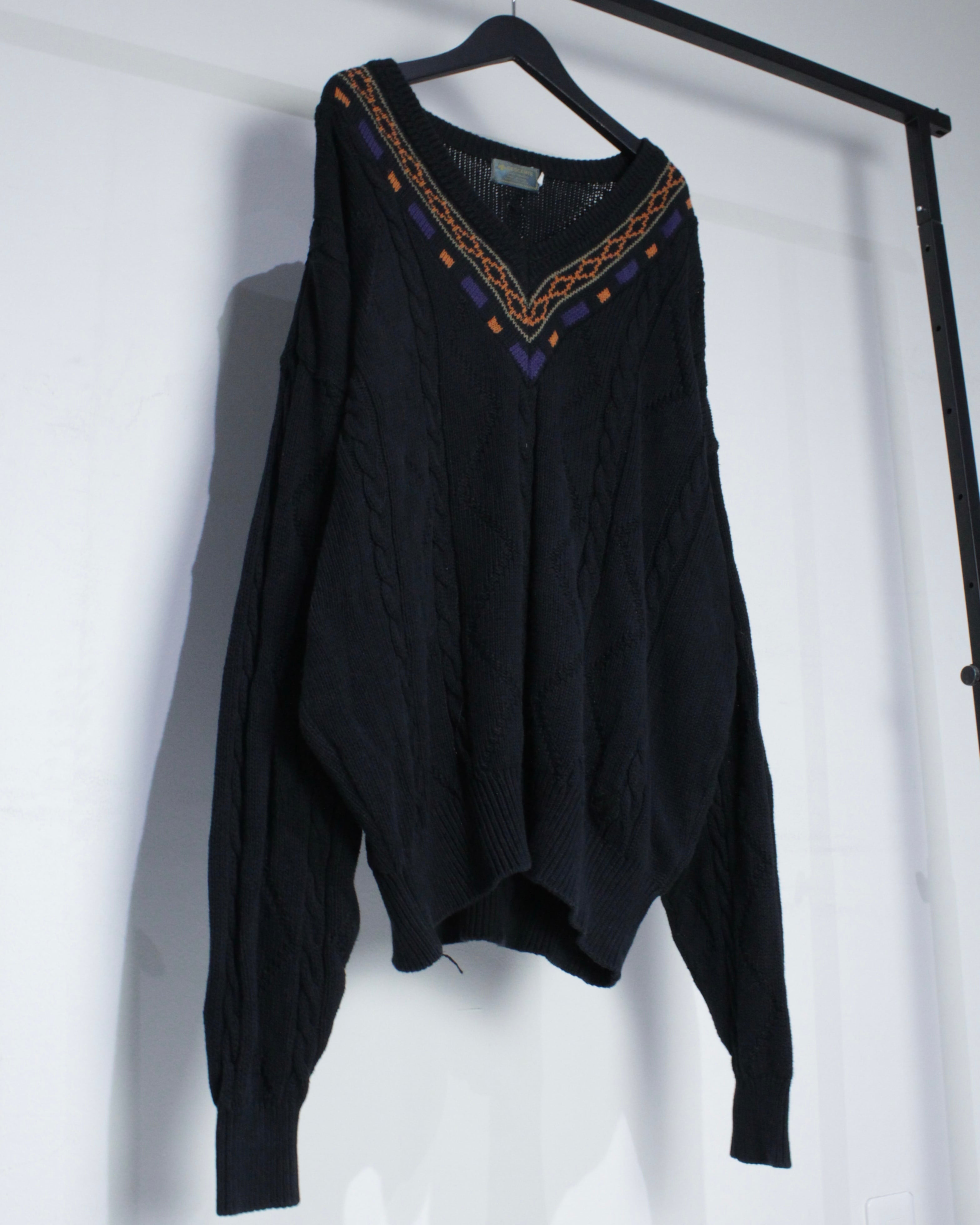 ネックラインにはオレンジ×パープル×ベージュのラインを配し、プレッピースタイルの王道を踏襲しながらも、カラーバランスによってモードな印象をプラス。一見ベーシックでありながら、日本製ならではの丁寧な編み立てと配色センスが光ります。