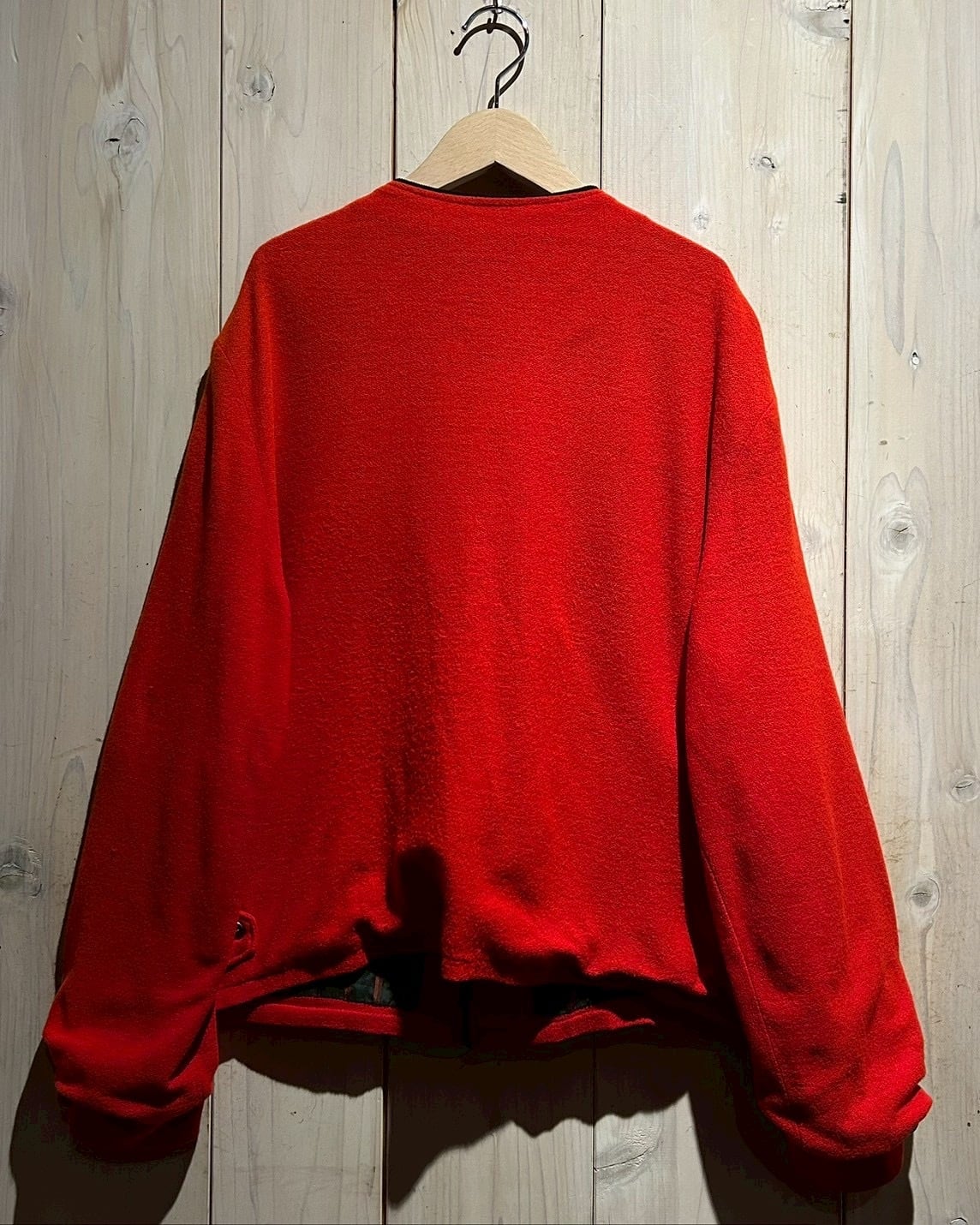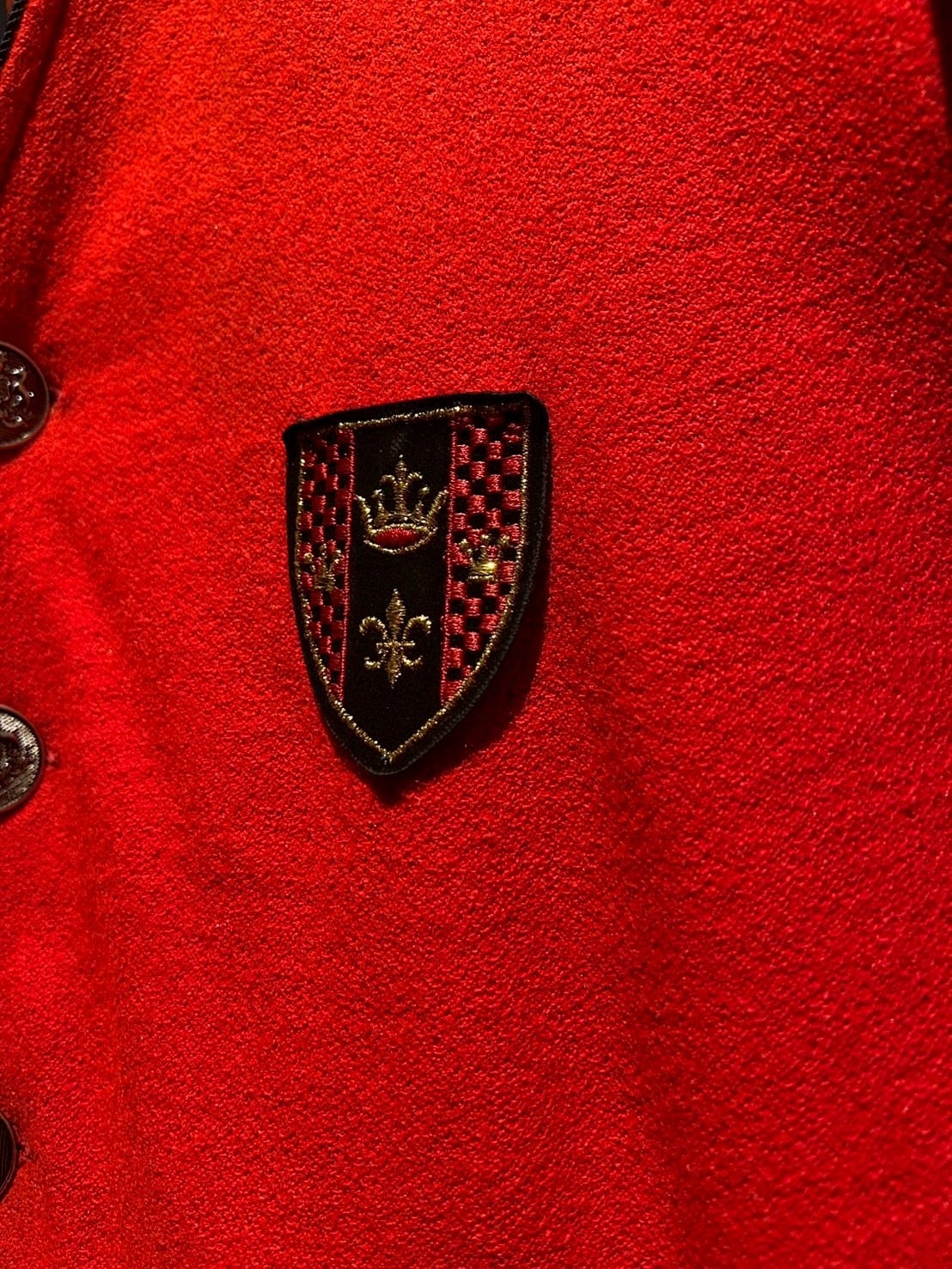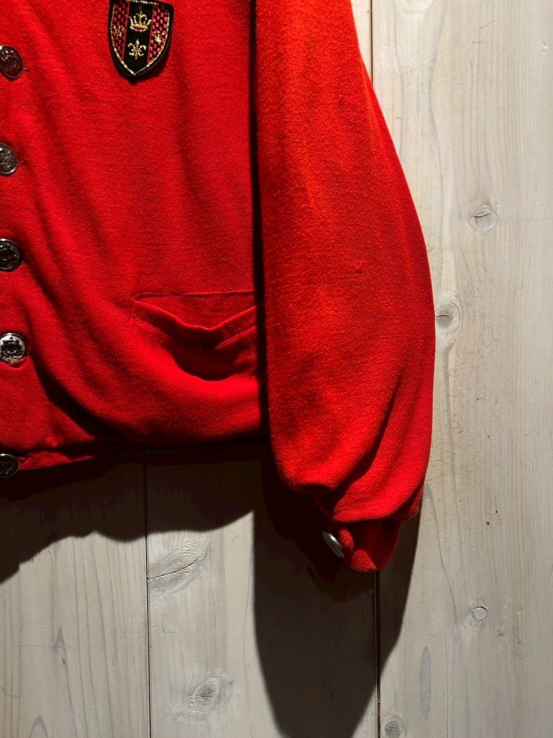 鮮烈な発色を放つディープレッドのウールボディに、ブラックのパイピングと胸元のエンブレムワッペンが絶妙なアクセントを添えた1着。