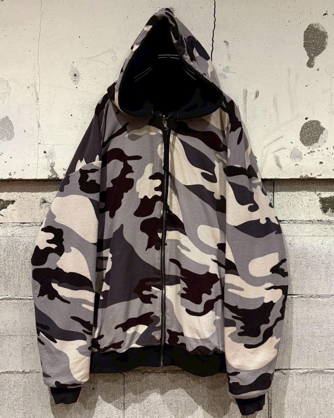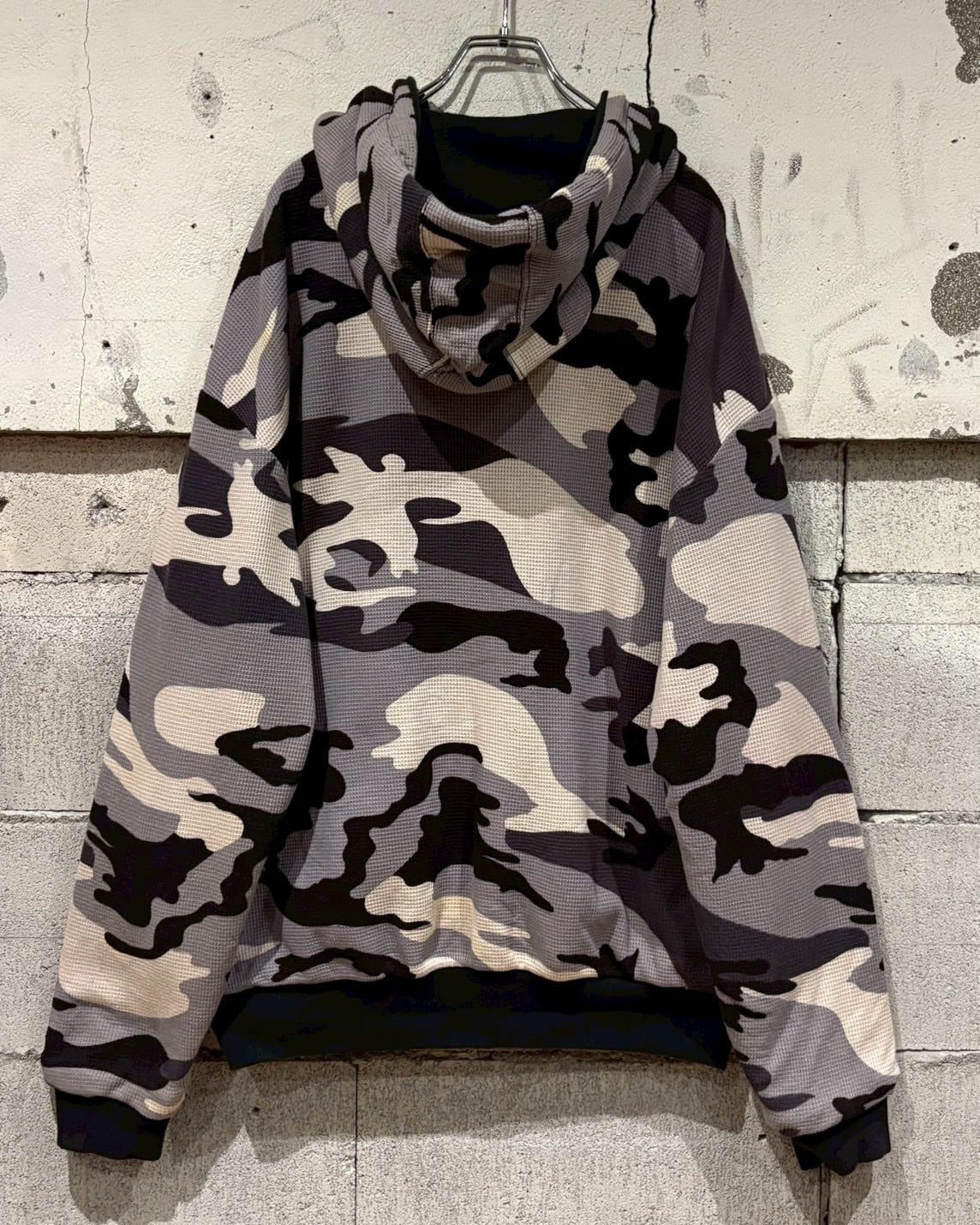 B面はグレー×ホワイト×ブラックのウッドランドカモを配したサーマル地仕様。立体感のあるワッフル組織が特徴で、通気性の良さと独特の凹凸感がスタイリングに奥行きをプラス。カラーリングは無骨ながらもモノトーンでまとめられ、都会的なモードスタイルにも馴染む万能な仕上がりです。