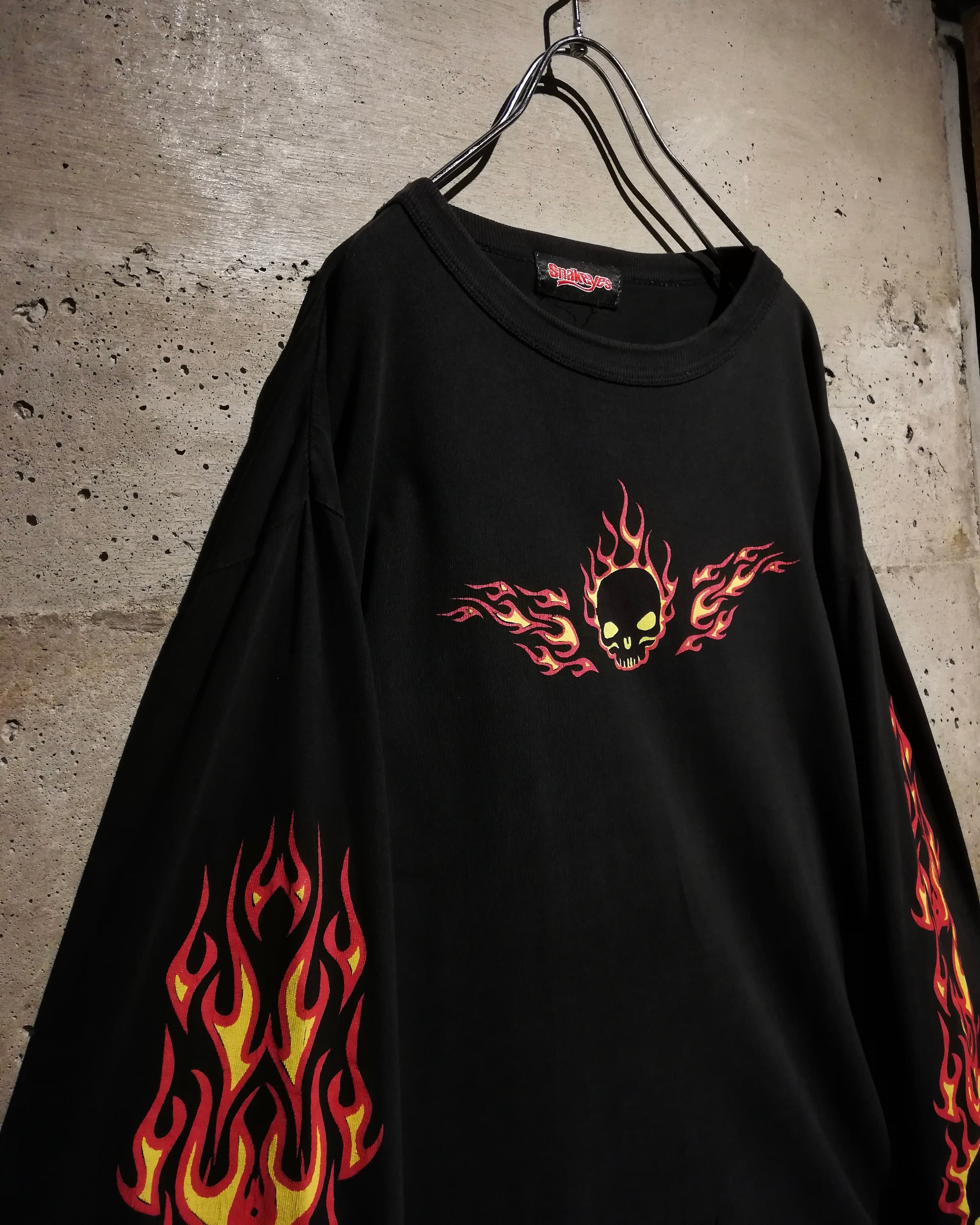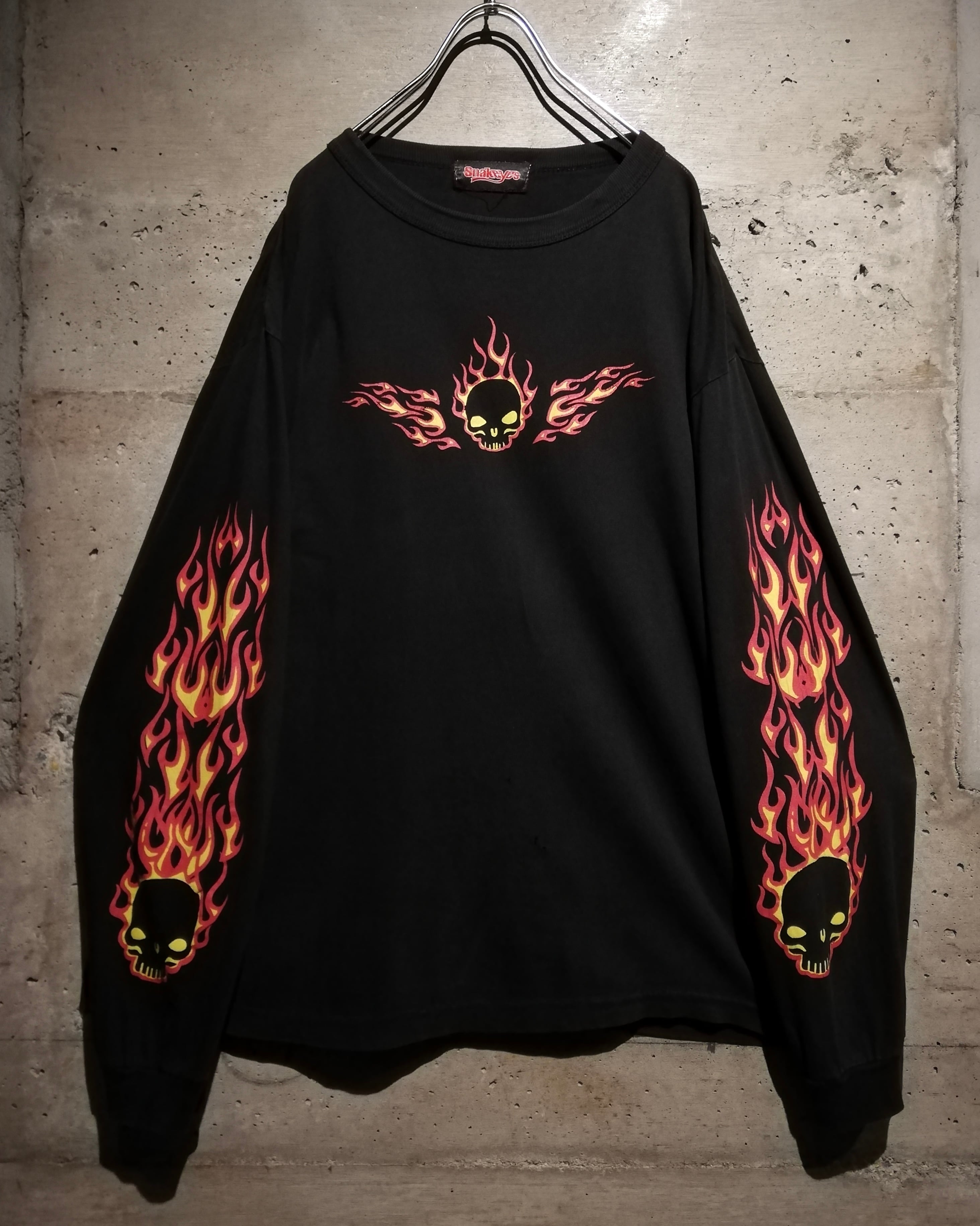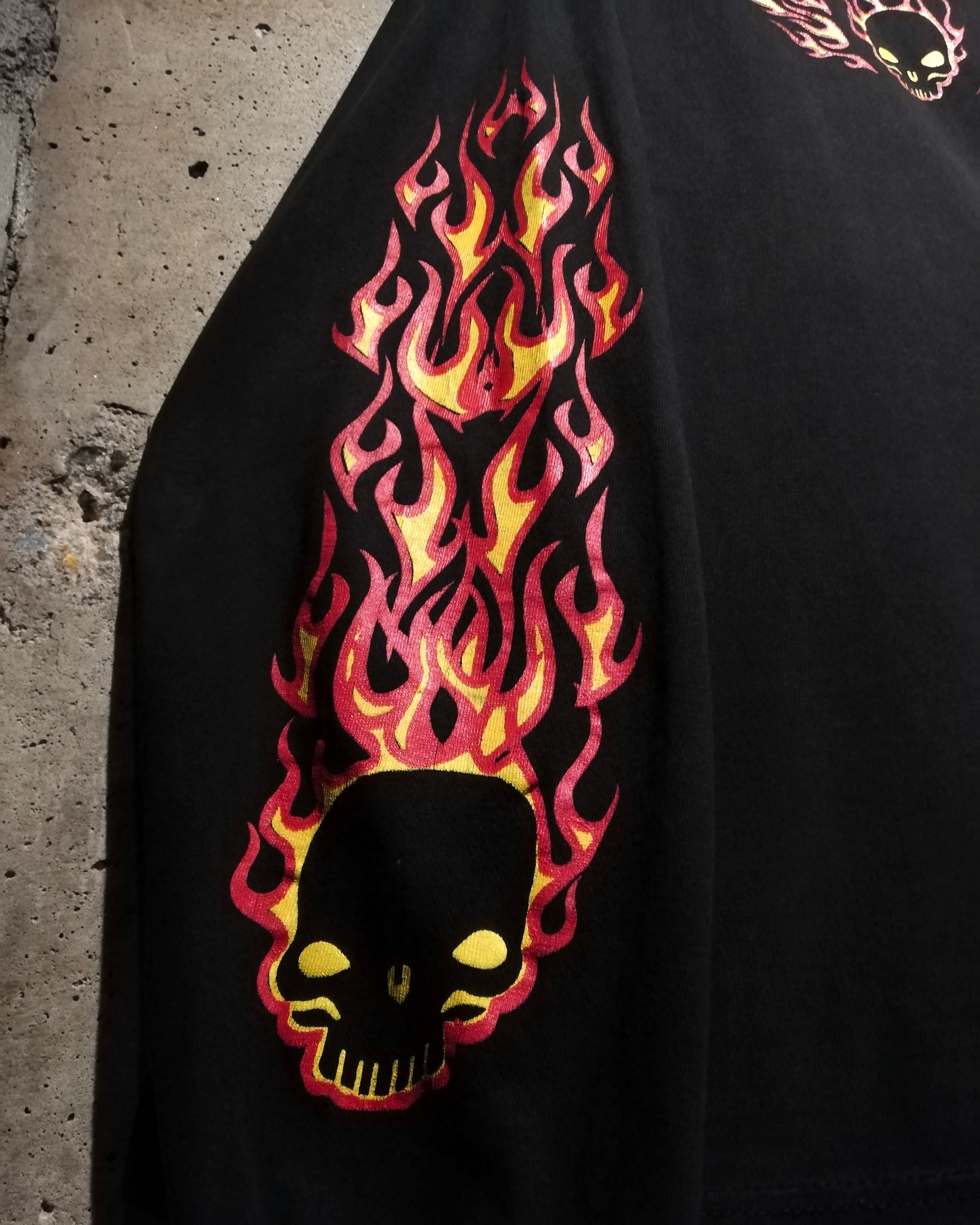 赤からイエローへと滑らかにグラデーションするファイヤーパターンに、燃え上がる炎の中に浮かび上がるスカルモチーフが、当時のストリートカルチャーを象徴するデザインとして際立っています。