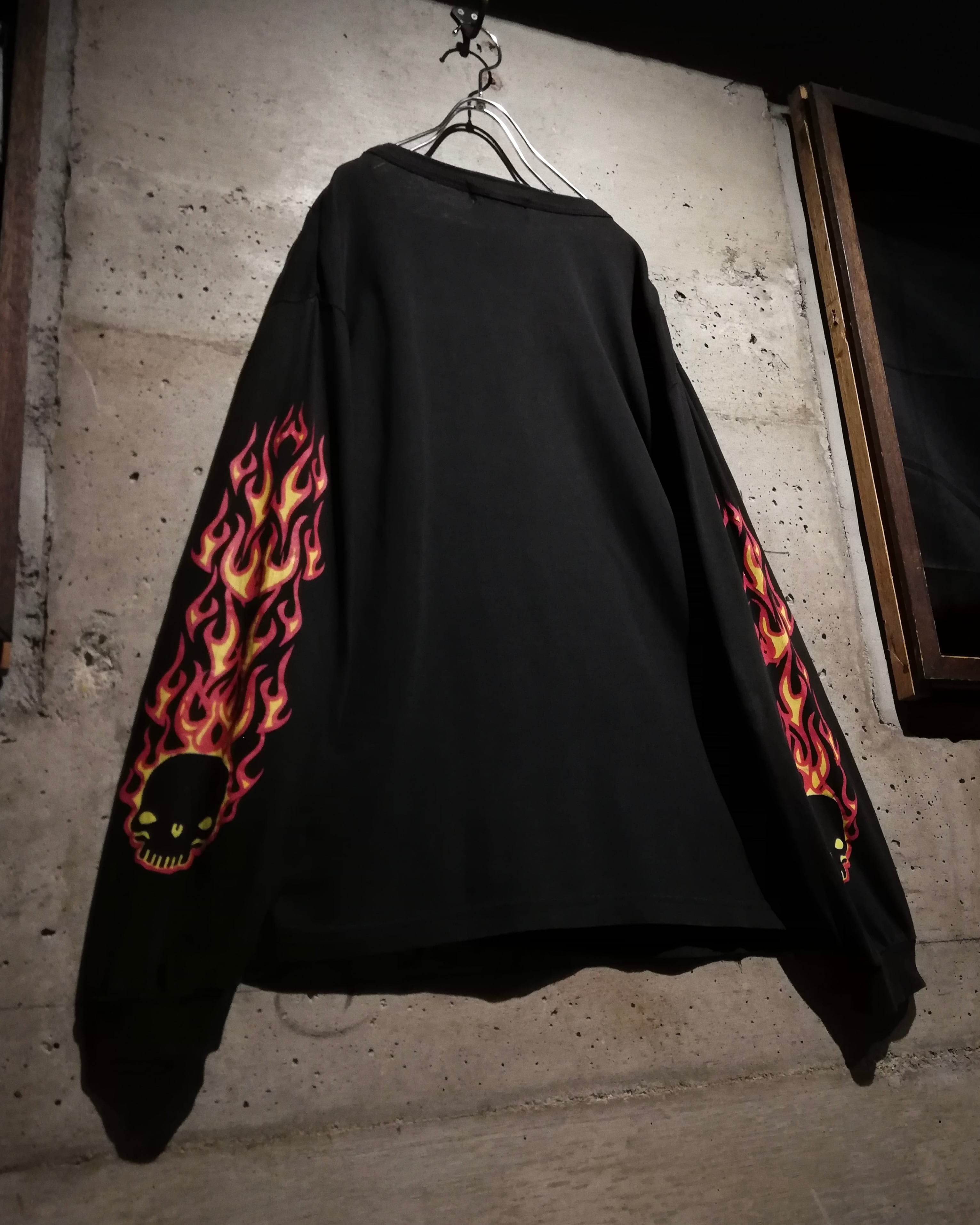ブラックボディをベースに、胸元と両袖にフレイムスカルのグラフィックを大胆に配した1着。