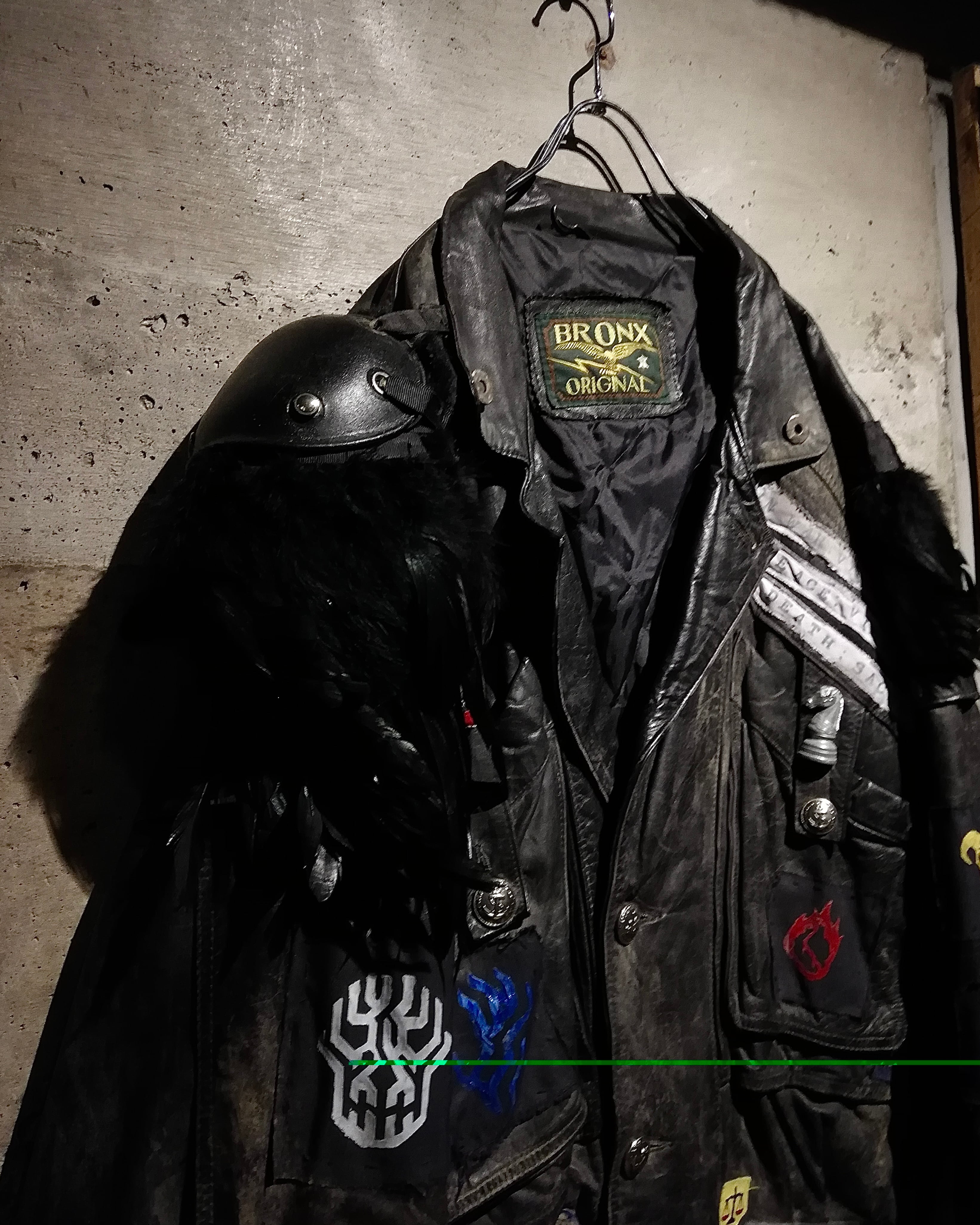 胸元には古いメダリオンやチェスピース、レタリングのリボンパッチ。背面には炎をまとった立体的な“MACE RAGE”のペイントと、まさに一点モノの手作業カスタムならでは。ステージ衣装やファッションアートの域に達する完成度です。