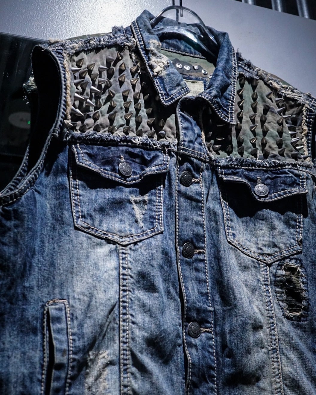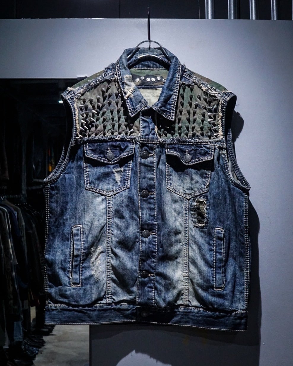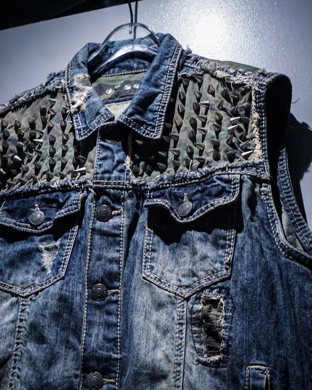 ボディはリアルなフェードデニムがベース。程よいウォッシュとアタリが生み出す立体的な色落ちが、ヴィンテージ特有の深みを感じさせます。肩にはカモフラージュ生地をパッチワークし、その上からメタルスタッズを規則的に打ち込むことで、無骨さとアヴァンギャルドなムードを融合。フリンジ状のカットオフがクラフト感をさらに強調しています。