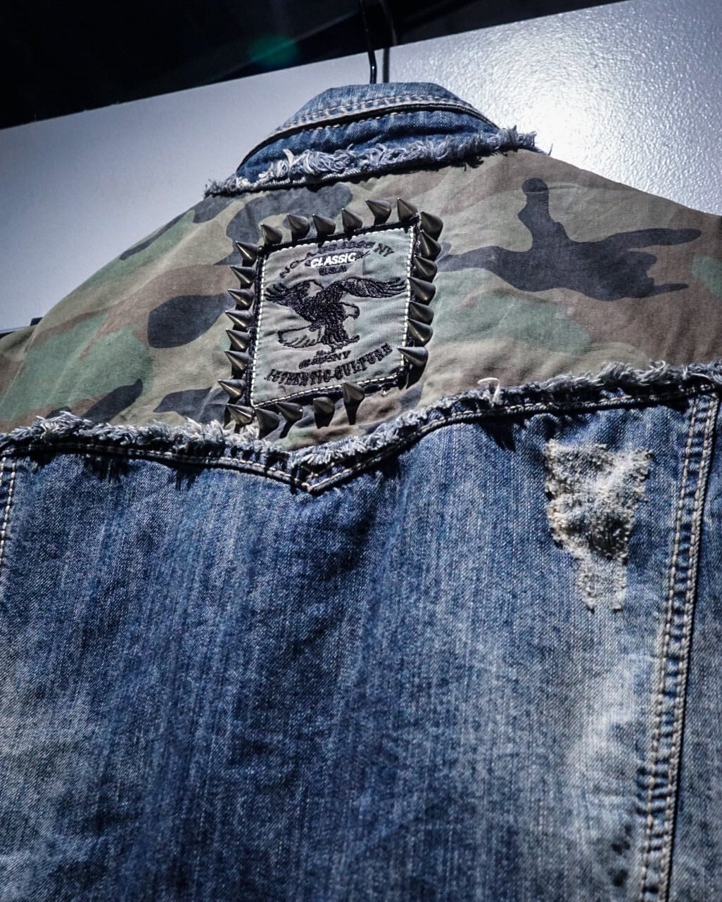 ヴィンテージデニムボディをベースに、ミリタリーファブリックを大胆に切り替え、スタッズやパッチをハンドワークで打ち込んだスペシャルな1着。