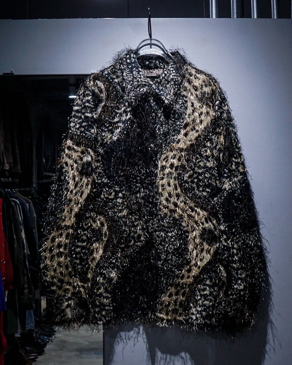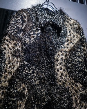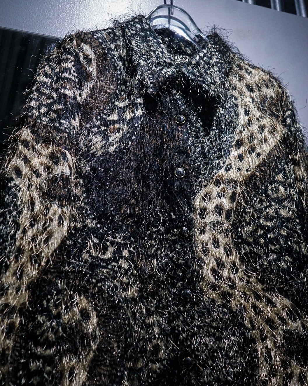 ボディ全体を覆うのは、毛足の長いシャギー糸を織り交ぜた立体的な編地。光沢のあるファイバーがランダムに煌めき、ブラックやブラウン、ゴールドトーンを織り交ぜたレオパード調のアニマルパターンが艶やかに浮かび上がります。