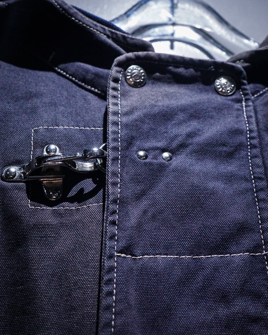 フロントにはファイヤーマンバックルを大胆に配置し、ジップ付きの比翼仕立てを採用した二重構造。開閉ギミックの重厚感と機能性を兼ね備え、防風性、保温性ともに優れた本格仕様のアウターに仕上がっています。
