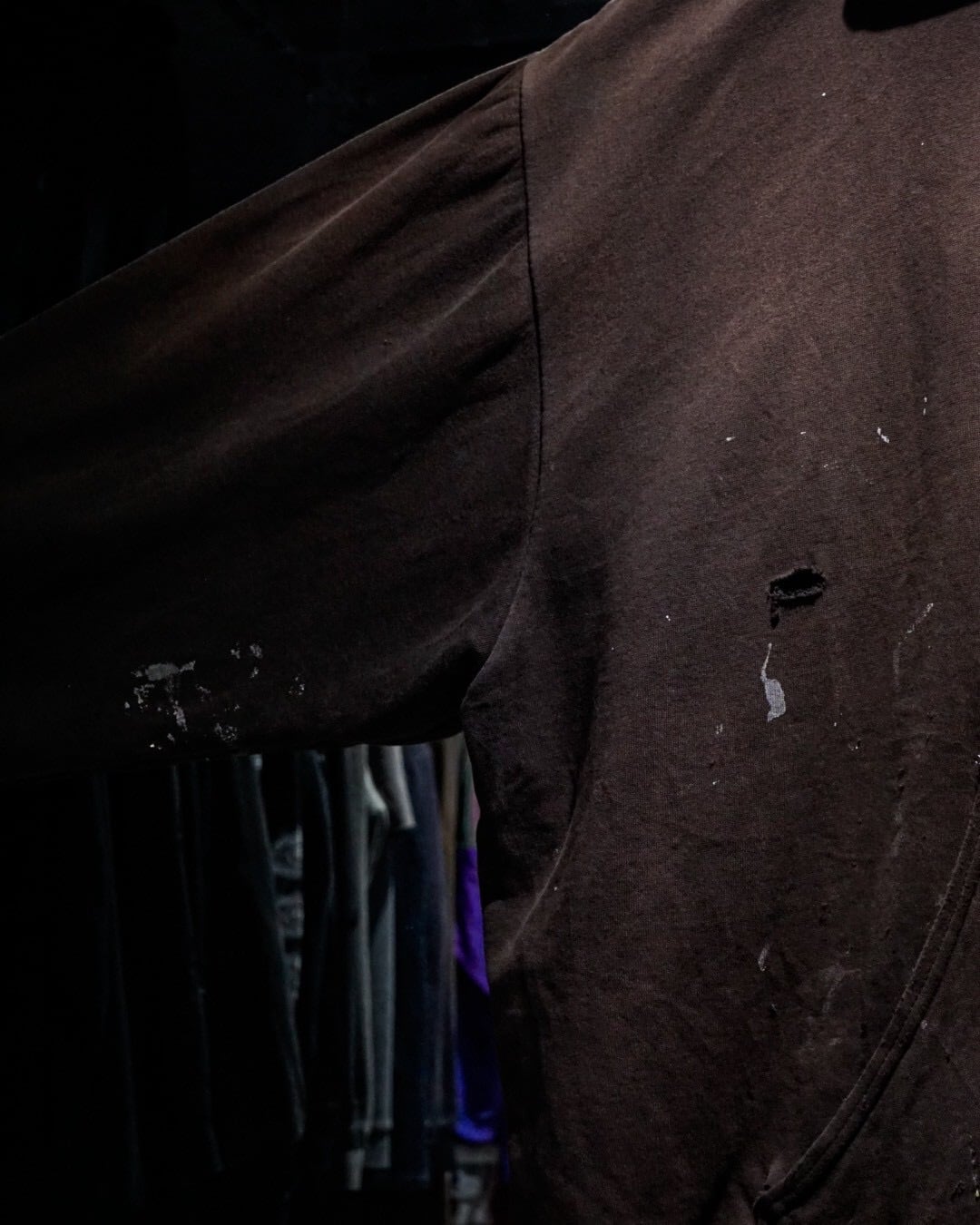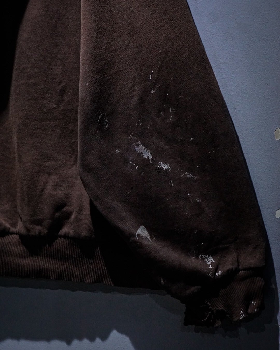 褪色した色味に、塗料の付着跡や無数のダメージ、リペア跡が重なり、リアルなワークシーンを生き抜いた痕跡が一目でわかる迫力の表情。