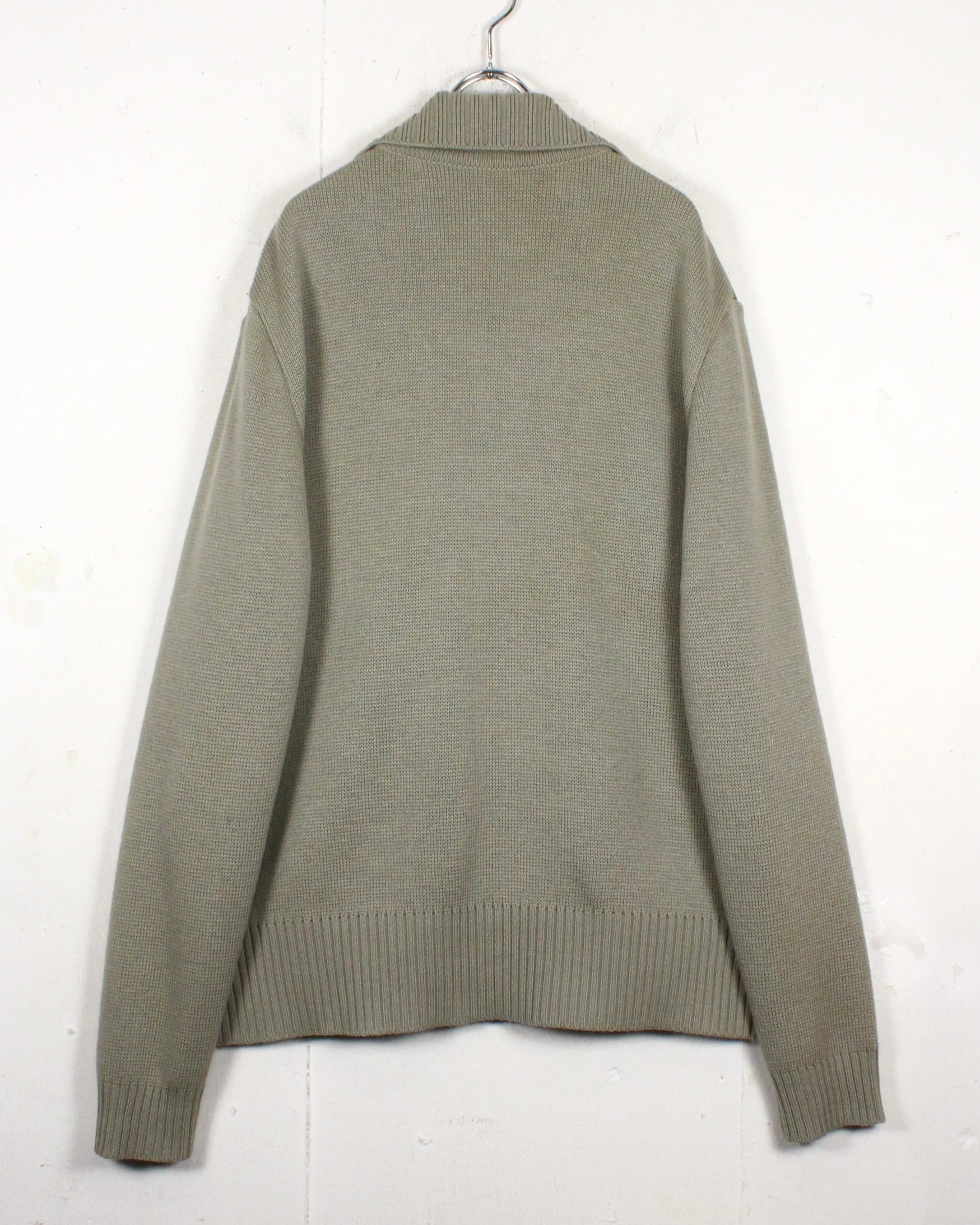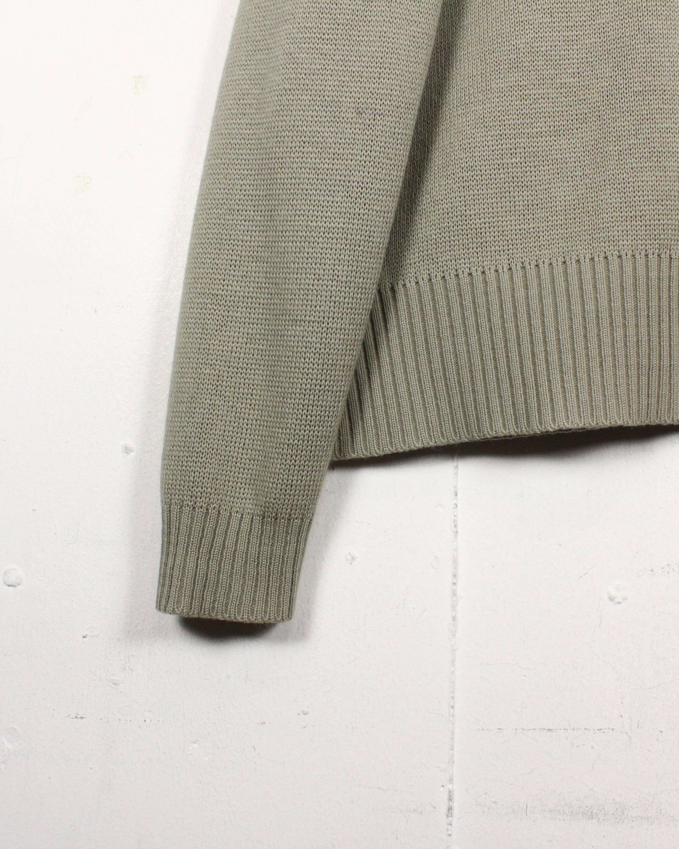 ややグレイッシュなセージトーンのワントーン構成が美しく、同系色の異素材コントラストが静かな存在感を放ちます。立体的に編み立てられたリブ襟とフラップポケット、そしてウエストリブまでの切り替えラインが全体を引き締め、無骨さの中に洗練された印象を添えています。