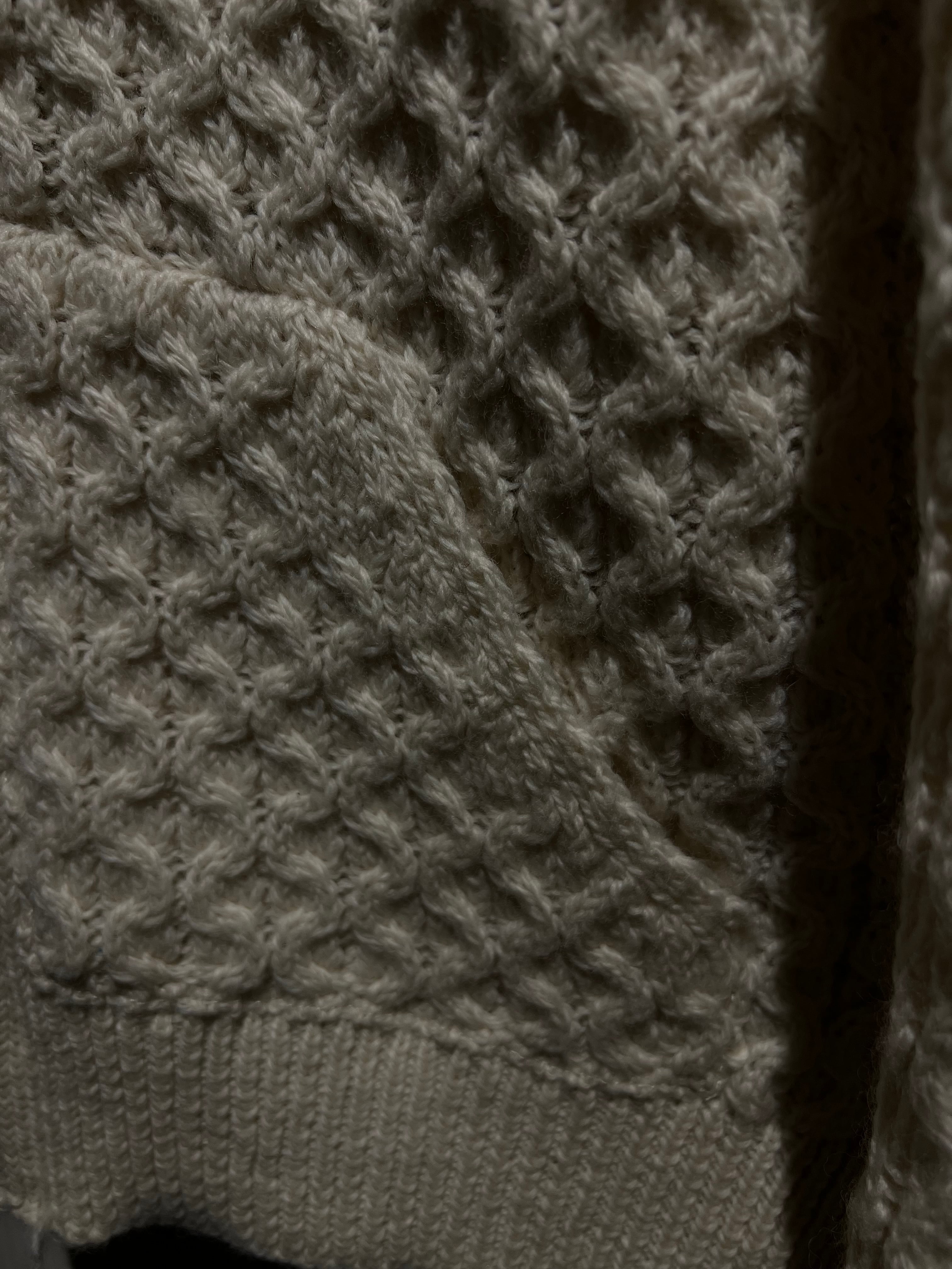 立体感のある伝統的なケーブル編みが全面に走り、クラシックながらもラグジュアリーな印象に仕上がっています。
