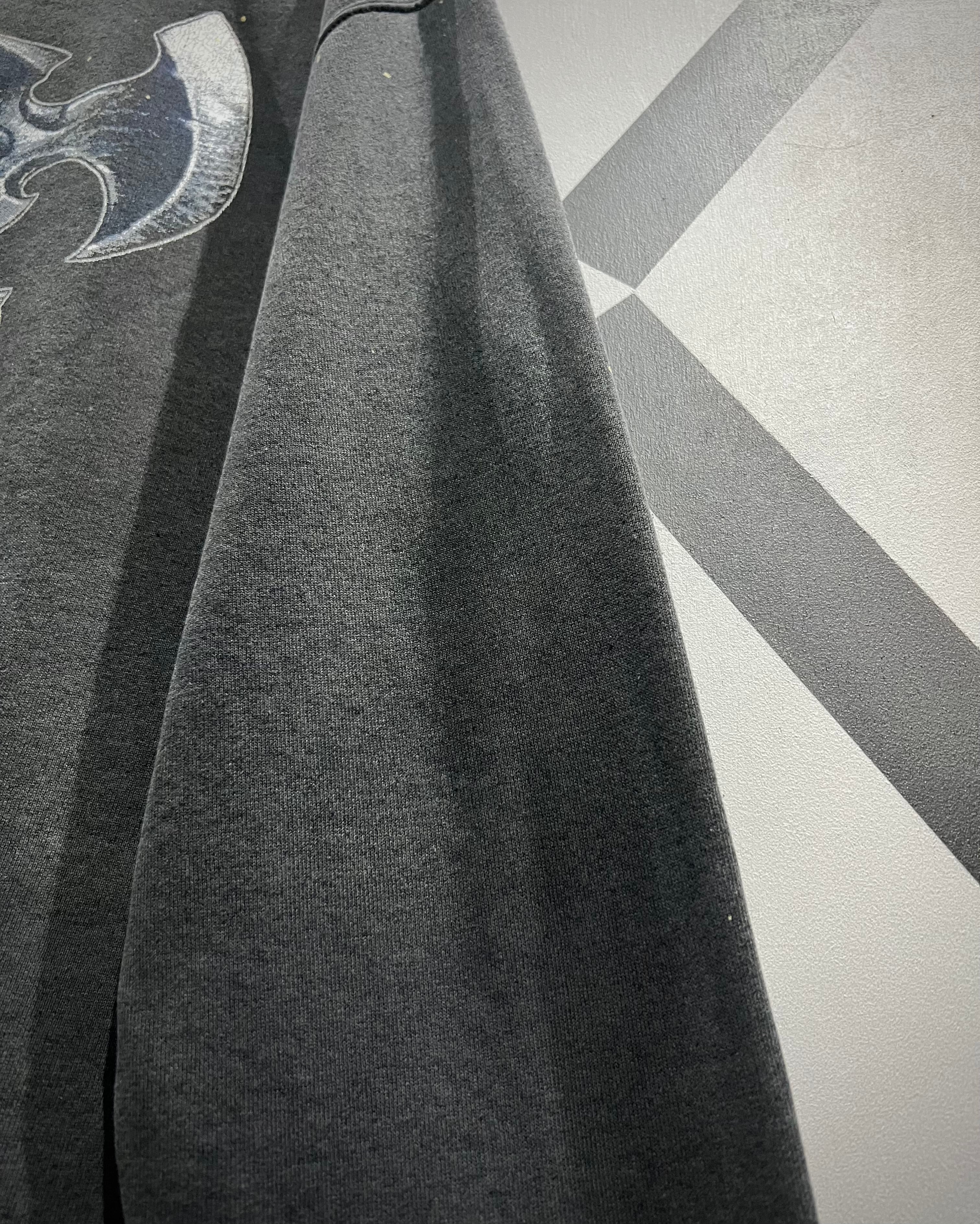ブラックボディに赤と白のコントラストで描かれたゴシックロゴとメンバーのフォトプリントが印象的。フロントには炎のような赤のグラデーションが走り、背面には斧をモチーフにしたバンドシンボルがプリント。ヘヴィメタルらしいダークな世界観が漂います。