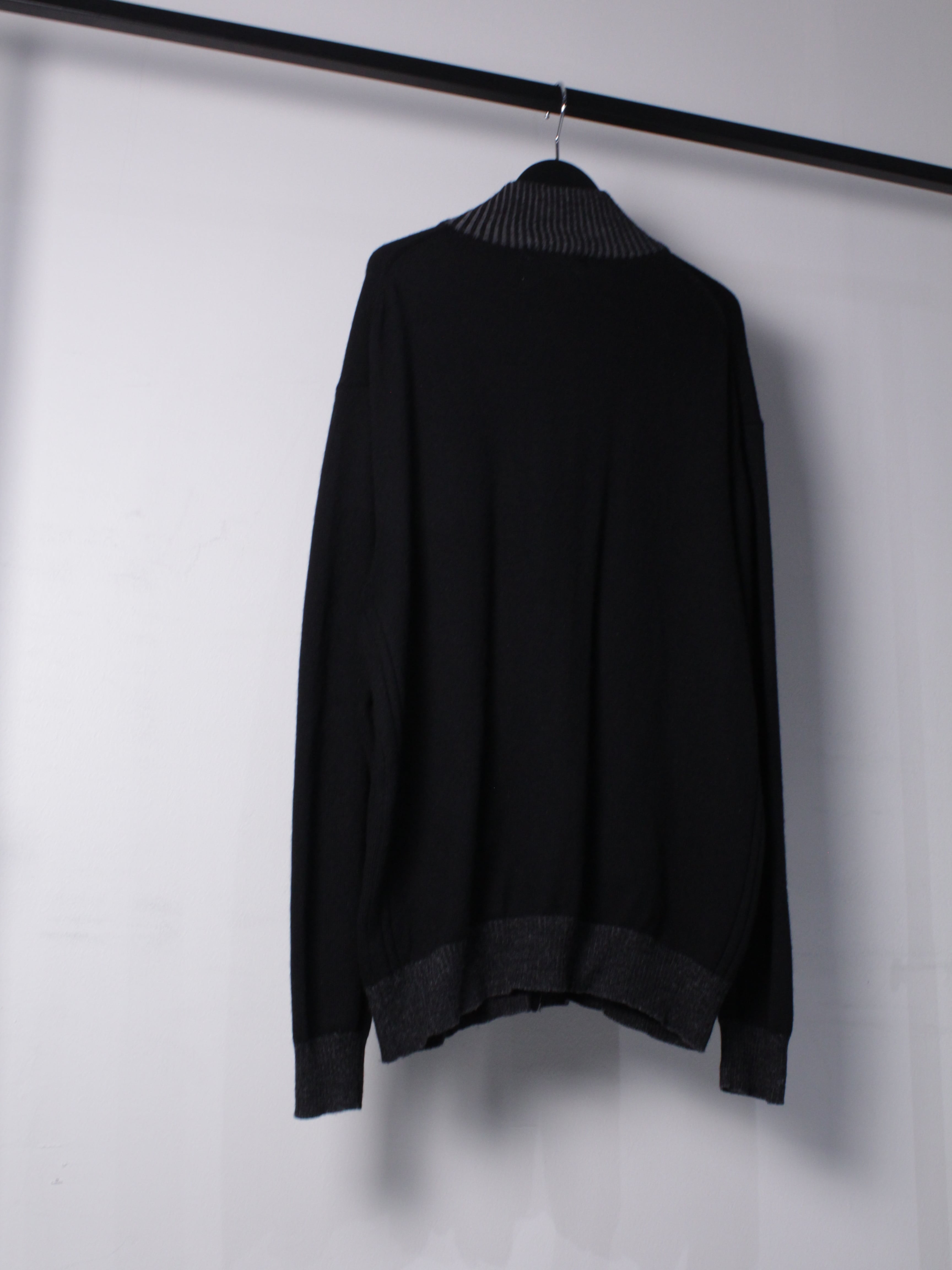 シルエットは程よくルーズで、肩のラインを自然に落としたリラックスフィット。無駄を削ぎ落としたデザインながら、立体的な襟や配色リブが確かな存在感を放ちます。