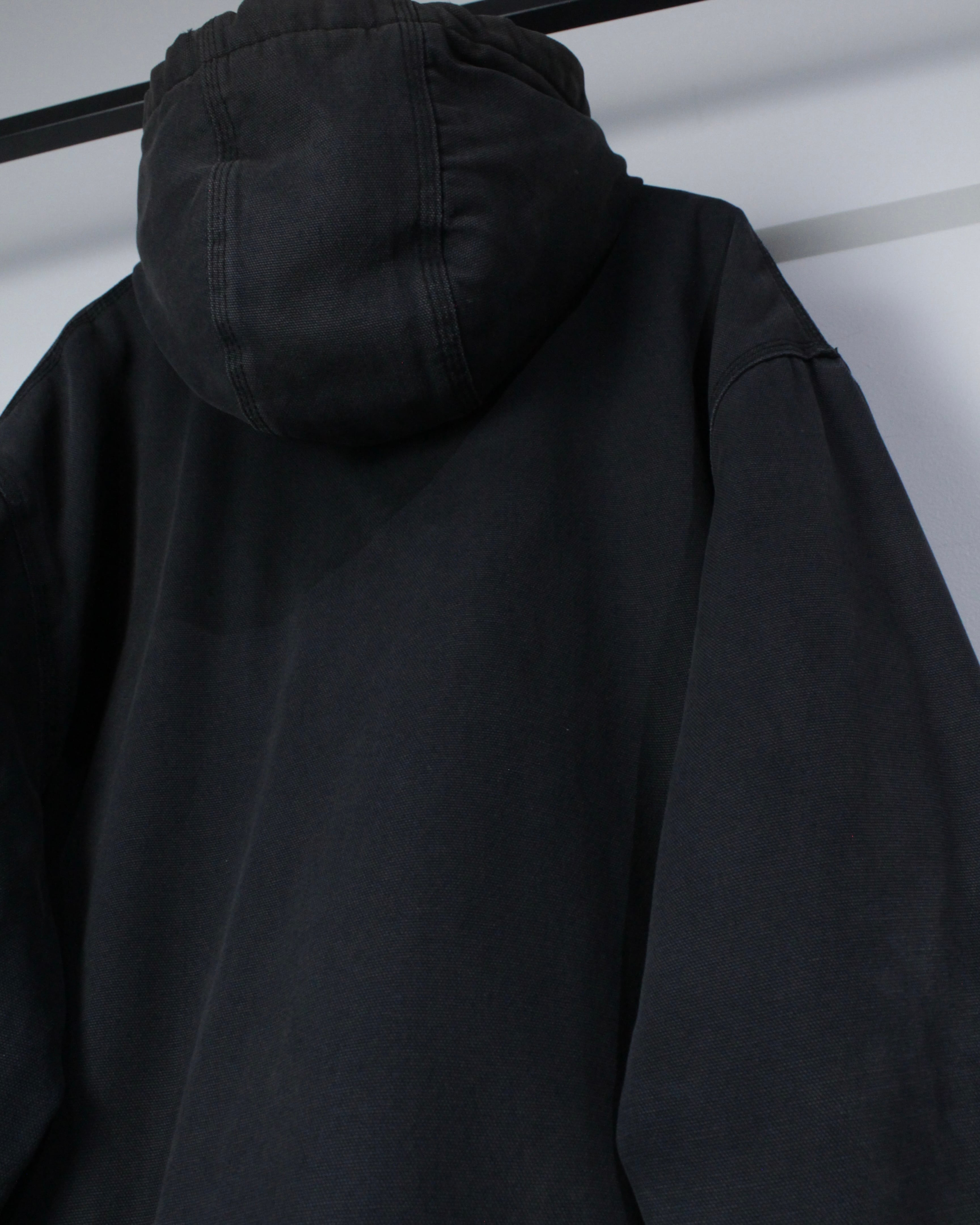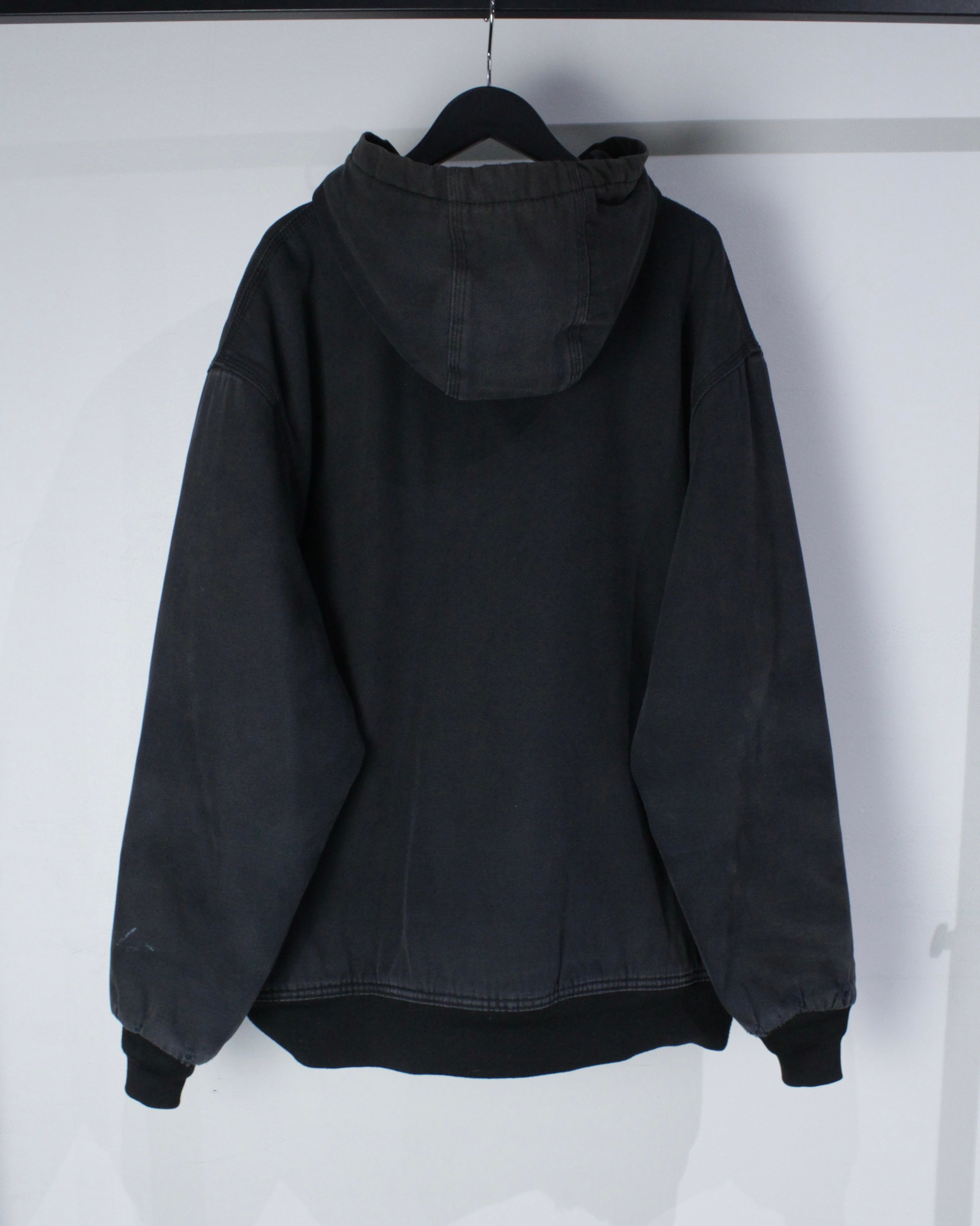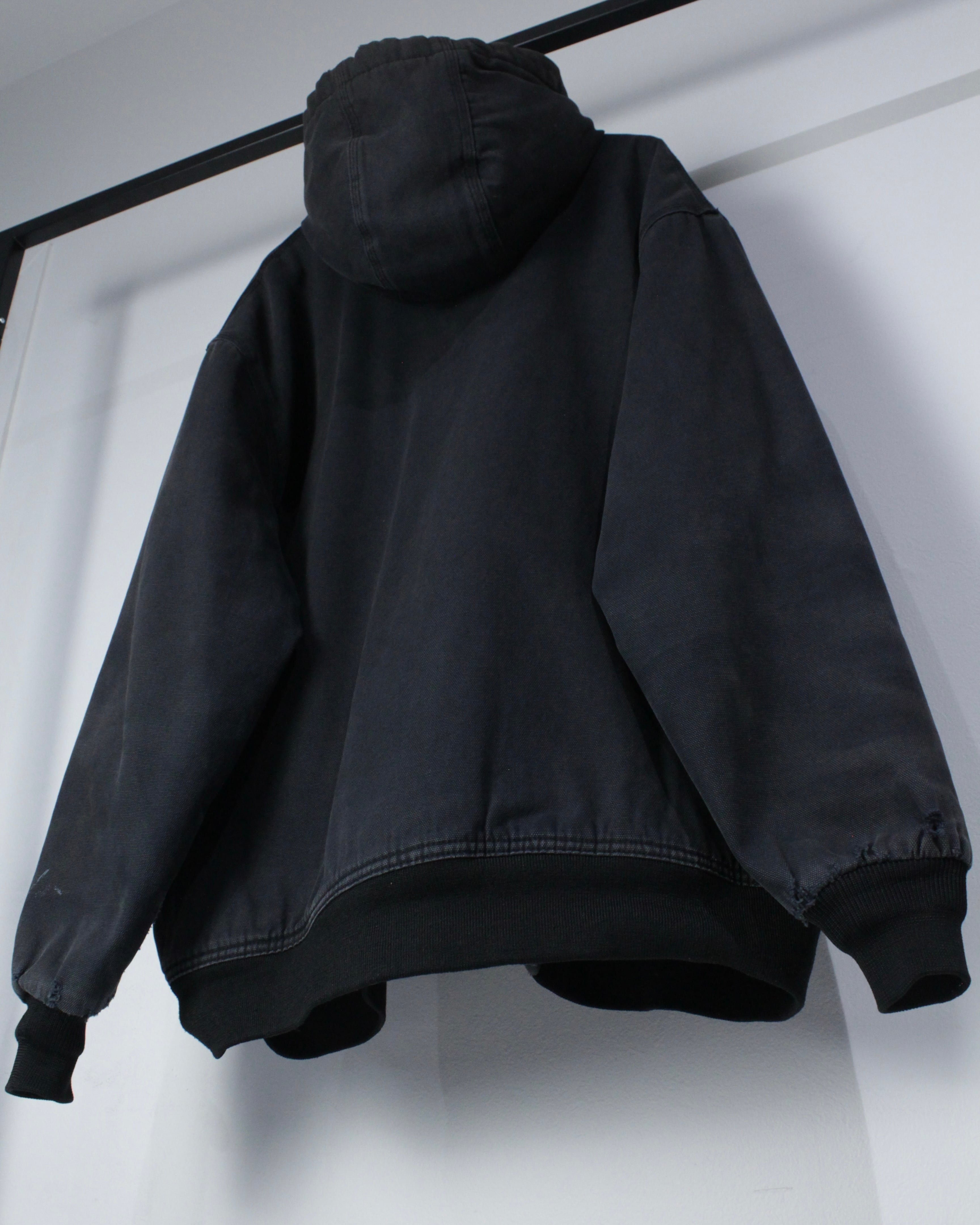 肉厚なダック地ボディは長年の着用を経て柔らかく馴染み、程よいアタリとスレによって黒が褪色した絶妙なトーンバランスに。現行では決して再現できない古着特有のムードを放ちます。