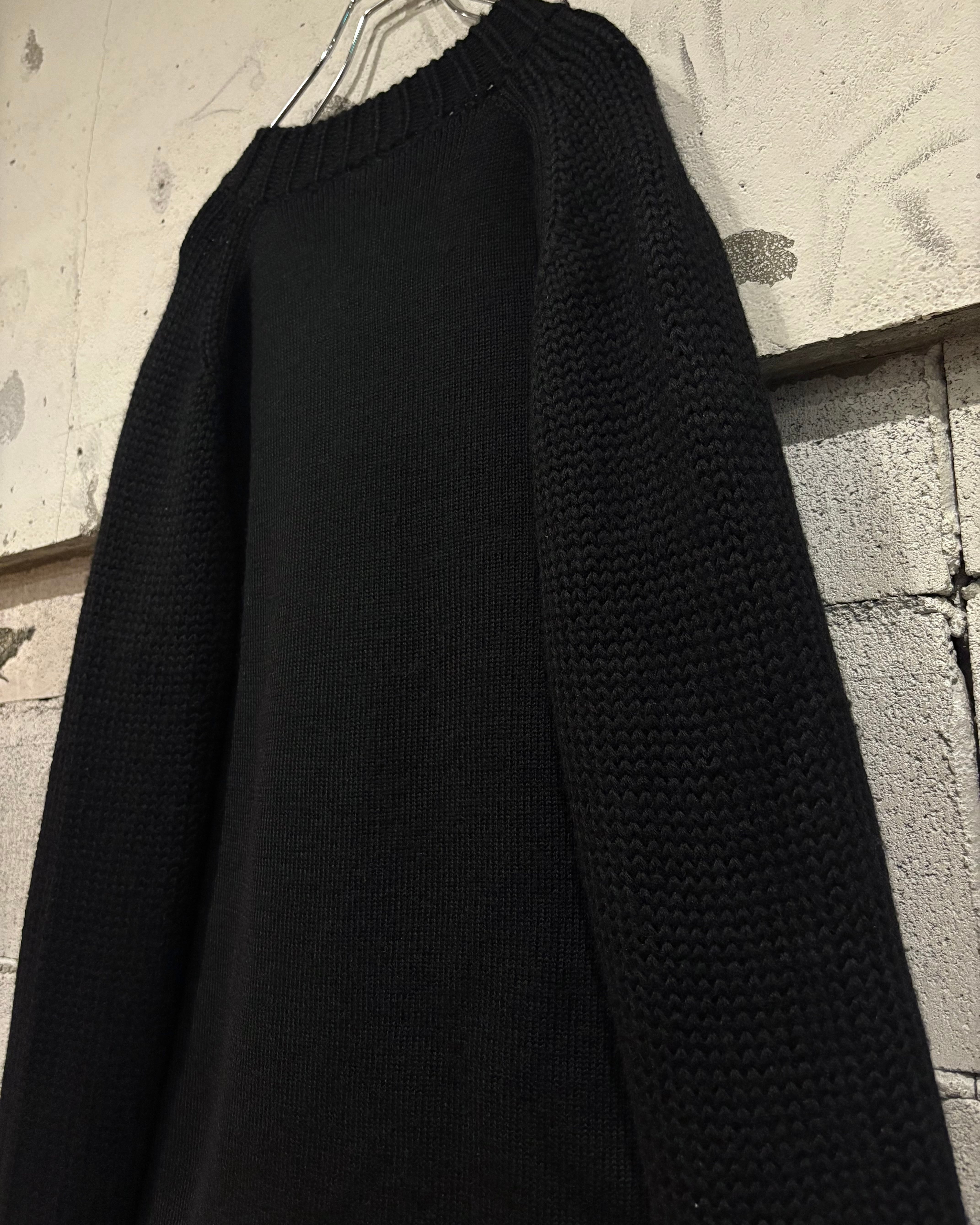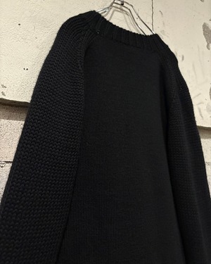 ボディ部分は細かい天竺編みでクリーンに仕上げられ、対してアームやショルダーはざっくりとしたローゲージの編地を採用。異なる編み地の切り替えが立体的な表情を生み、シンプルながらも奥行きのあるデザインに仕上げられています。