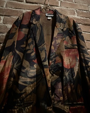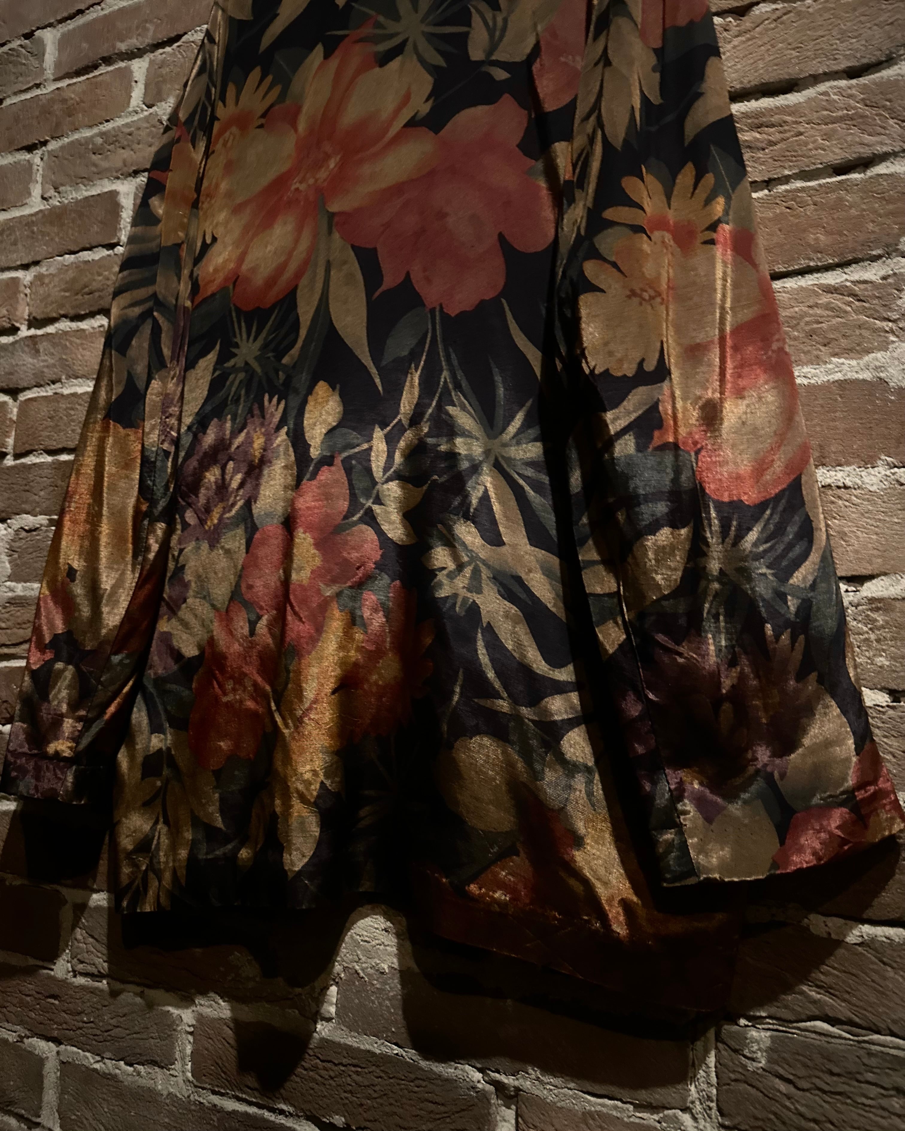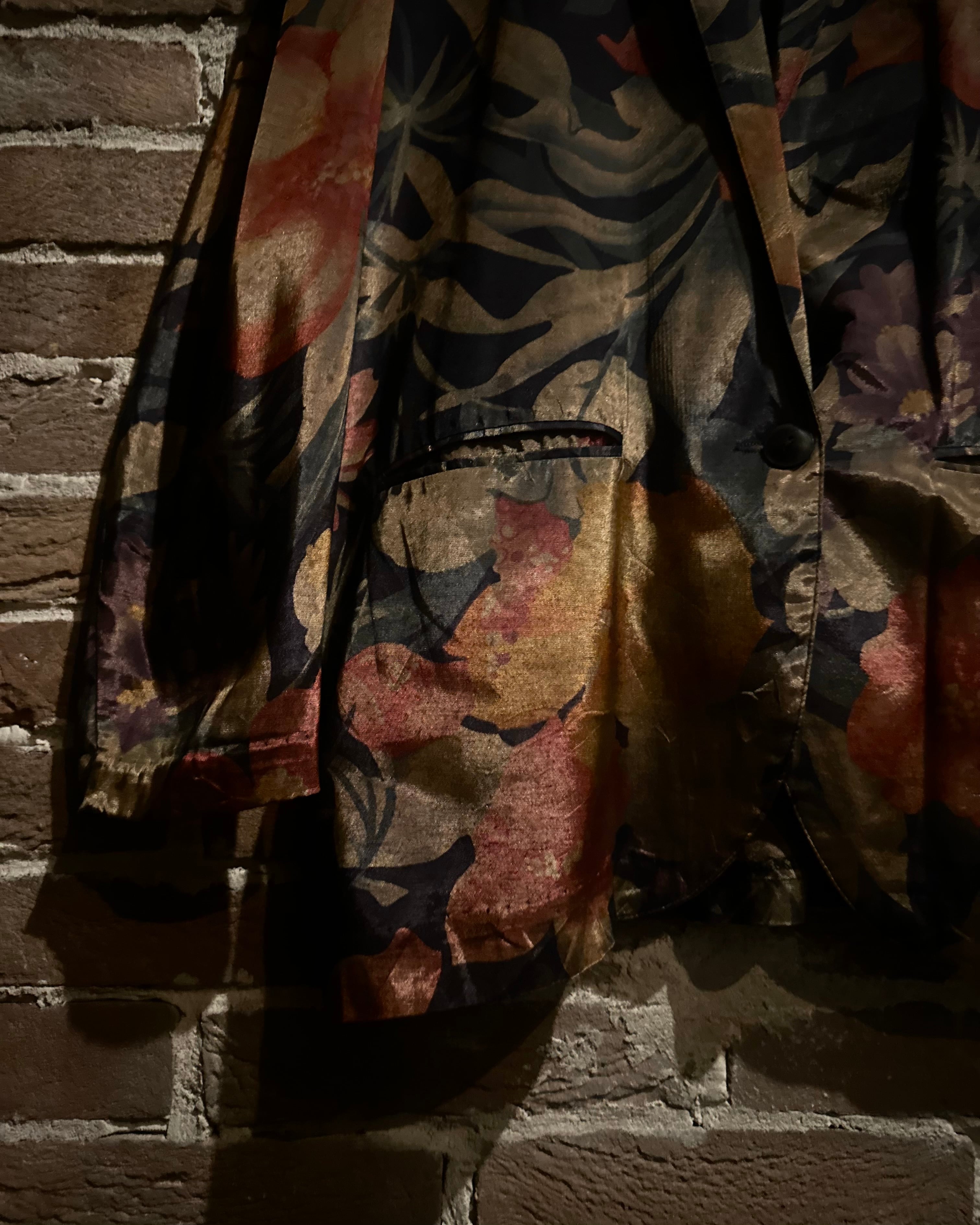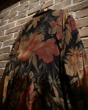 ボディはアセテート×レーヨン混の軽やかなファブリック。シルクのような艶を持ちながらも程よくハリがあり、光の角度で表情を変えるボタニカルパターンが印象的です。