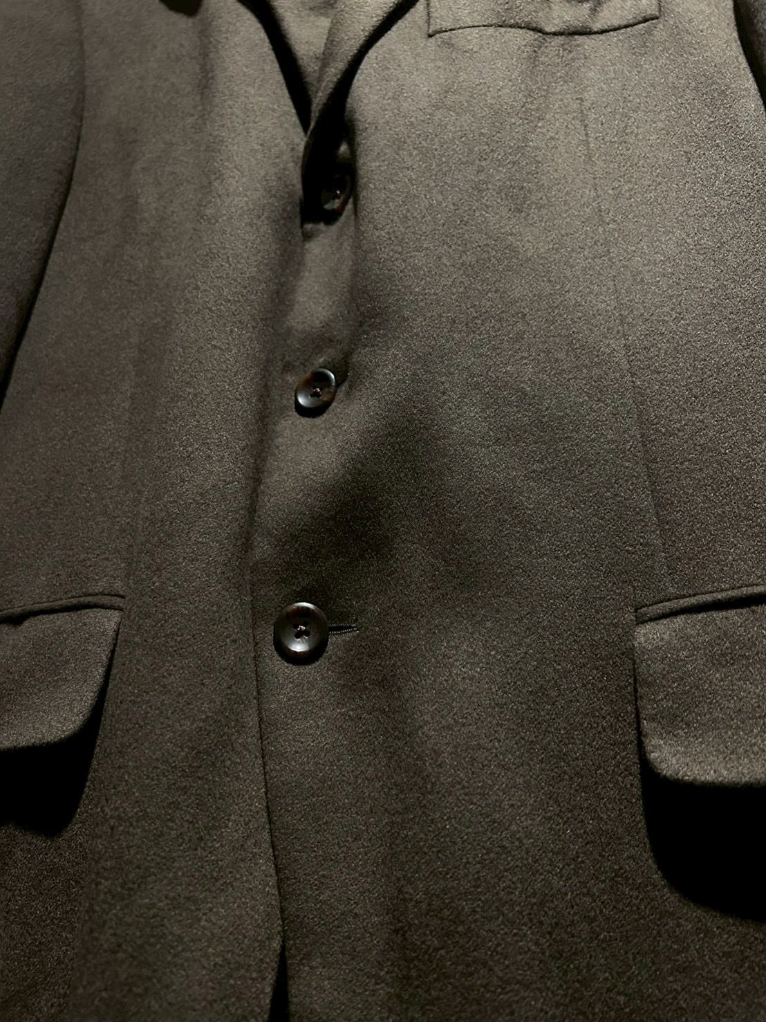 シルエットはクラシックな2ボタン仕様に構築的なショルダーライン。胸から裾にかけての柔らかなドレープが、素材の美しさを一層引き立てています。