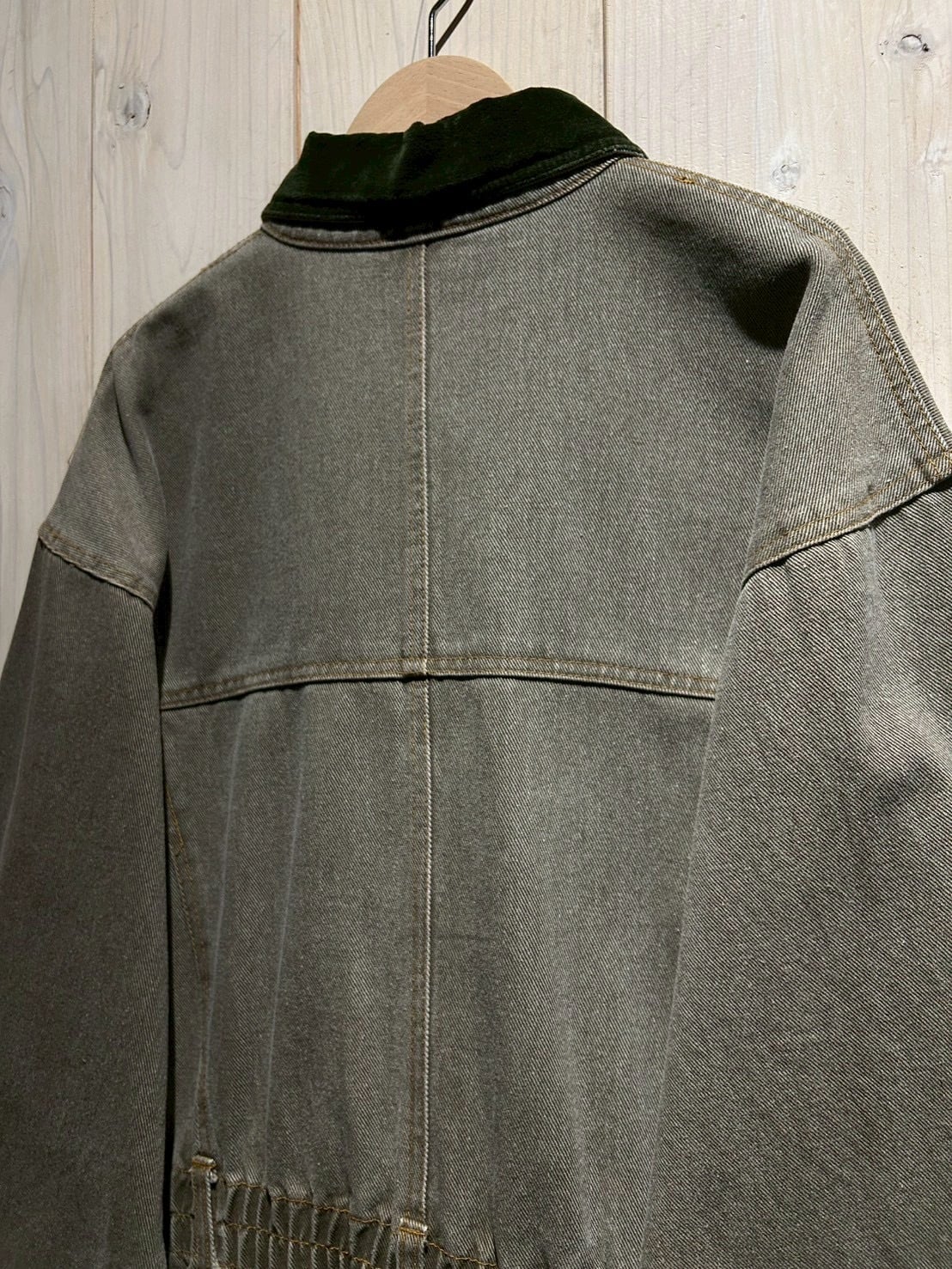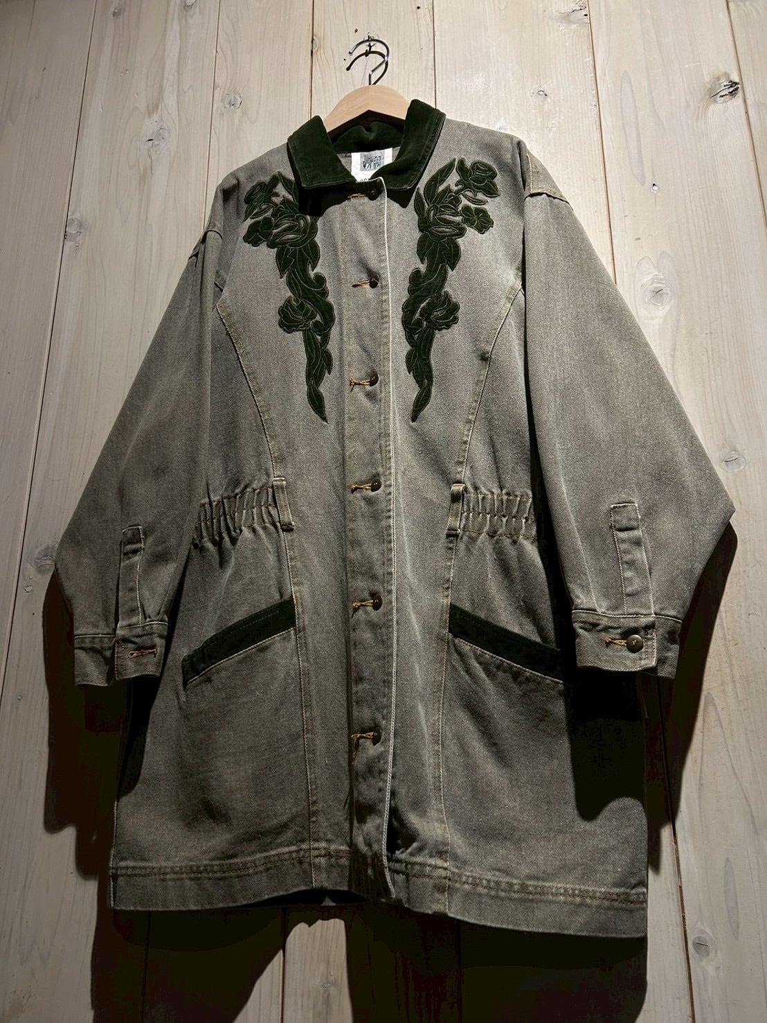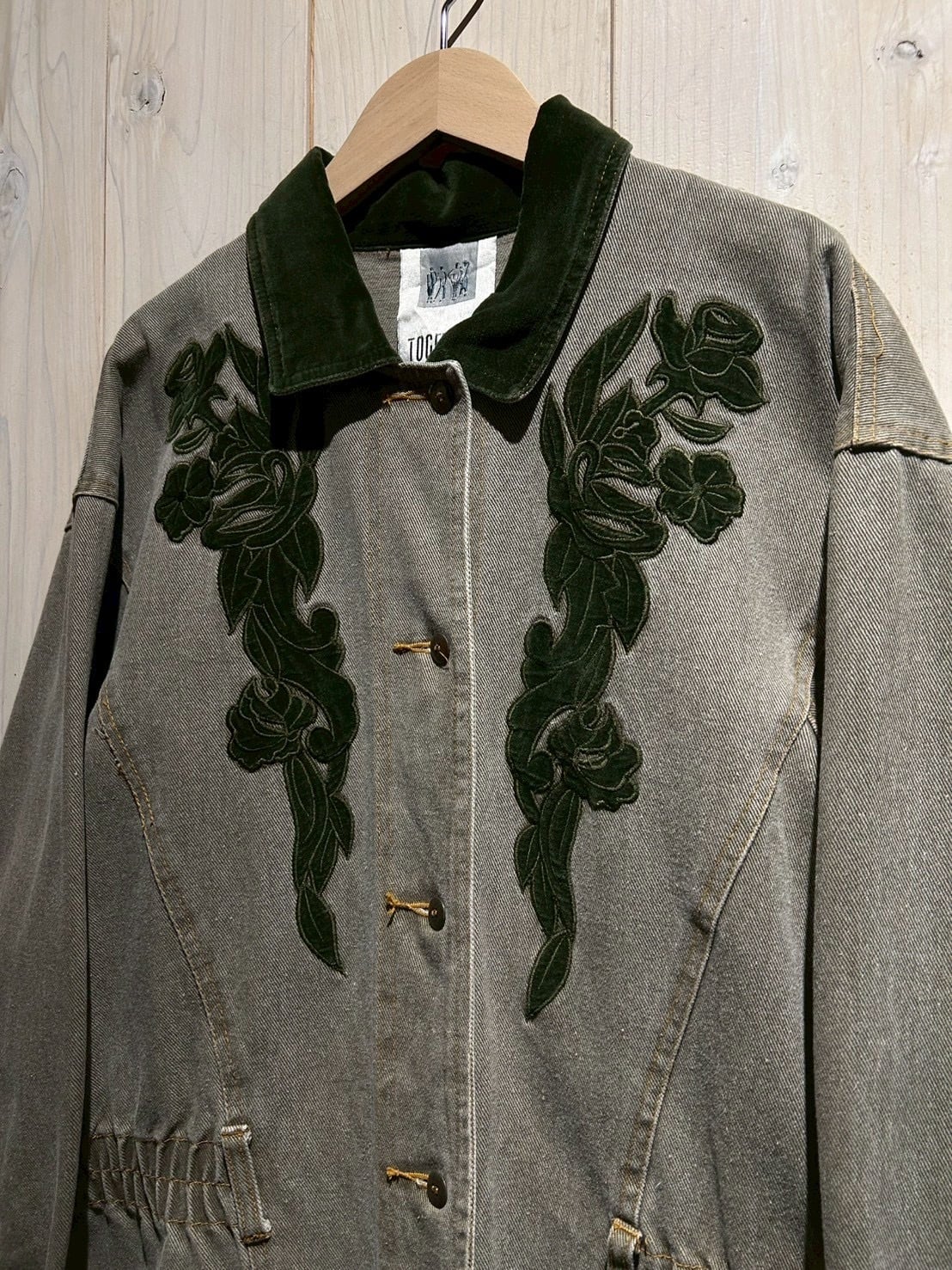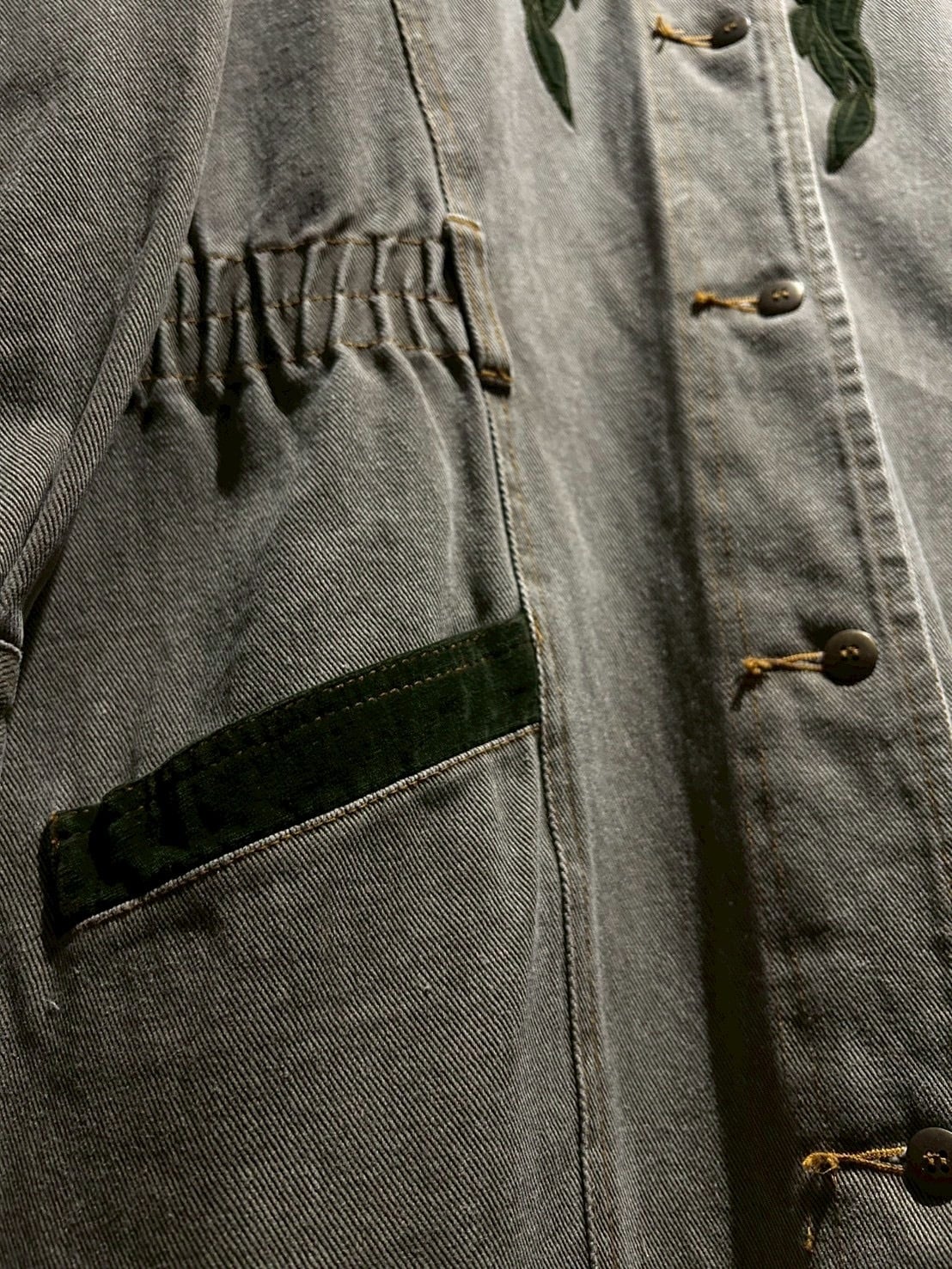 ボディには程よくフェードしたハリ・コシのあるデニム地を使用。襟とフロントには深みのあるカーキベロアを切り替え、上品な光沢と重厚感を纏ったフラワー刺繍を贅沢に配置。