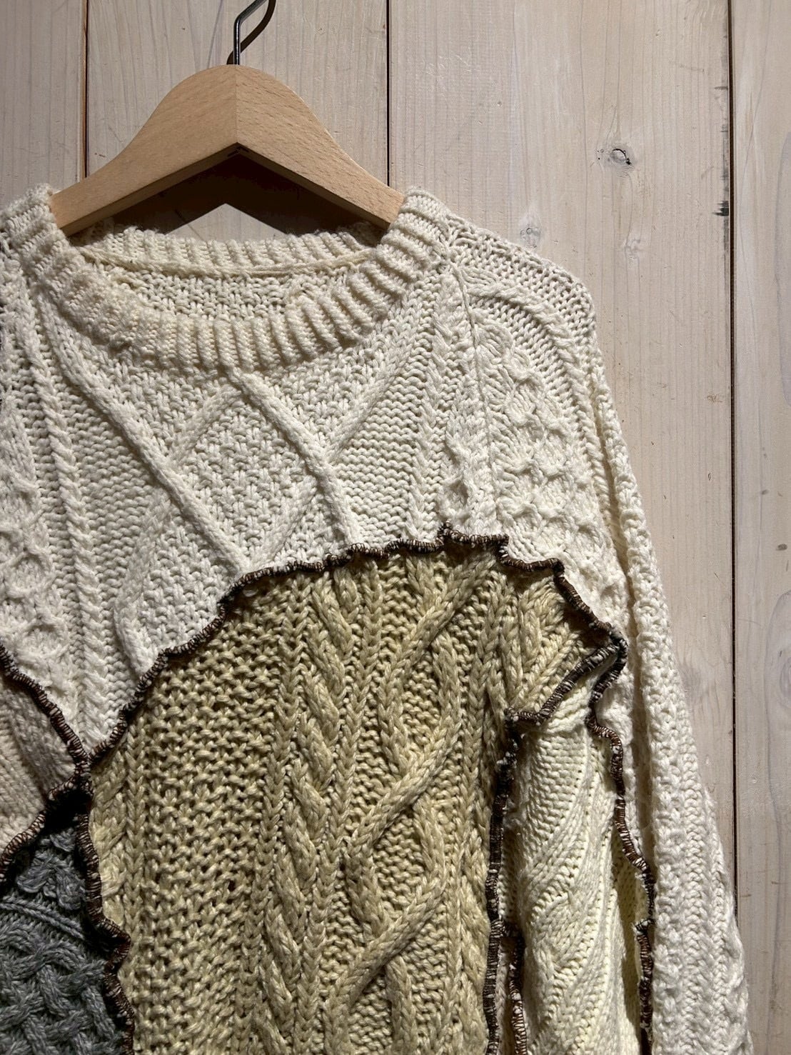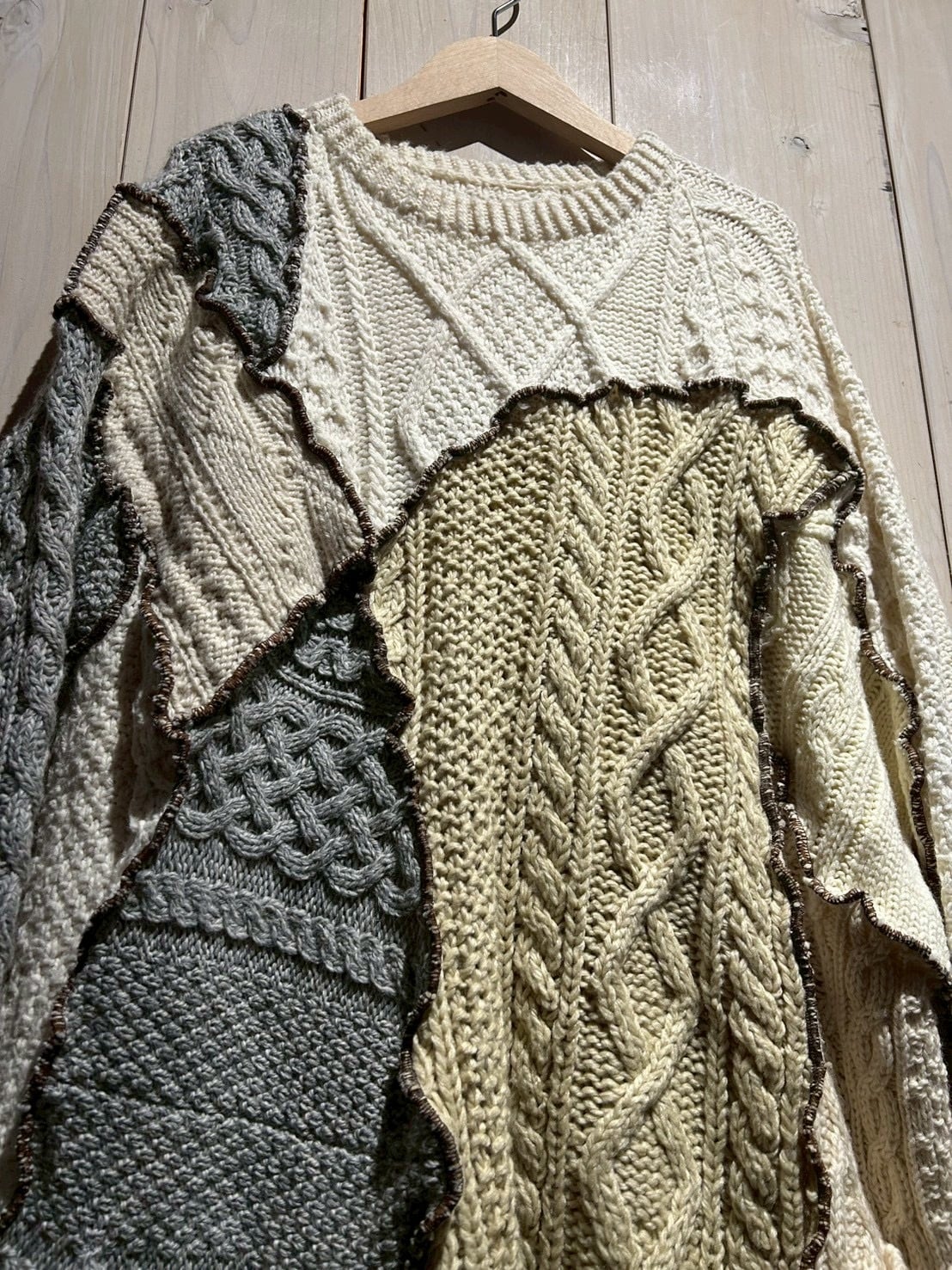 重厚な編み立てと温もりある表情が魅力の“フィッシャーマンニット”を大胆に再構築したリメイクパッチワークセーター。