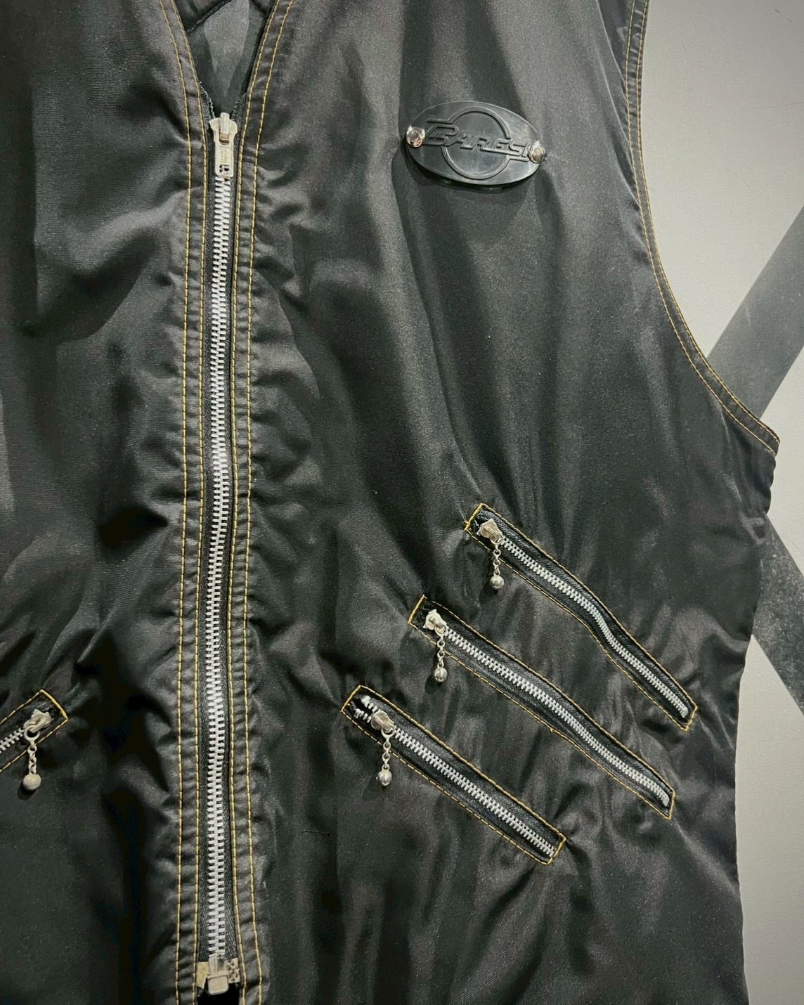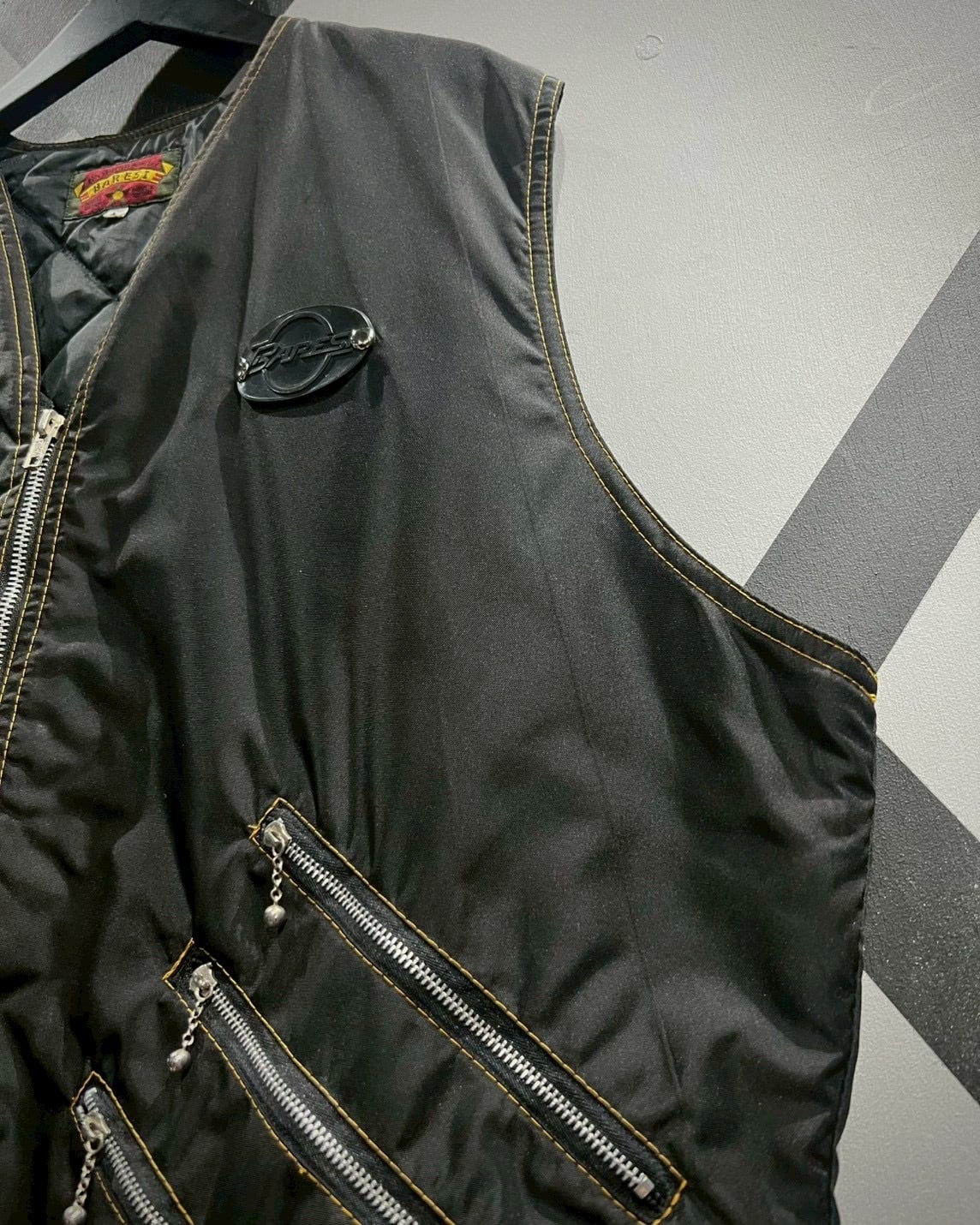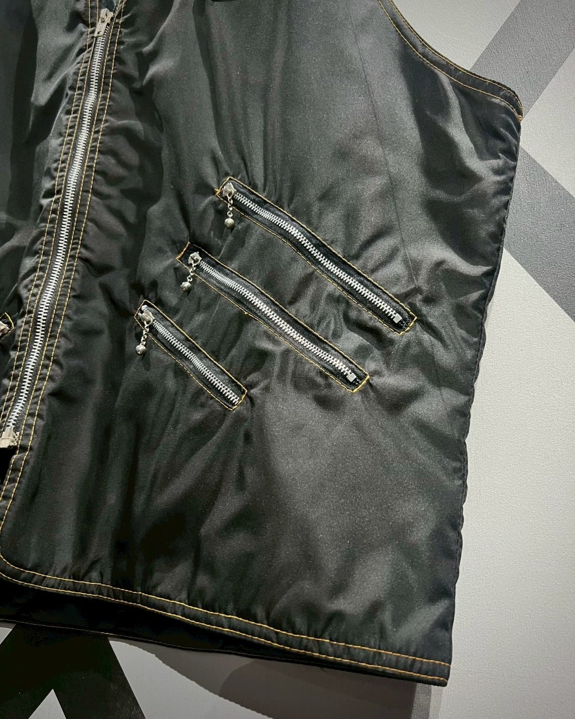 ハリのあるタフなブラックナイロンボディをベースに斜めに走るマルチジップを大胆にあしらった、当店らしい無骨でモードなベスト。