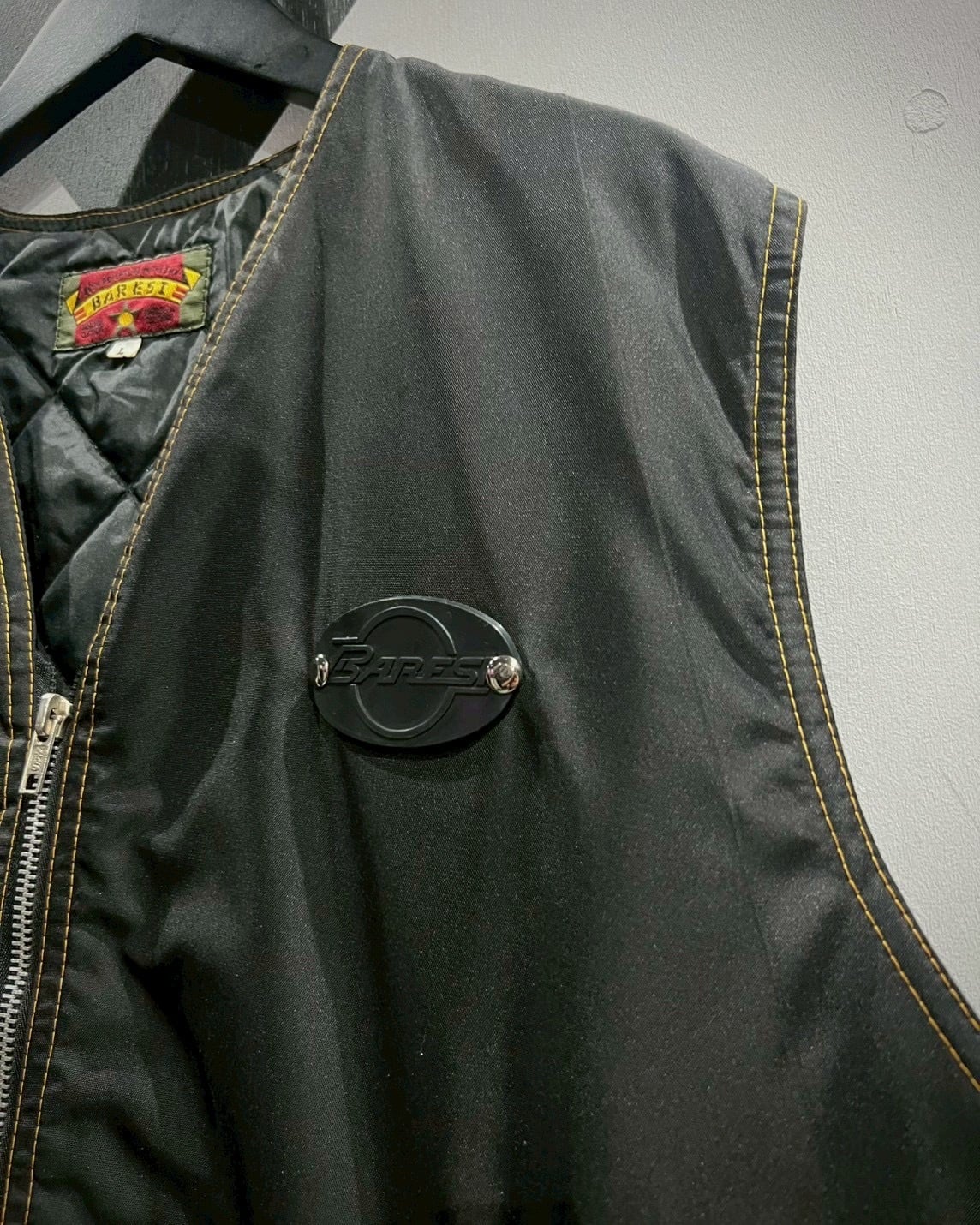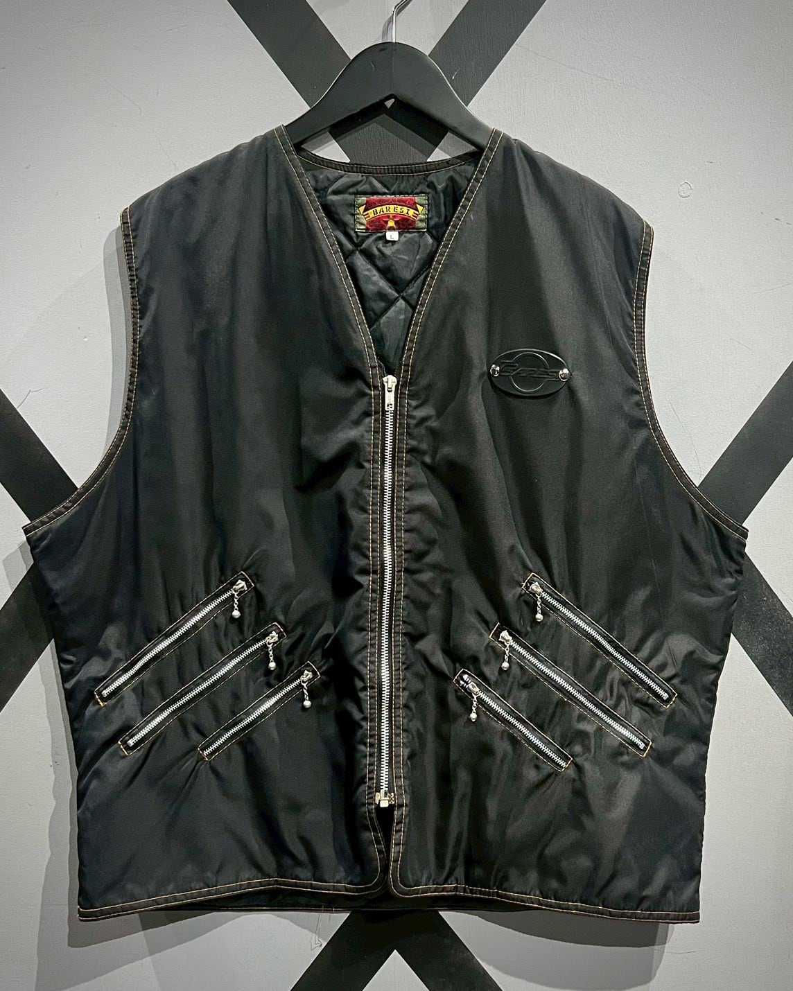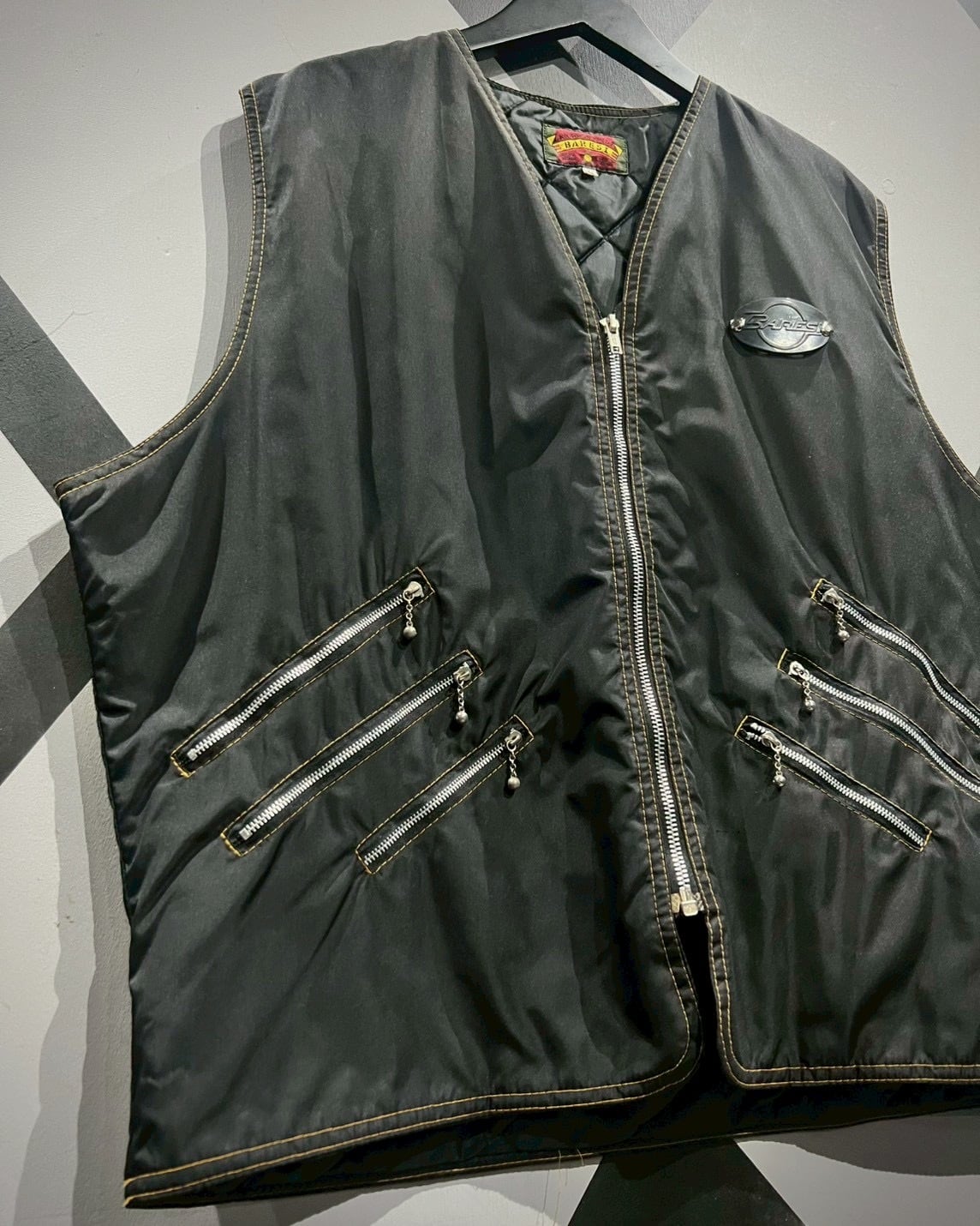 ハリのあるタフなブラックナイロンボディをベースに斜めに走るマルチジップを大胆にあしらった、当店らしい無骨でモードなベスト。